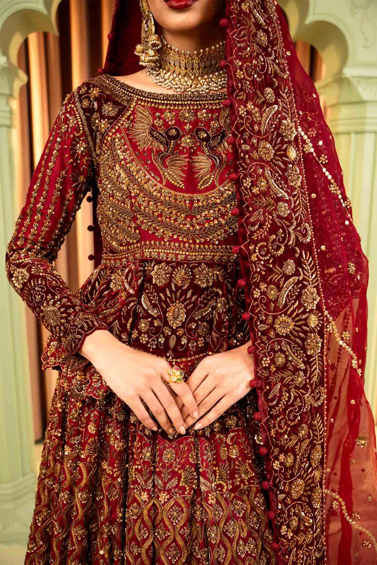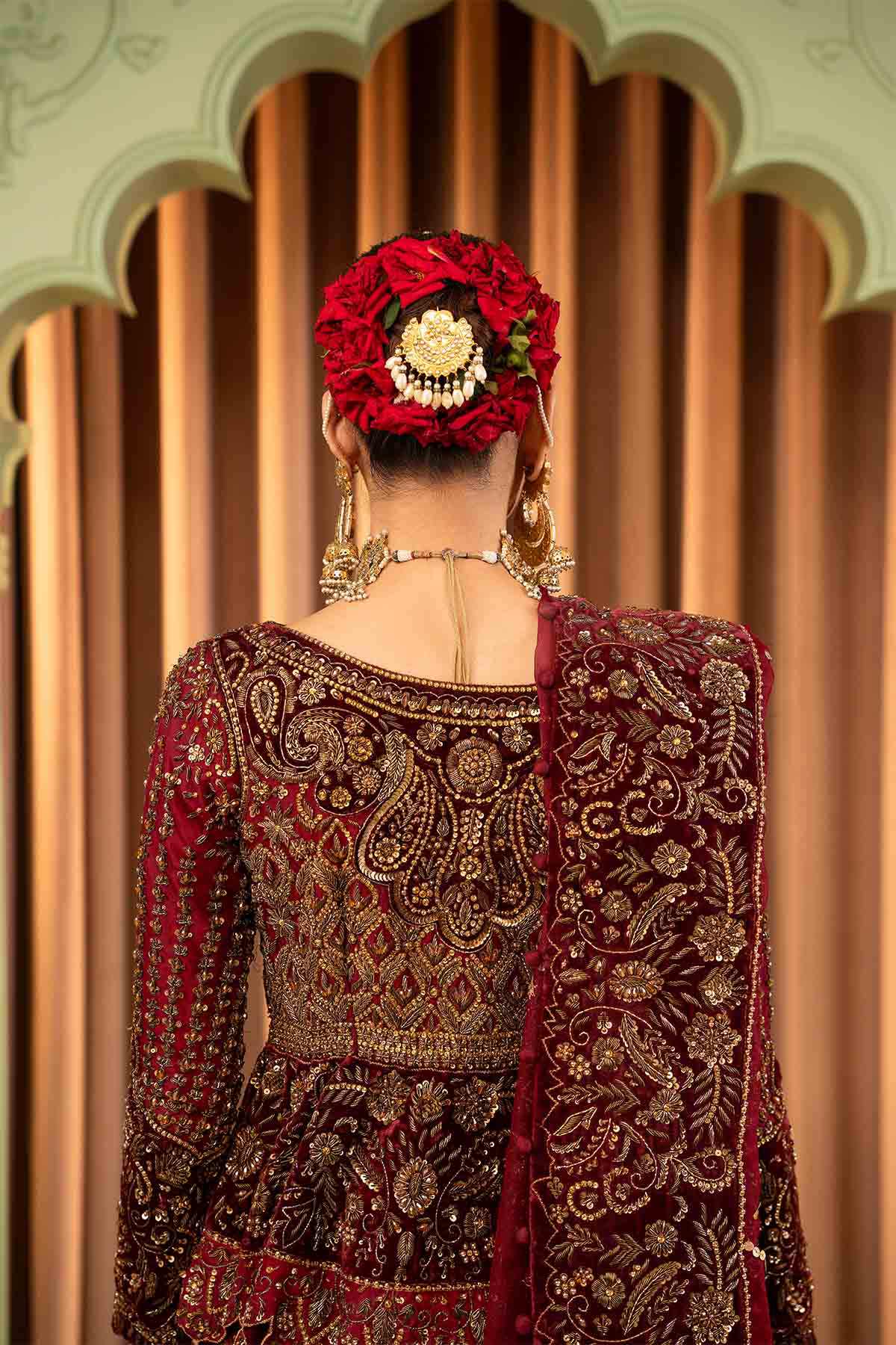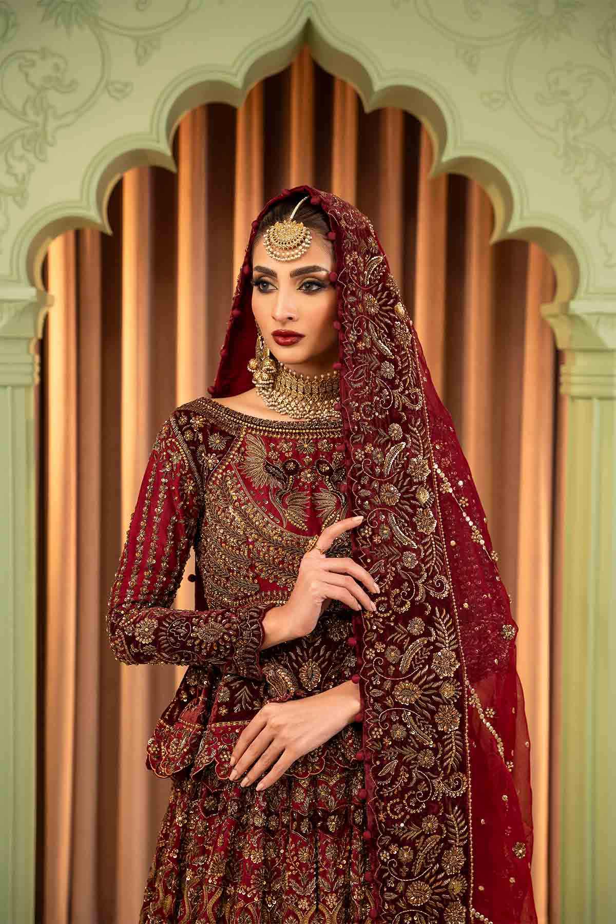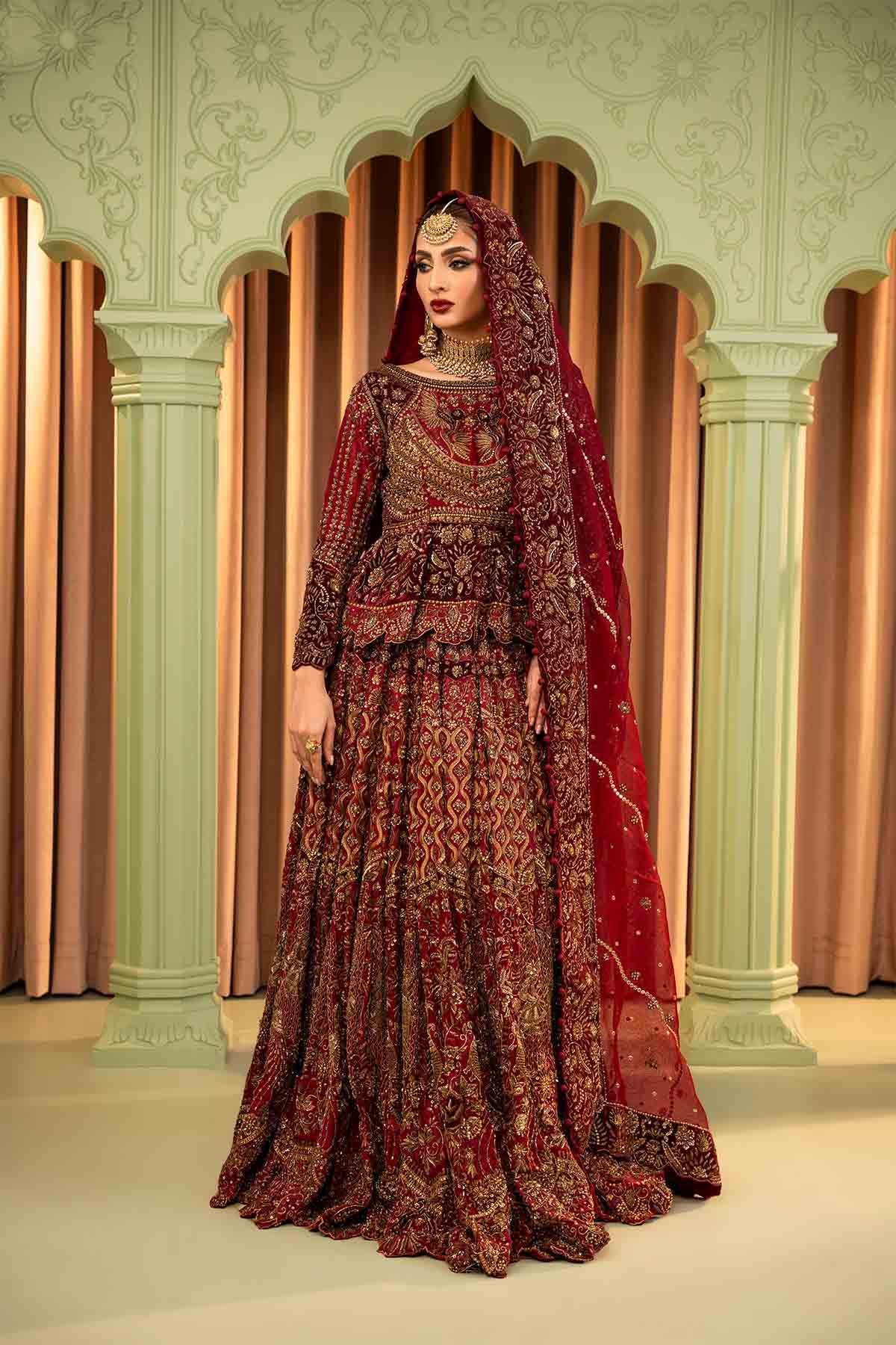 Exude Grandeur In This Deep Maroon And Royal Maroon Hued Peplum And Lengha Cut From Pure Rawsilk And Velvet, Featuring Floral And Peacock Motifs To Give It A Regal Look. Detailed Zardoze Work In A Dull Gold And Gold Composition. An Organza Net And Velvet Dupatta With Diagonal Lines, Scattered Motifs, Crystals, Stones Spray And Zardoze Worked Borders. The Composition Of The Embroidery Is Inspired By Mughal Gardens And Geometric Patterns Containing Motifs Like, Mughal Figures And Peacock. Peacock Is The Focal Point Of This Whole Composition It Pops Up Through Out The Design.