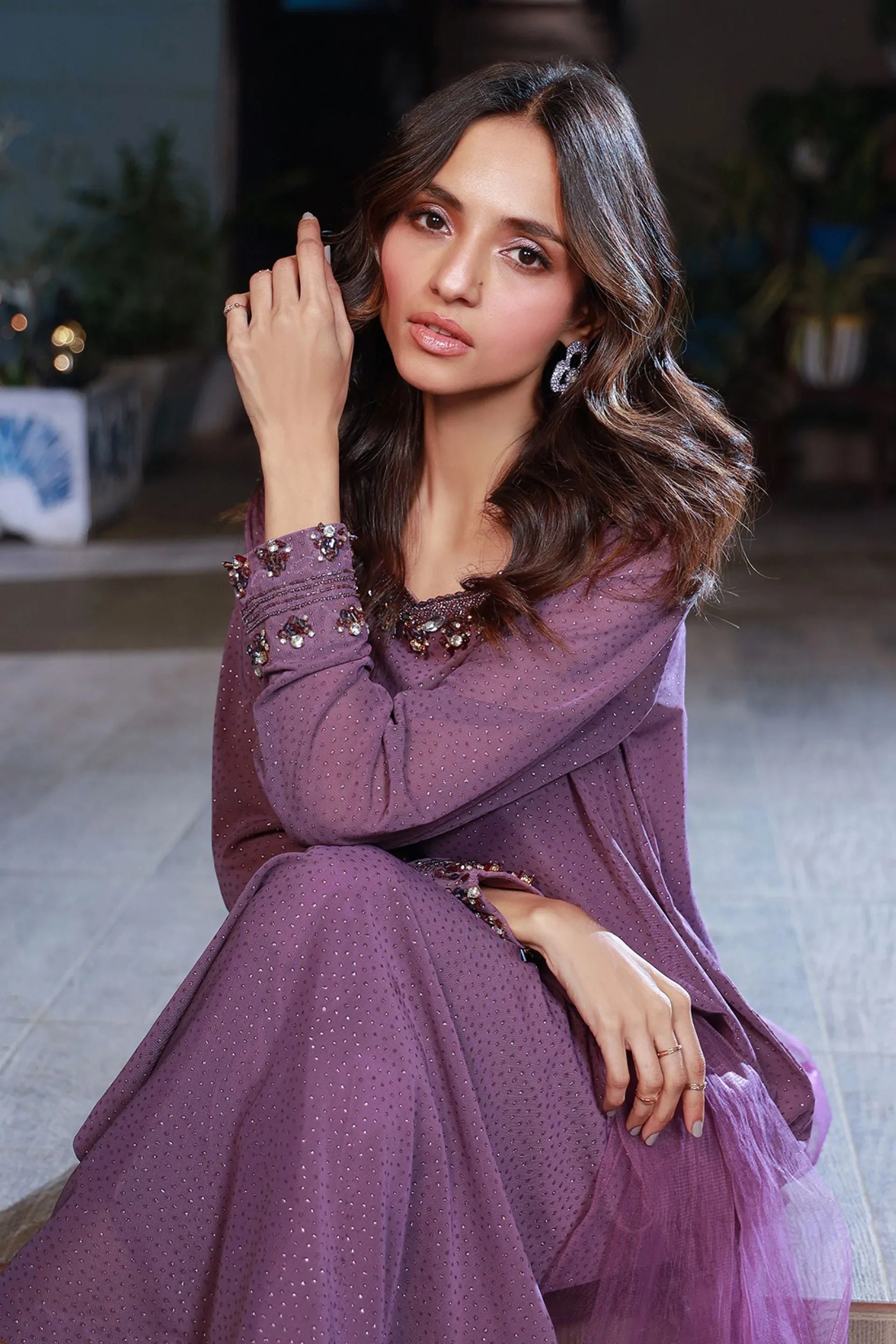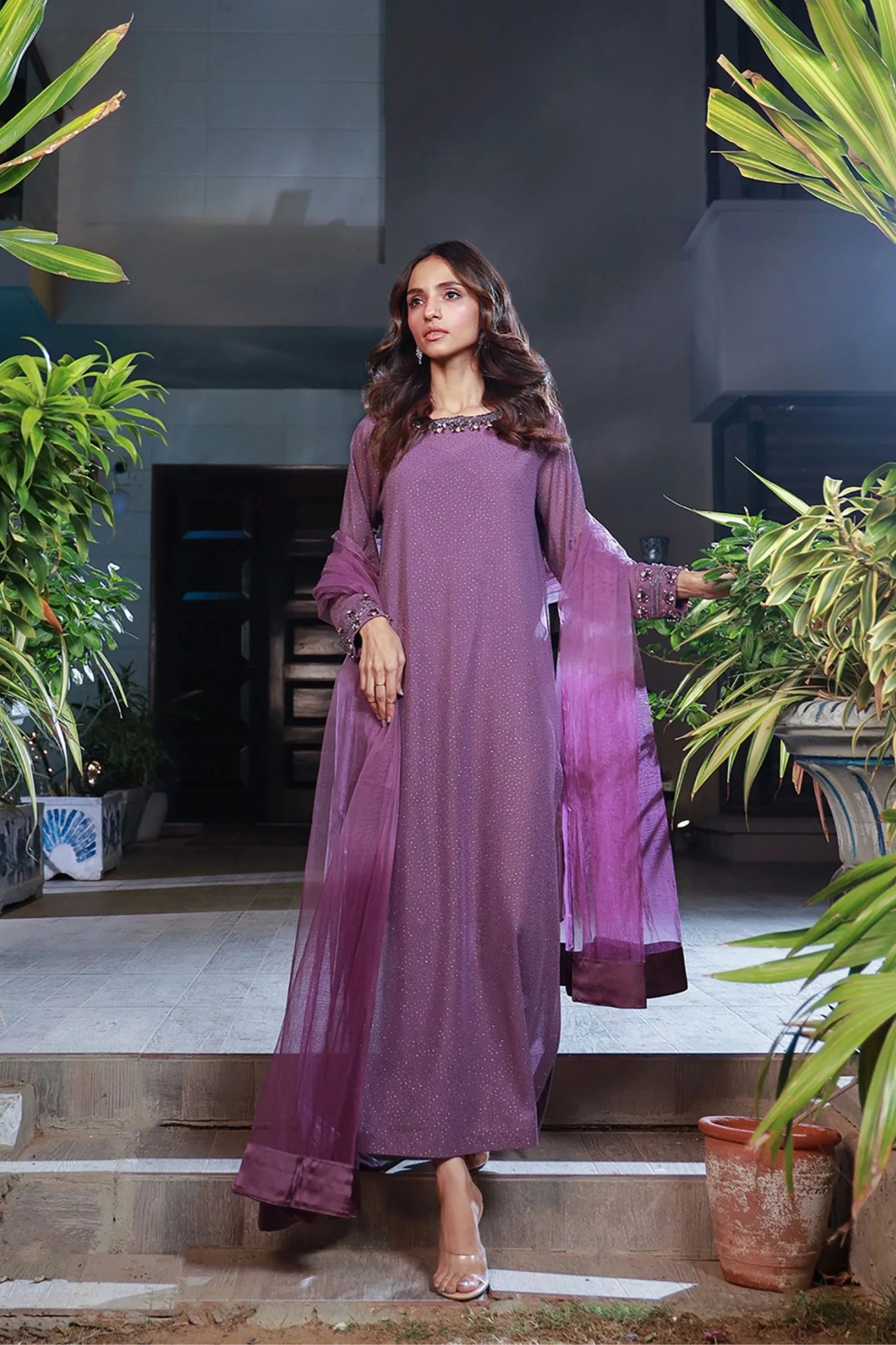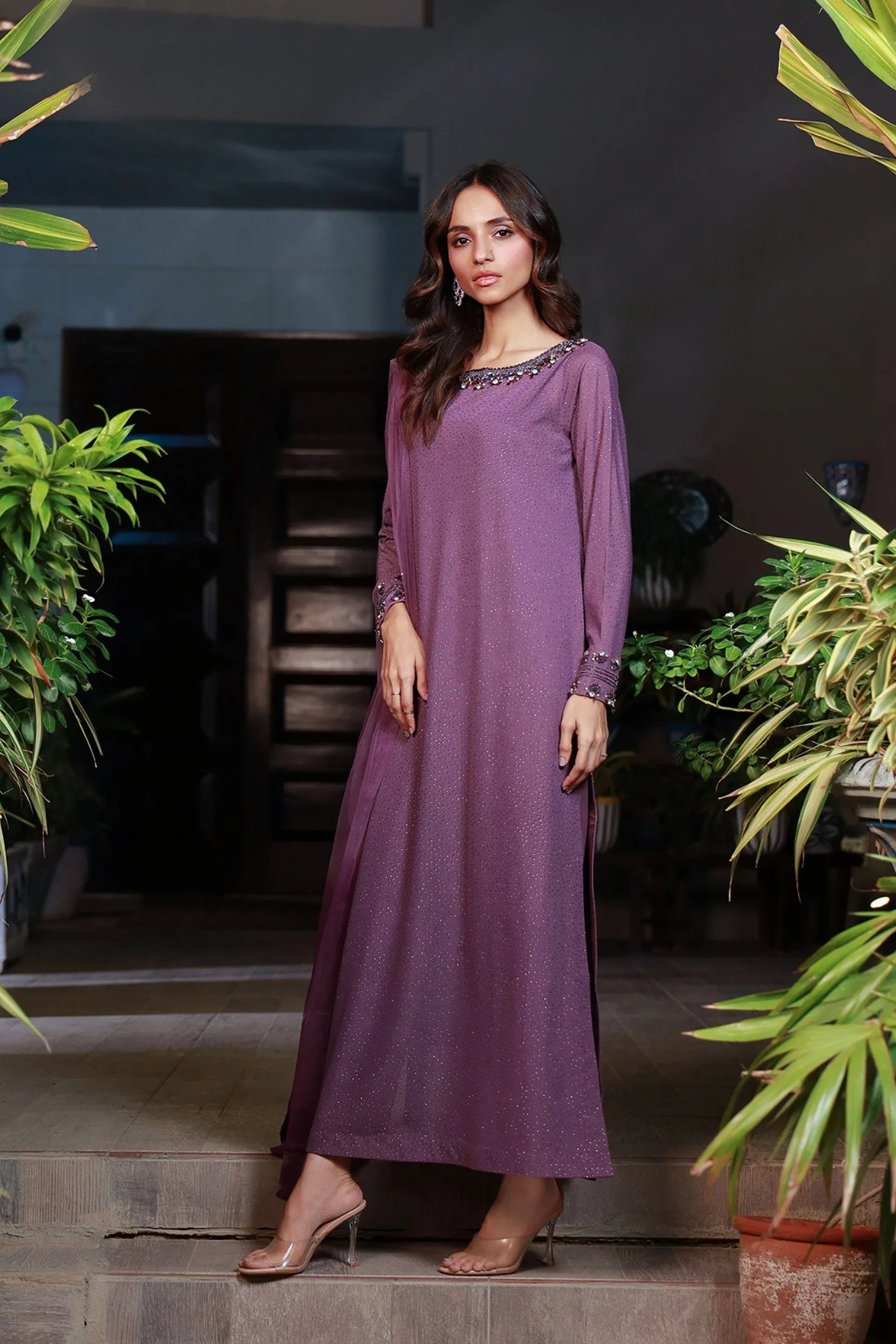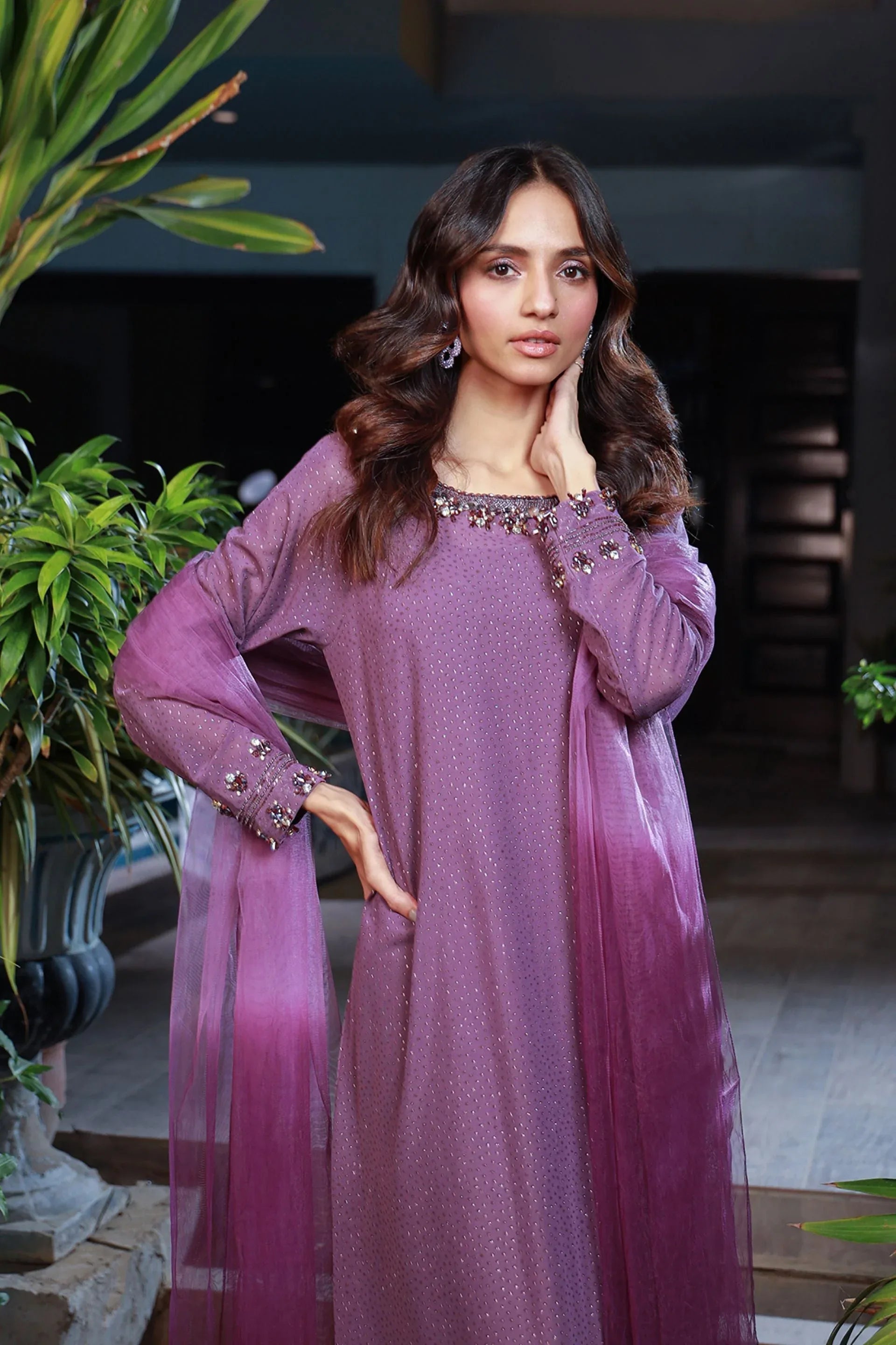 Presenting Lavender Dreams Hand-Embroidered Set that are glamorous pieces of wear and unique art form. This lovely attire includes a stunning lavender color dress, which also has hand-made works on it. Made with an incredibly comfortable, smooth, and easy-to-wear cotton jersey and further details with delicate velour insets, this piece can be worn on any occasion.
