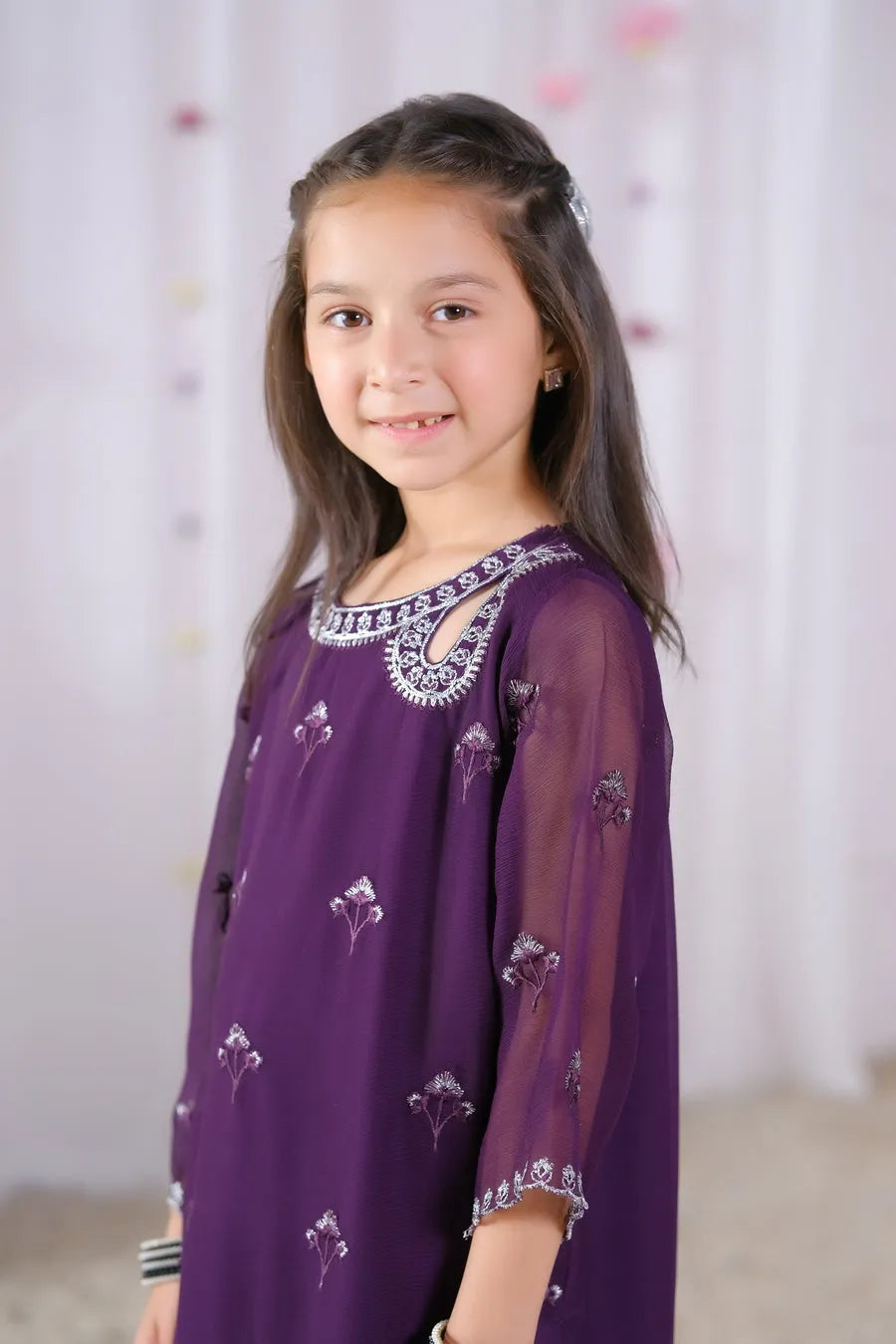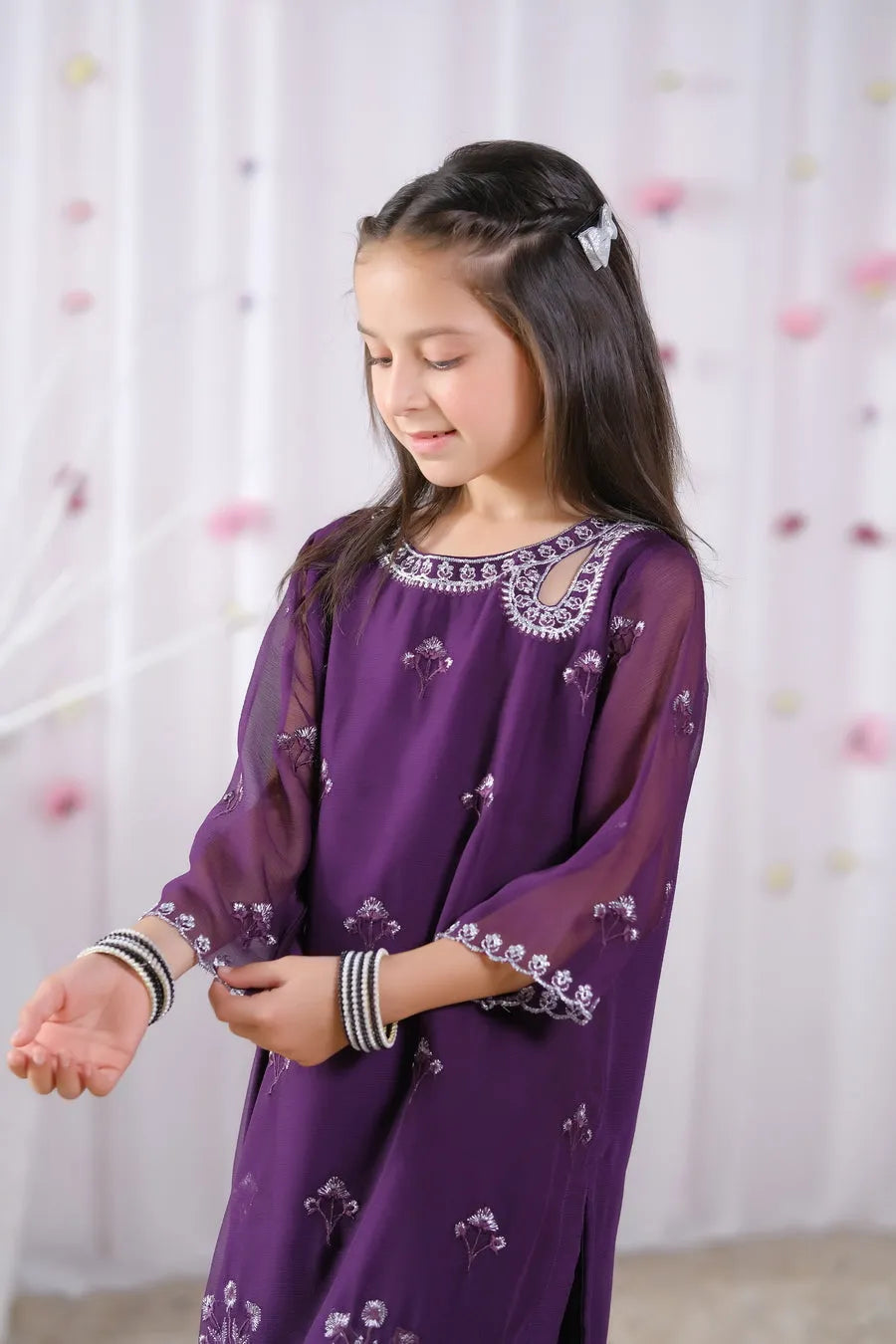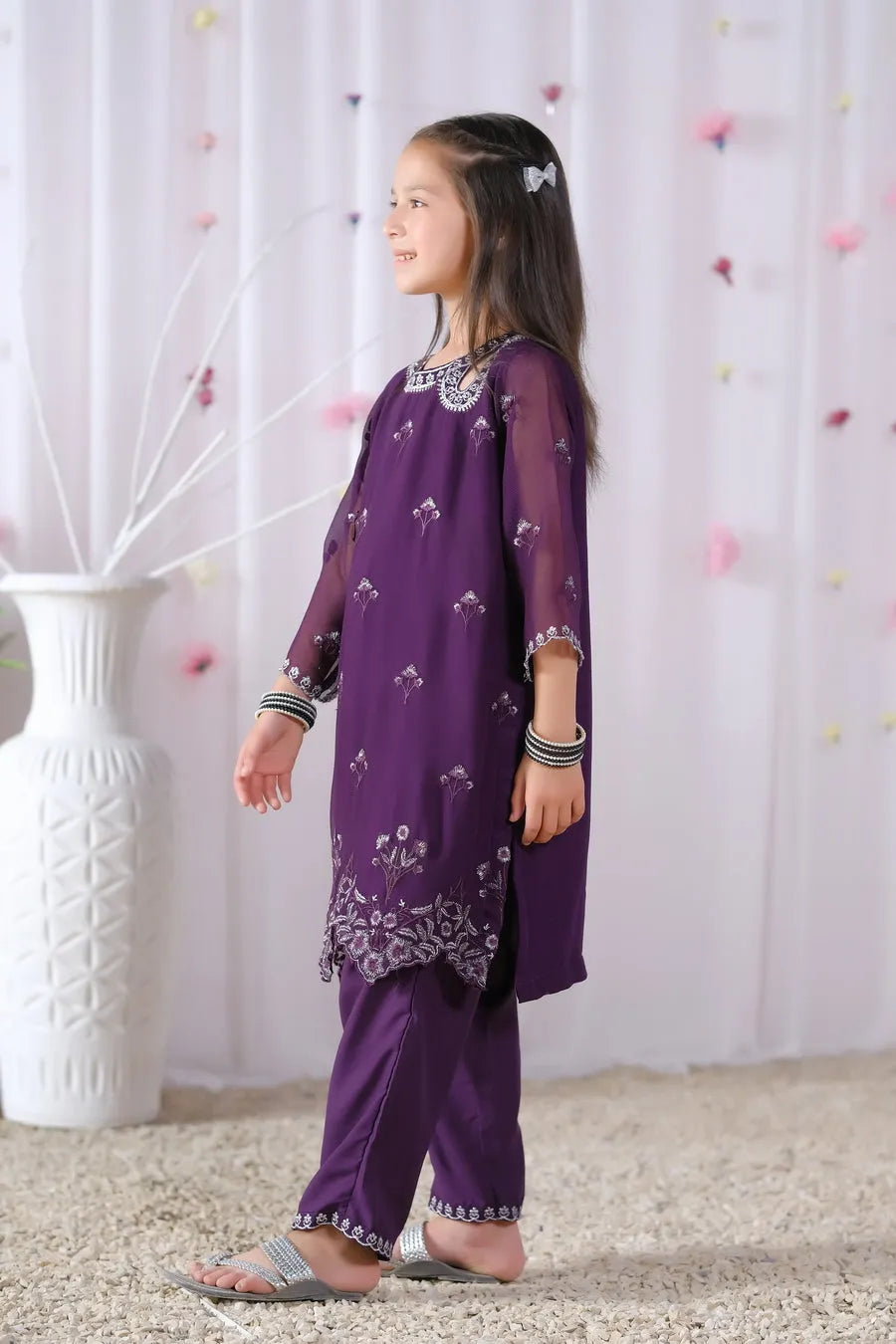 Introducing "Layla," an enchanting purple two-piece outfit for girls that epitomizes elegance. The knee-length top, adorned with delicate silver embroidery and a scalloped hemline, exudes grace and charm. Paired with straight pants, this ensemble offers timeless sophistication, perfect for your little princess to shine with poise and grace at any occasion.