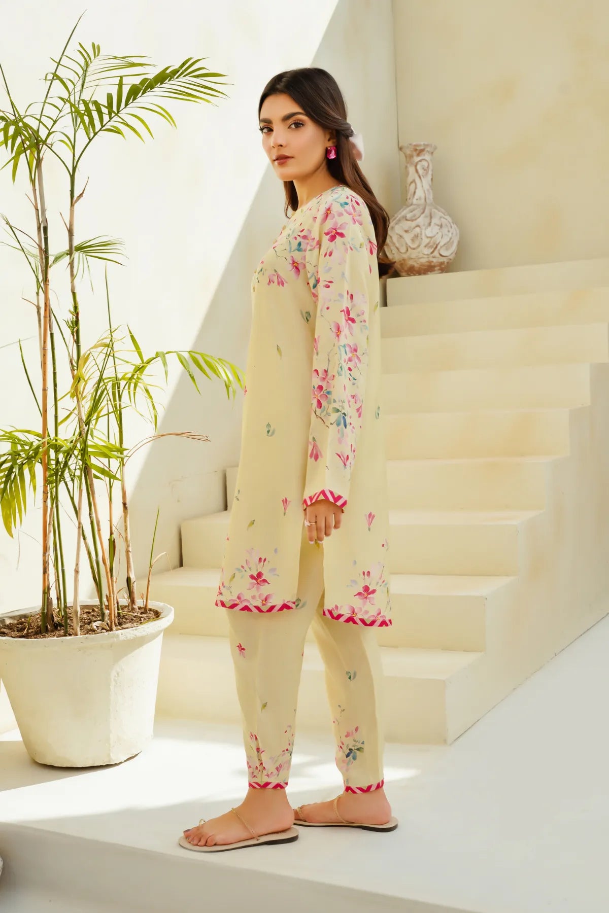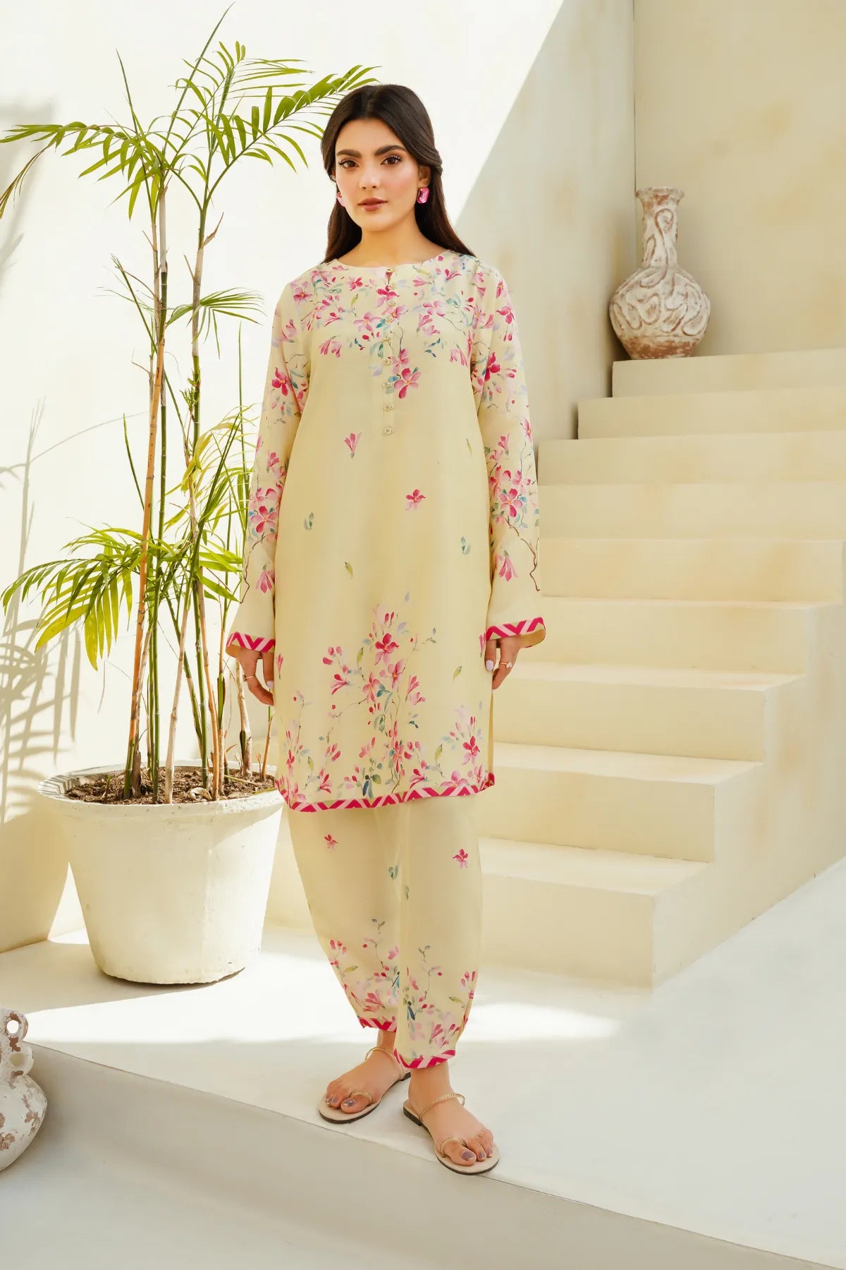 Design: Straight-cut kurta with floral print and contrast detailing along the cuffs and hemline