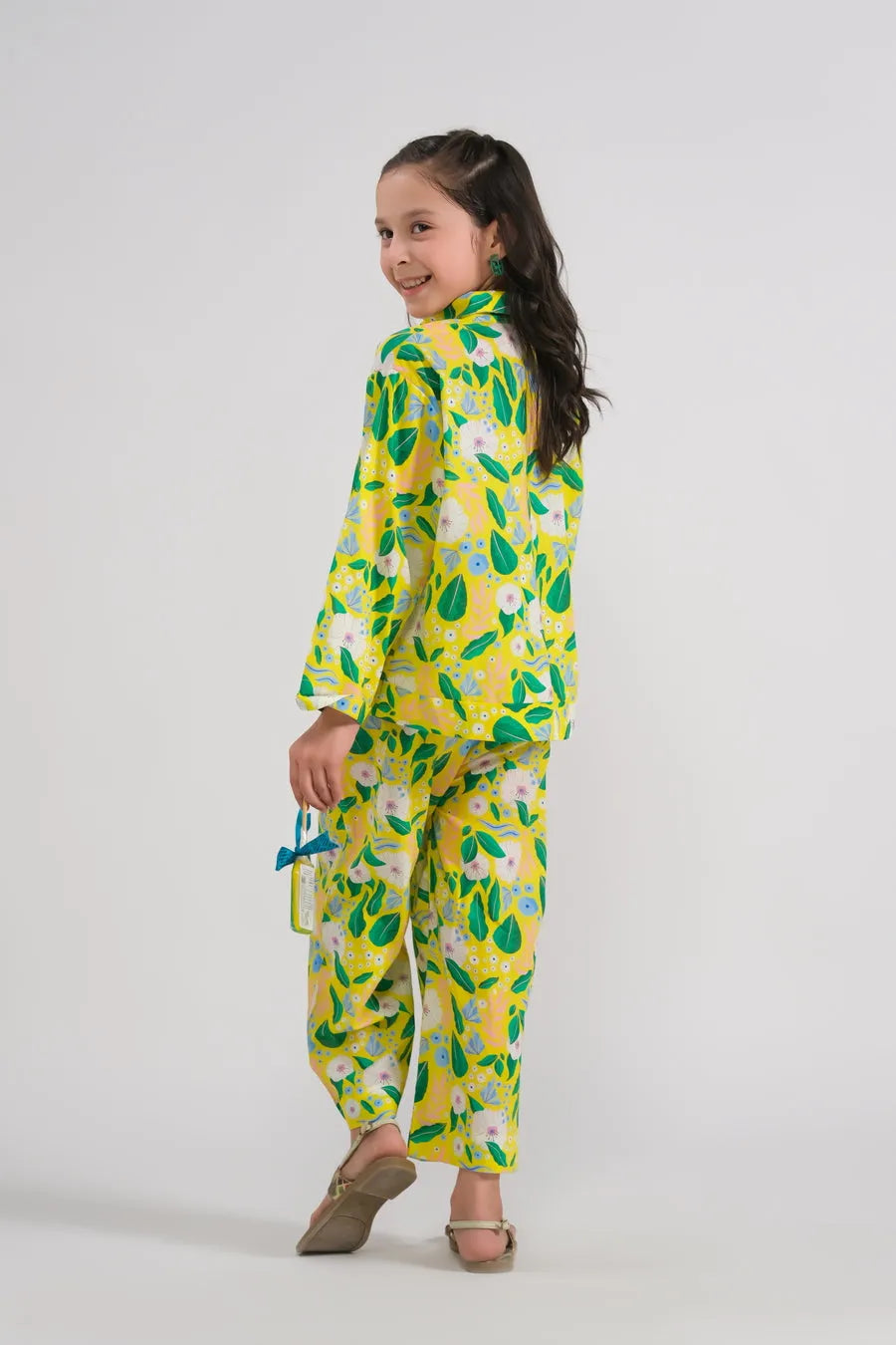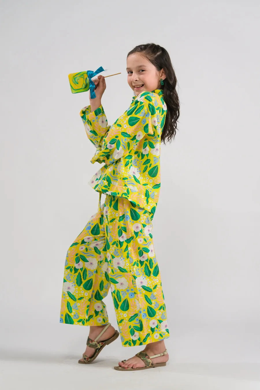 Brighten your wardrobe with this cheerful yellow and green floral set, inspired by springtime freshness. The breezy button-up top and relaxed pants create a fun yet comfortable ensemble, perfect for picnics, outdoor adventures, and sunny excursions.