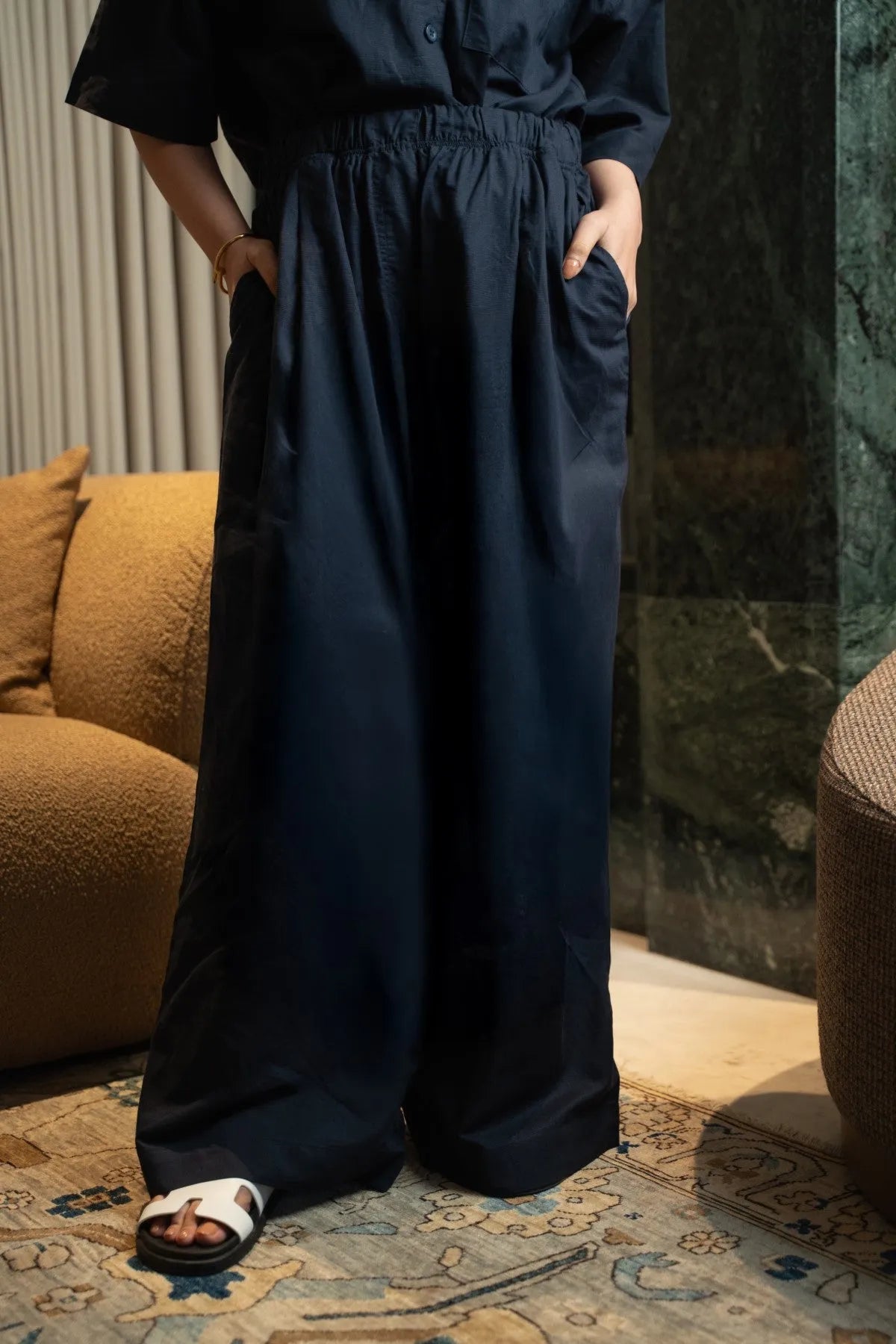 Cotton/Linen Loose Fit Trousers Designed for both comfort and style, these black cotton and linen blend trousers feature a wide-leg cut that moves effortlessly with you. Lightweight and breathable, they’re perfect for staying cool on warmer days. Pair them with the matching button-down shirt for a sleek, coordinated look, or mix them with your favorite casual tops for versatile styling.