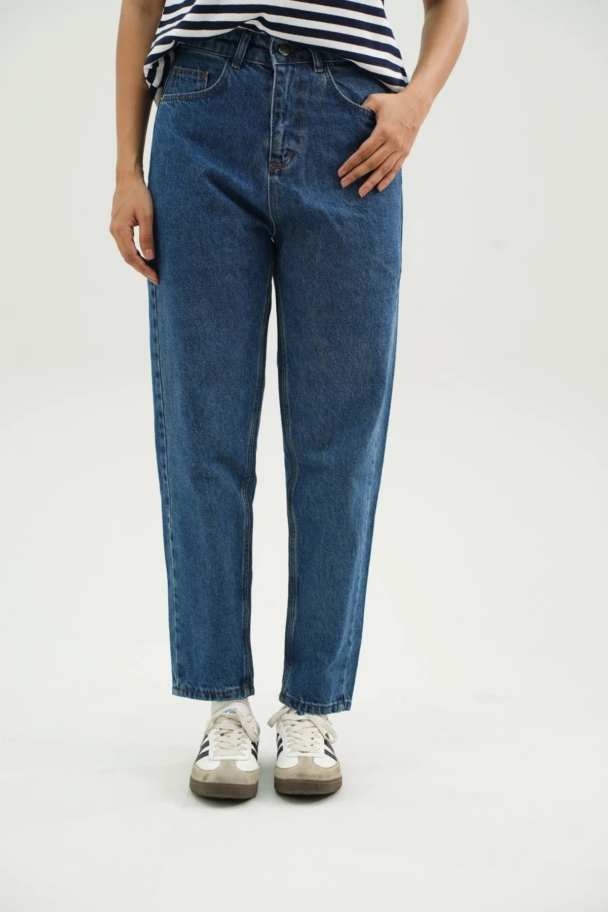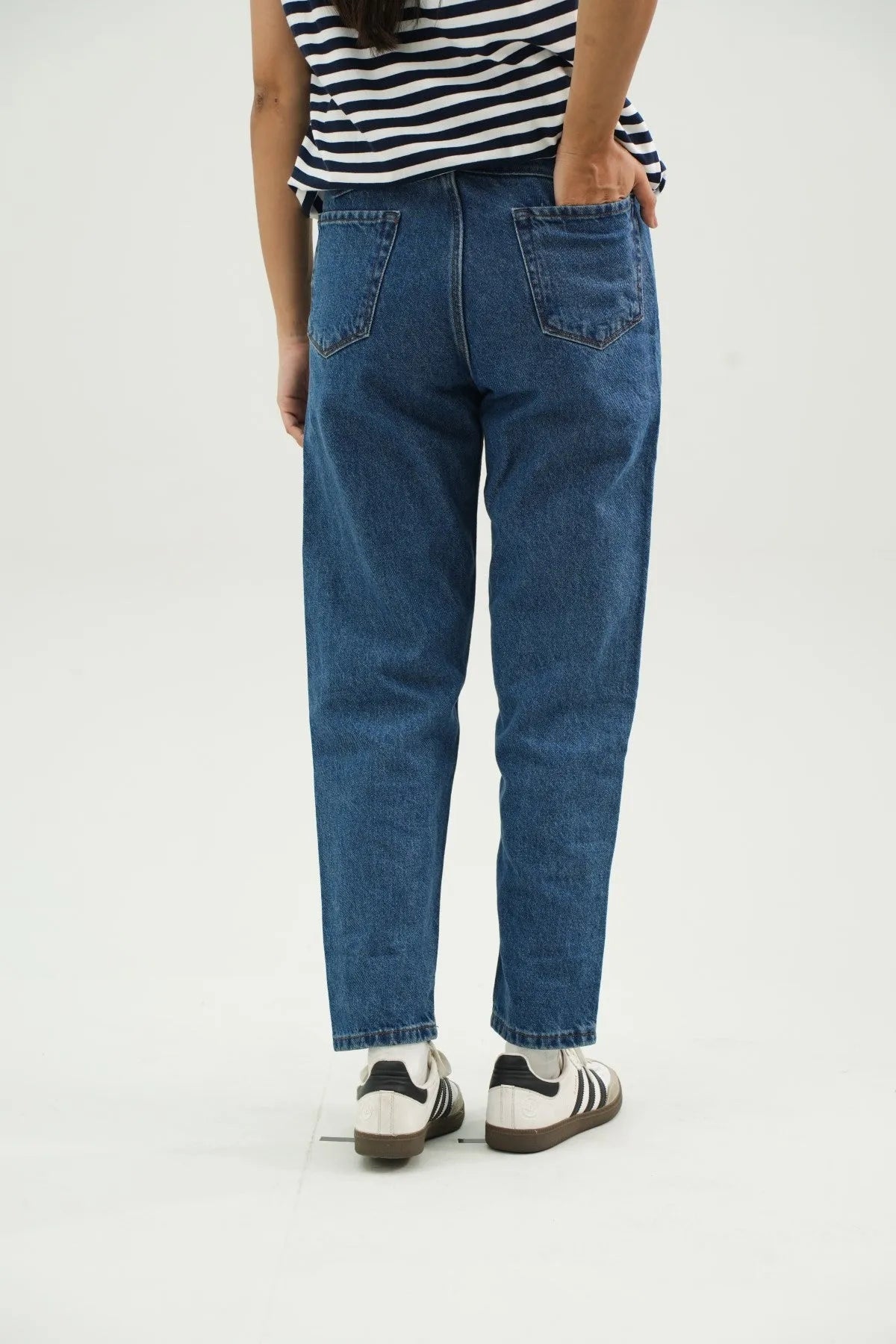 An essential in classic blue denim. Crafted for both style and comfort, these jeans feature a medium wash for a versatile look. With two front and two back pockets, they offer both functionality and style. The buckle detailing at the waistband allows you to customize the fit, ensuring a flattering silhouette.