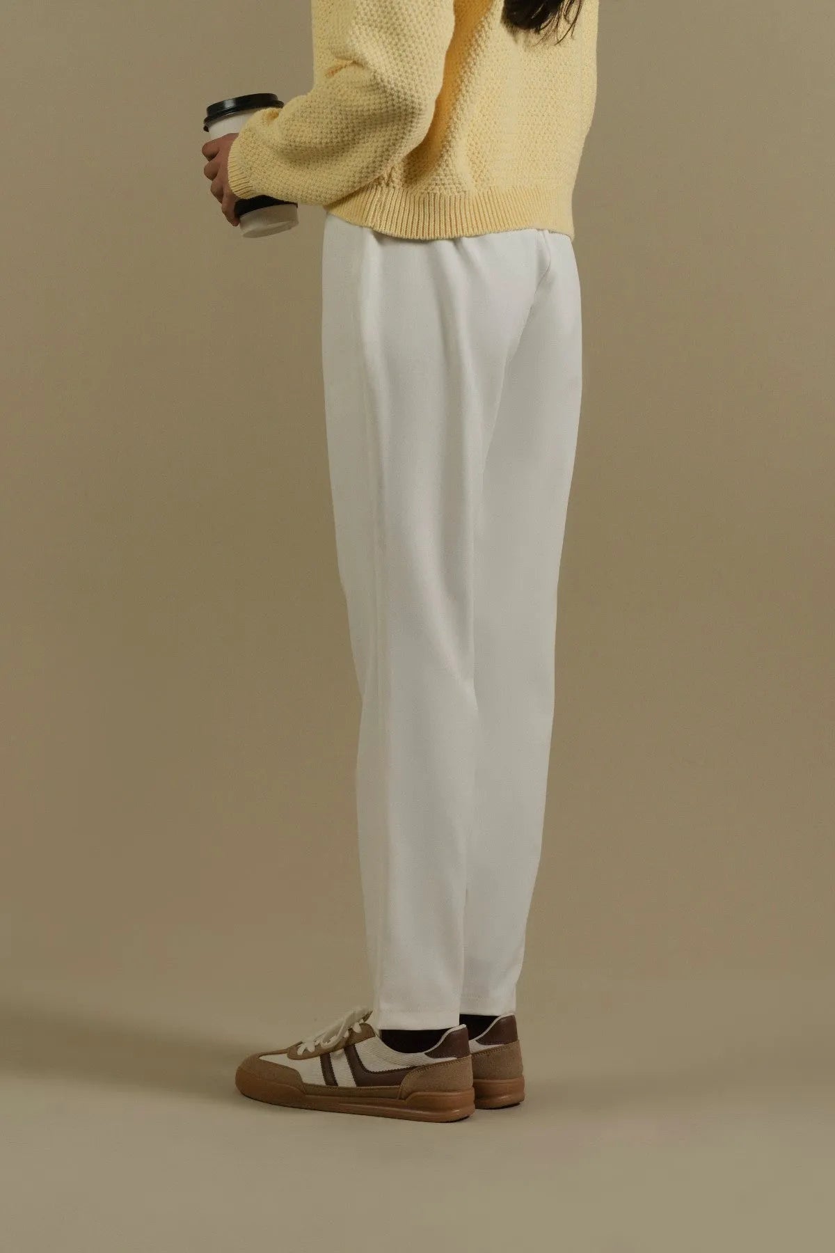 A sleek and versatile addition to your wardrobe in crisp white. Crafted from stretchy fabric, these trousers offer both comfort and style with their straight legs and streamlined silhouette. With no openings, they provide a clean and polished look suitable for various occasions.