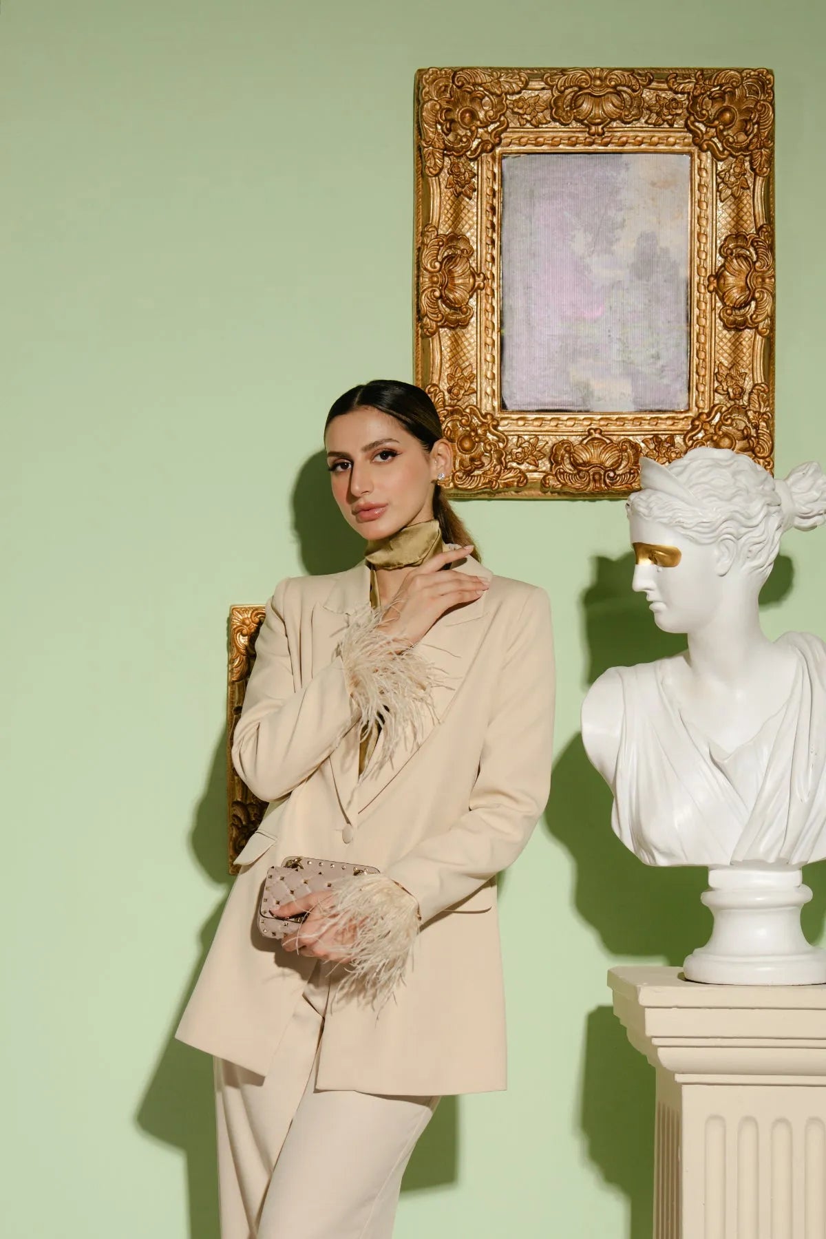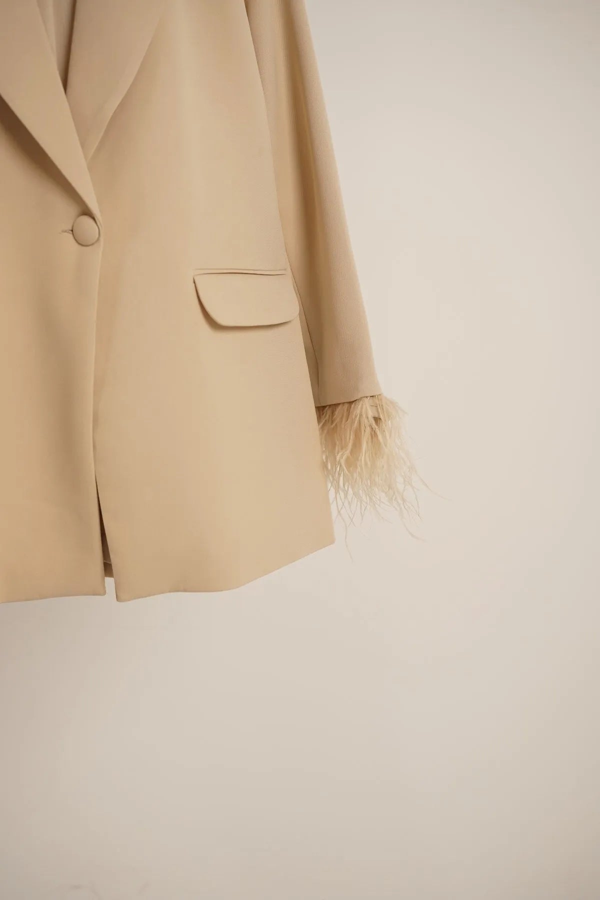 Licci's Blazer with Feather Cuffs – a captivating twist on a classic silhouette. Crafted in a timeless black, this blazer features sleek lapels for a polished look. The removable feather cuffs add a touch of whimsy, allowing you to customize your style effortlessly.