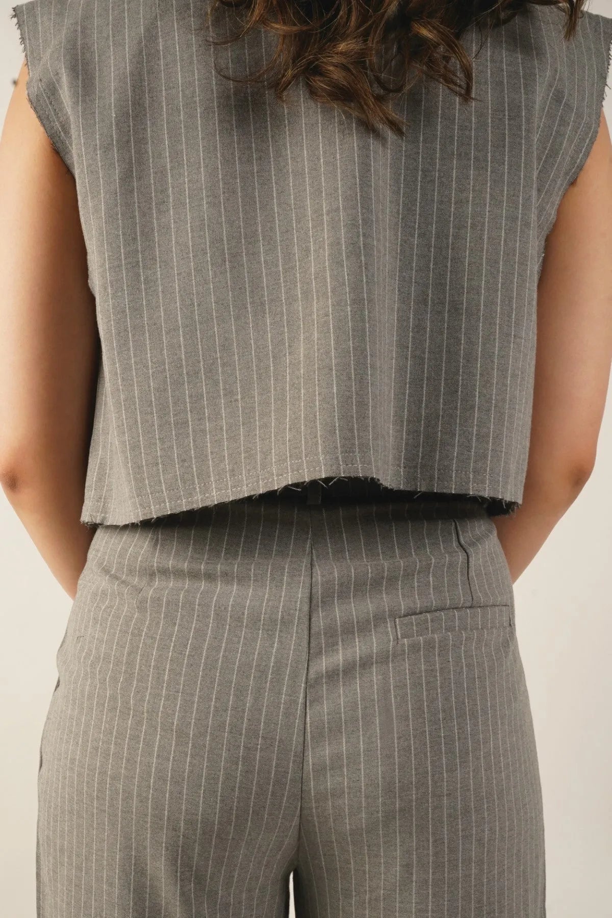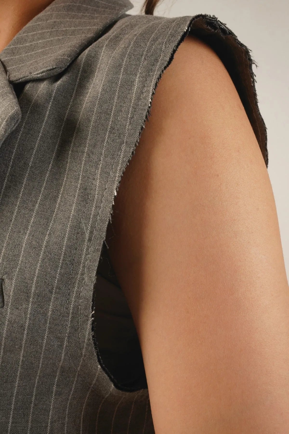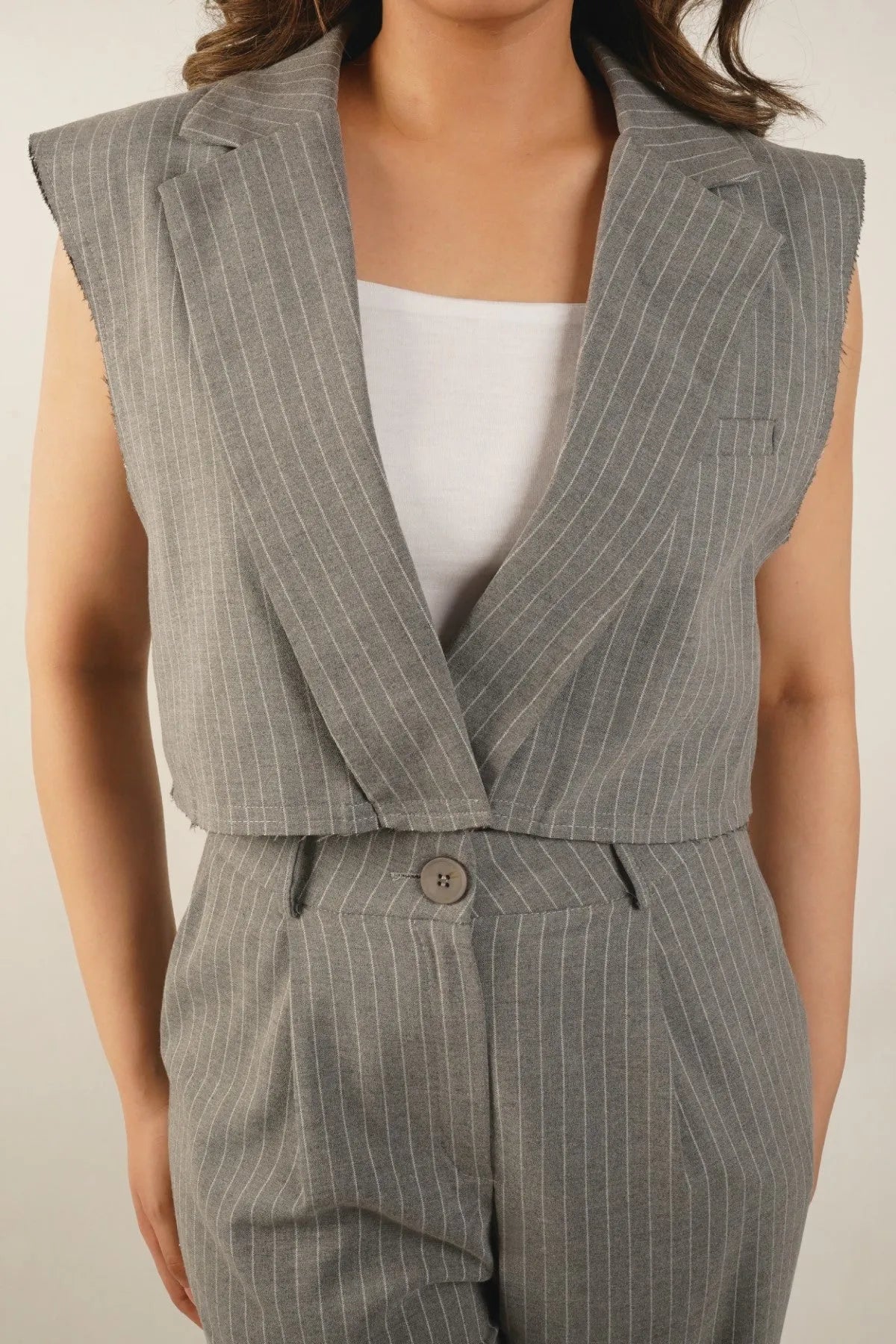a sleek and modern piece in grey. Crafted with meticulous attention to detail, this blazer features raw edges at the hems for a contemporary touch. With a hidden button closure in the front, it offers a clean and streamlined look. Elevate your ensemble with Licci's Cropped Sleeveless Blazer, where sophistication meets modern minimalism