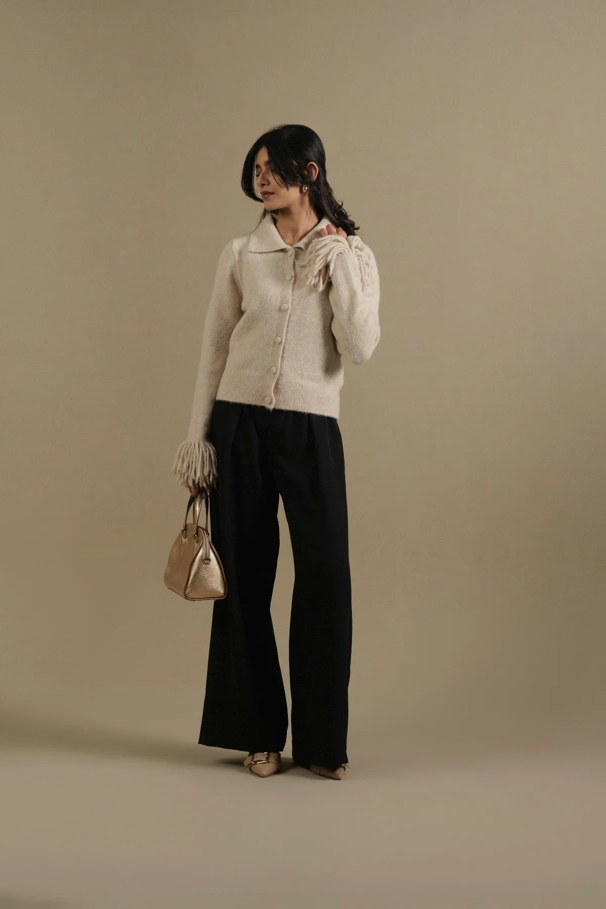 Woven from an acrylic and polyester blend, this cardigan has a rich, textured feel that adds depth to the look. The knit sits comfortably while keeping its form, giving it a refined but wearable finish. Fringe detailing at the cuffs brings a subtle statement, balanced by a clean button front and shaped collar. It’s a distinctive layer - warm, character-driven, and thoughtfully designed for everyday styling with a touch of personality.