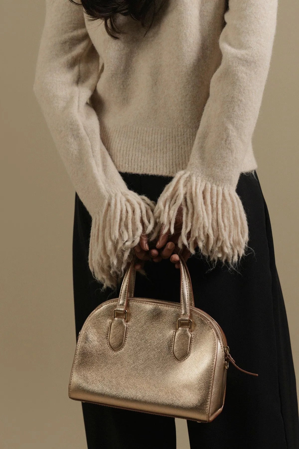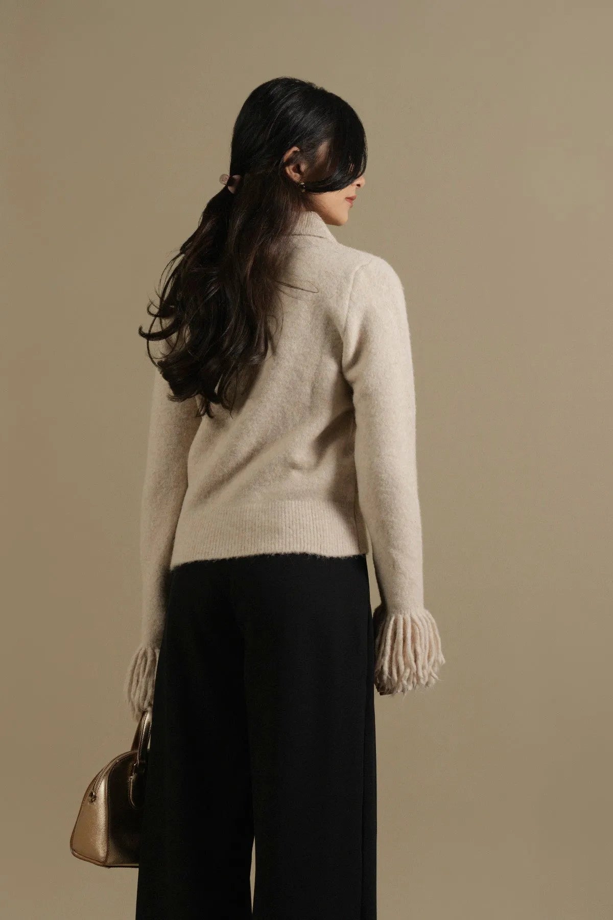 • Long sleeves with fringe cuffs