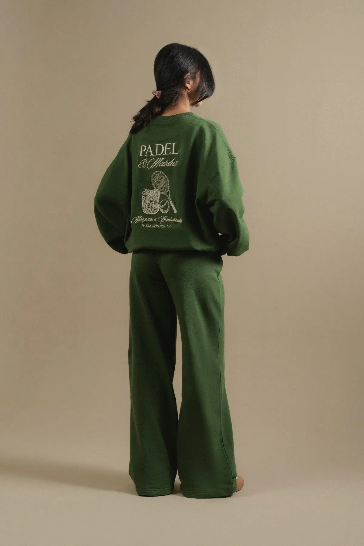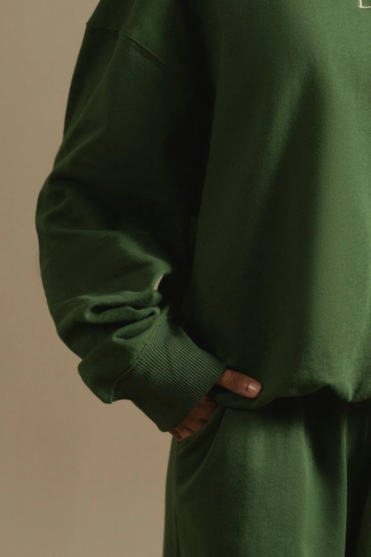 This Forest Green Sweatshirt brings a fresh, natural vibe to your wardrobe with its relaxed fit and soft cotton-polyester blend. The design features a simple crew neck and detailed "Pedal and matcha" machine embroidery in dark brown. With its ribbed cuffs and hem, it provides a comfortable feel that is perfect for a relaxed day out.