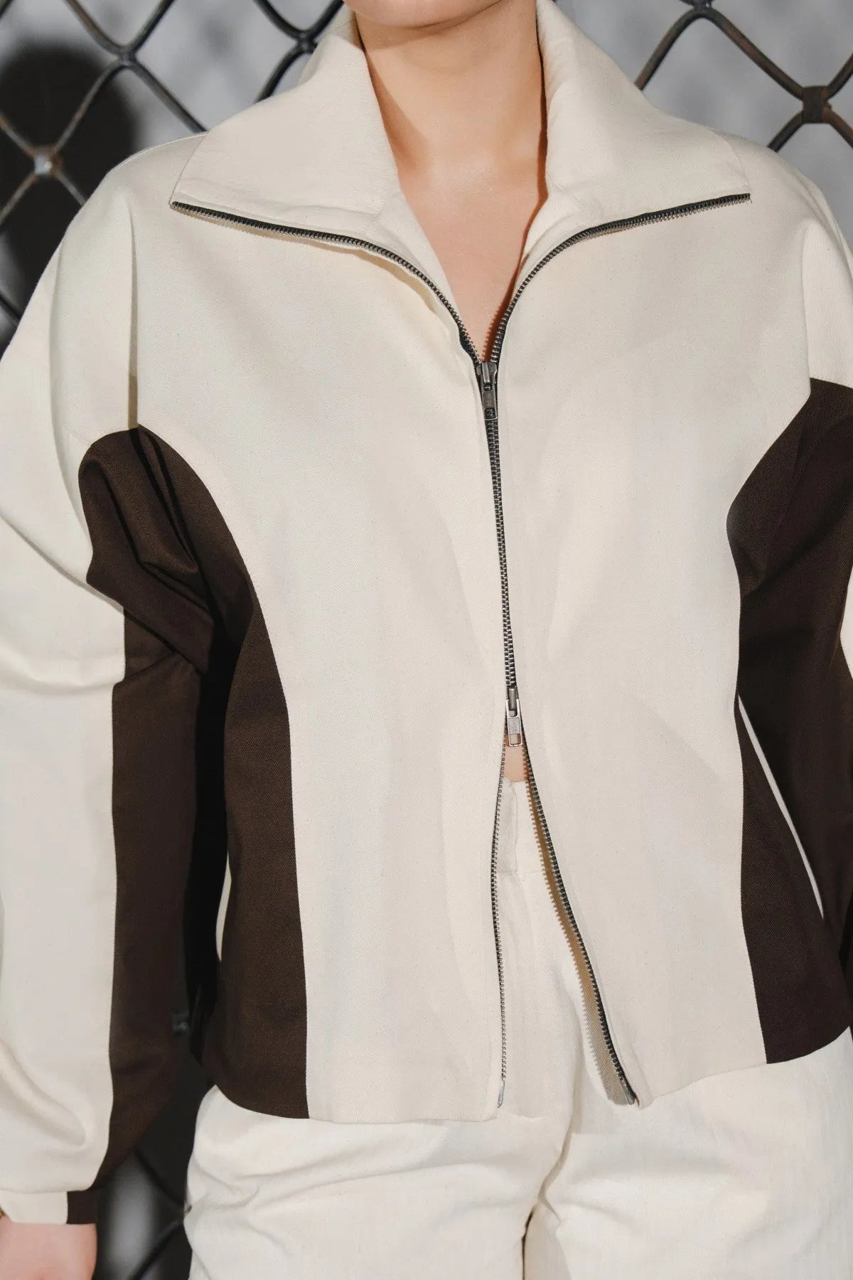 The Diverge Bomber Jacket is a winter jacket with a crop length and relaxed fit. It is made from a durable Polyester-Cotton Twill (PC Twill) blend. The jacket features a rich chocolate brown color accented by cloud cream princess line panels that extend from the front body through the sleeves. It has straight sleeves with pleated cuffs and button. The neck is dual-functional, serving as a high mock neck when zipped closed or a one-piece collar when open. The front closes with a double slider metal zip and flap, and includes contrasting bon pockets on the sides.