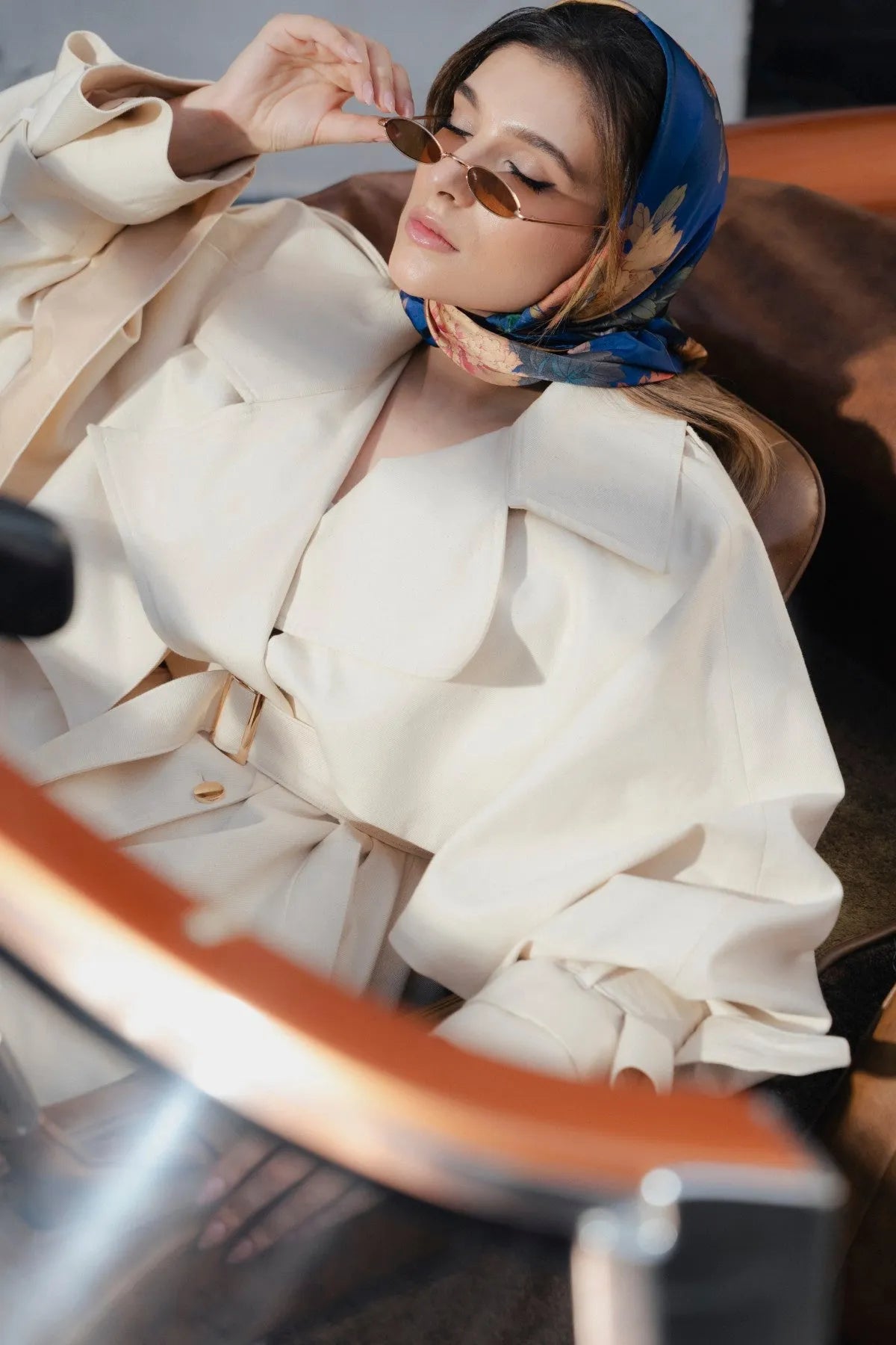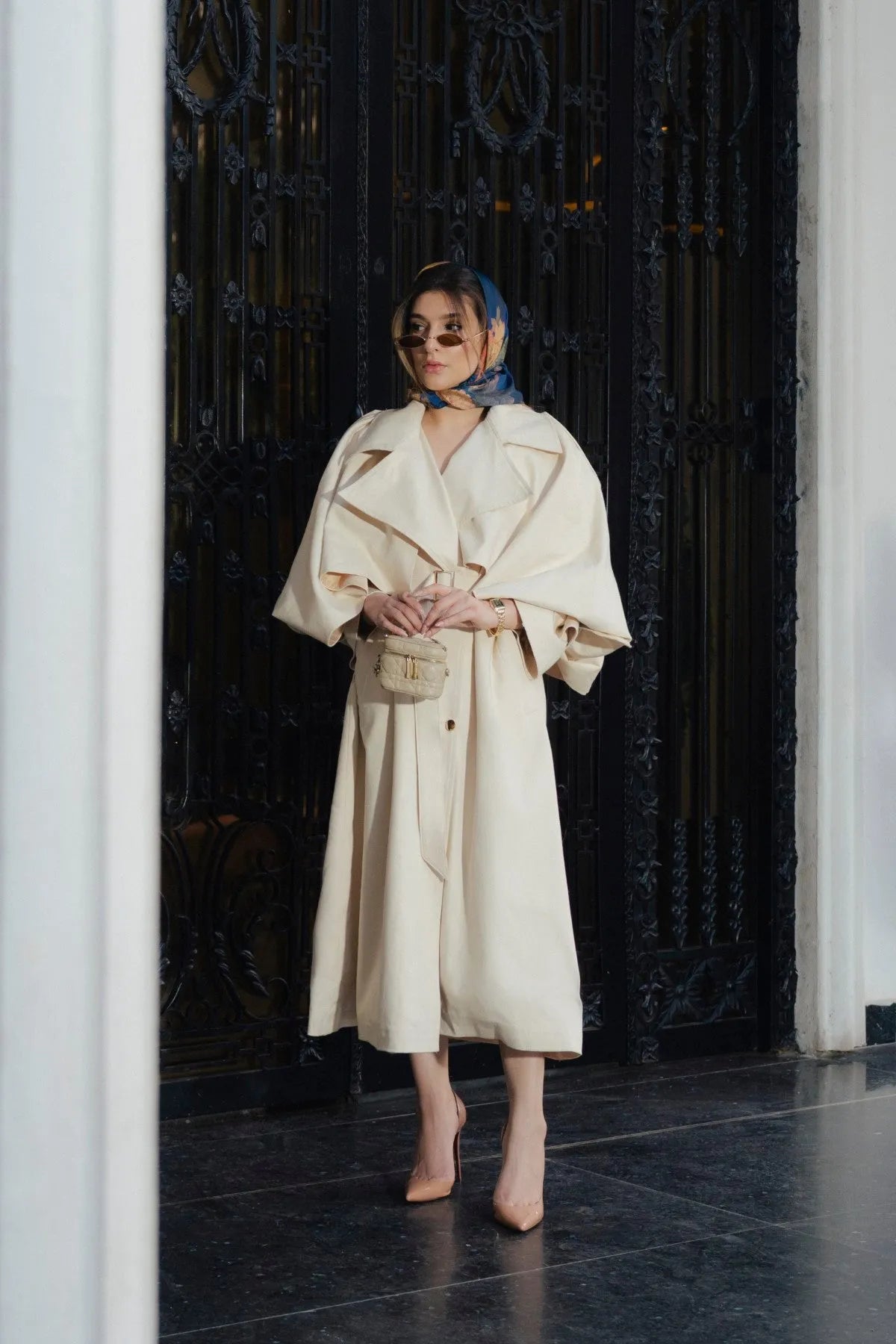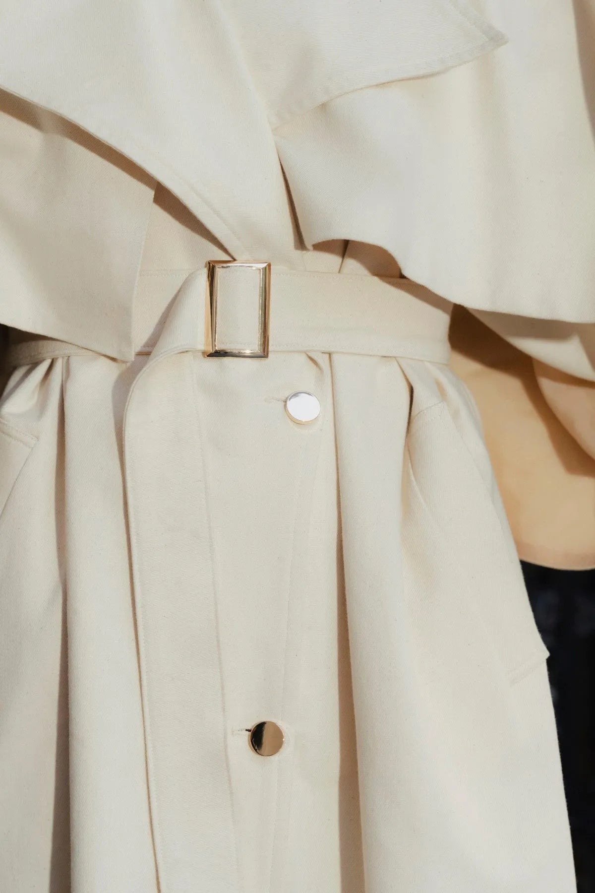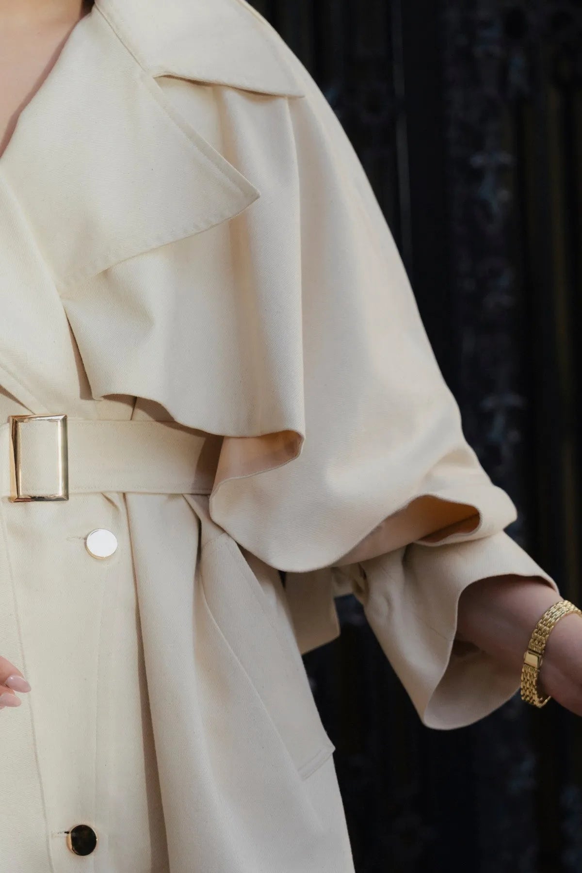 The Peony is a full length trench coat, made in an antique white color with a relaxed fit. The coat features a double-layered, double-breasted design with a coat lapel and collar. Functionality is added by bon pockets and a self-fabric adjustable waist belt with a rose gold buckle. The coat is finished internally with silk lining.