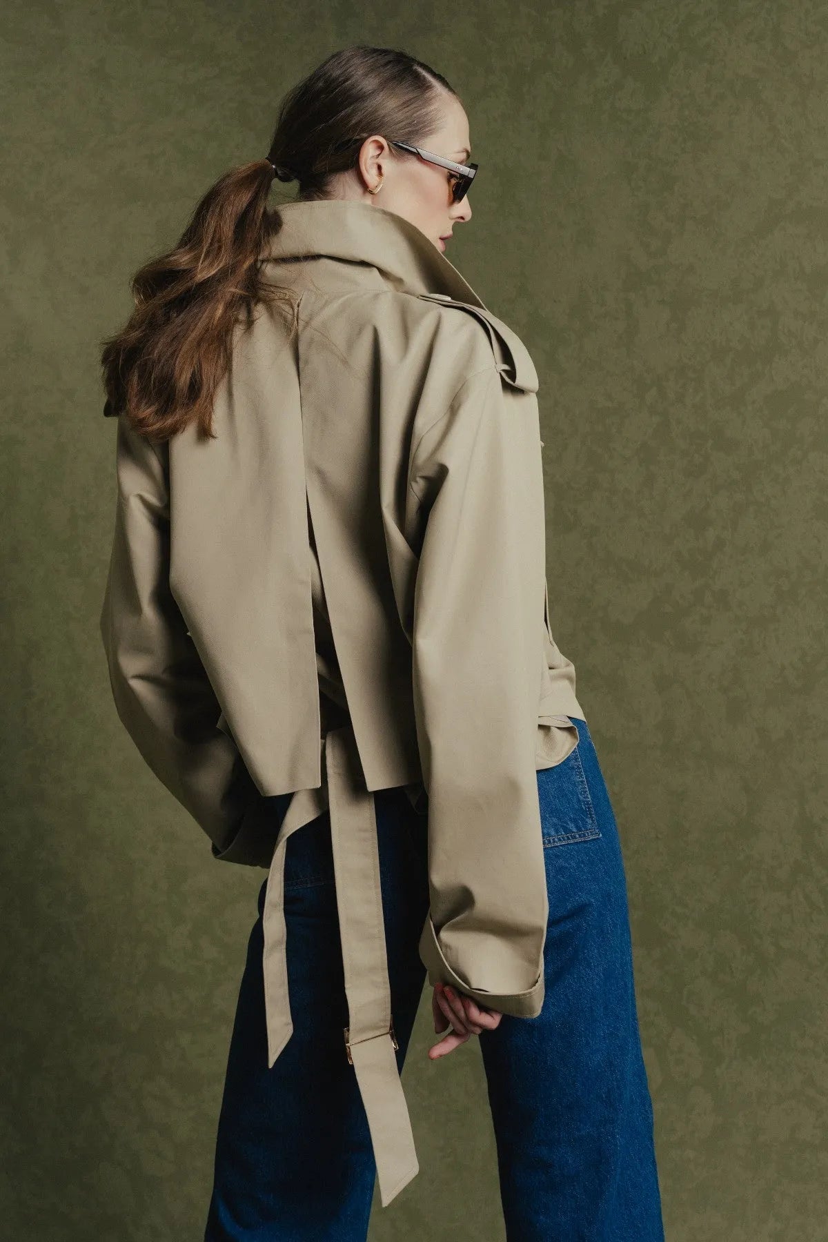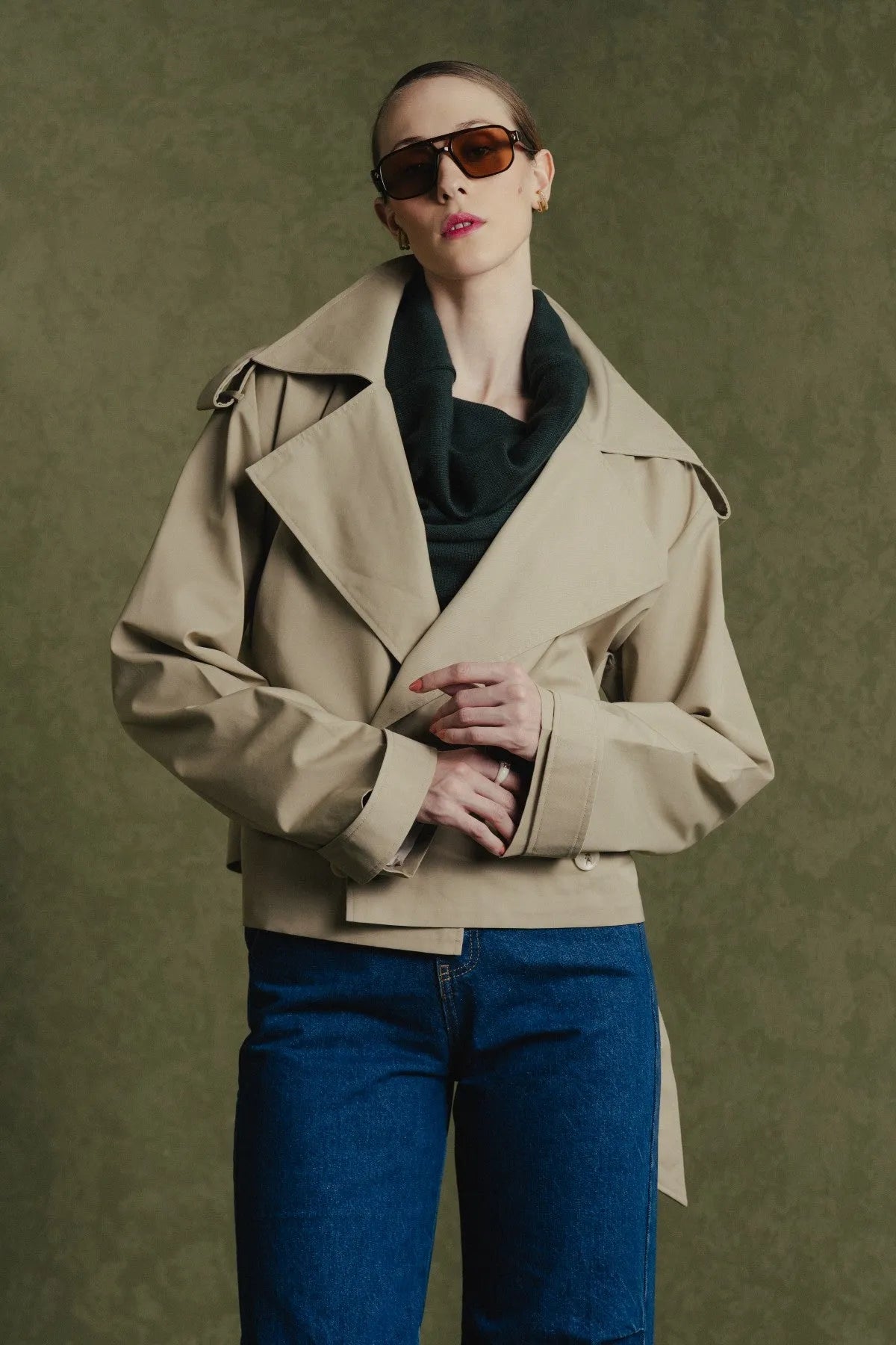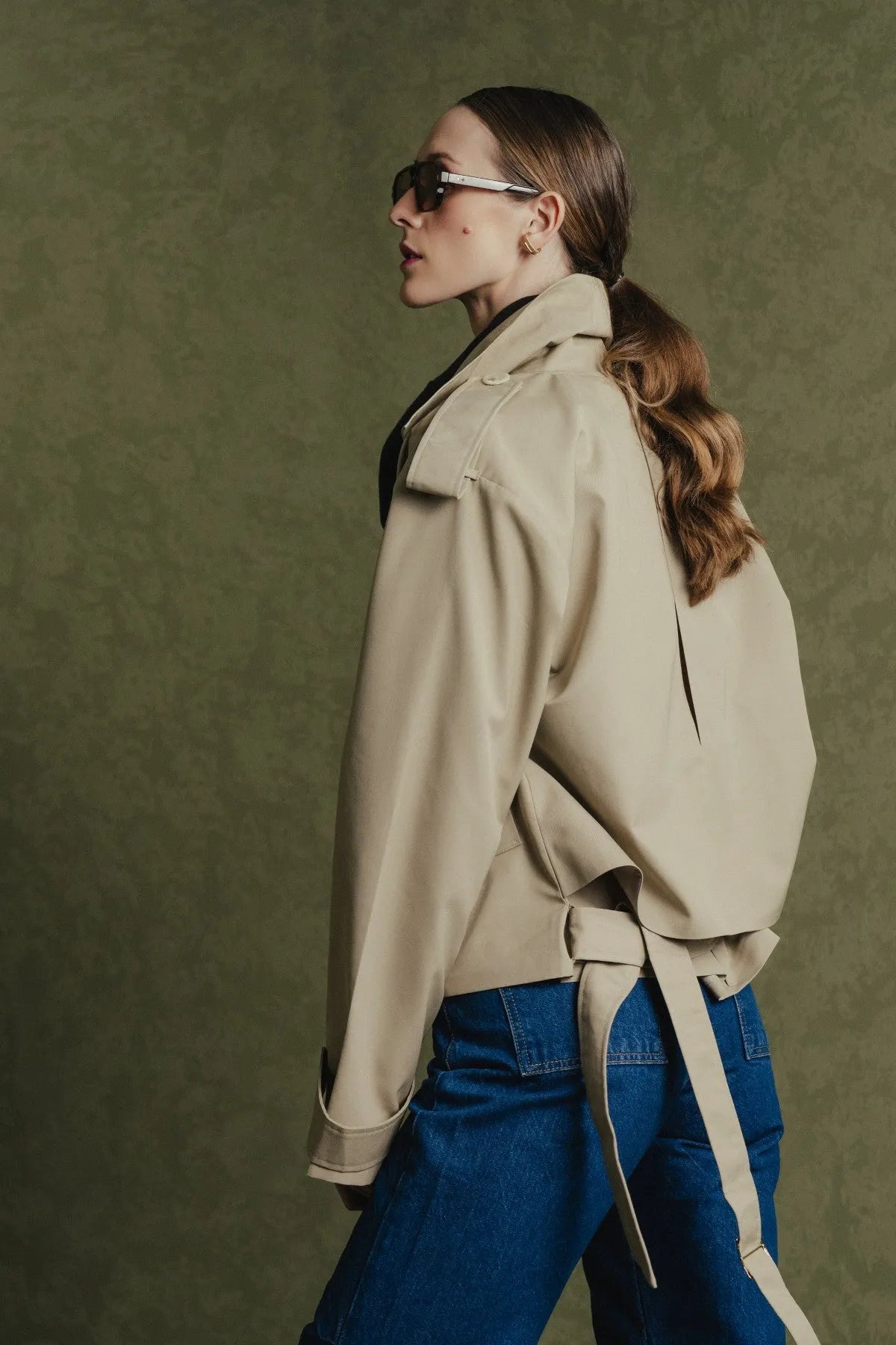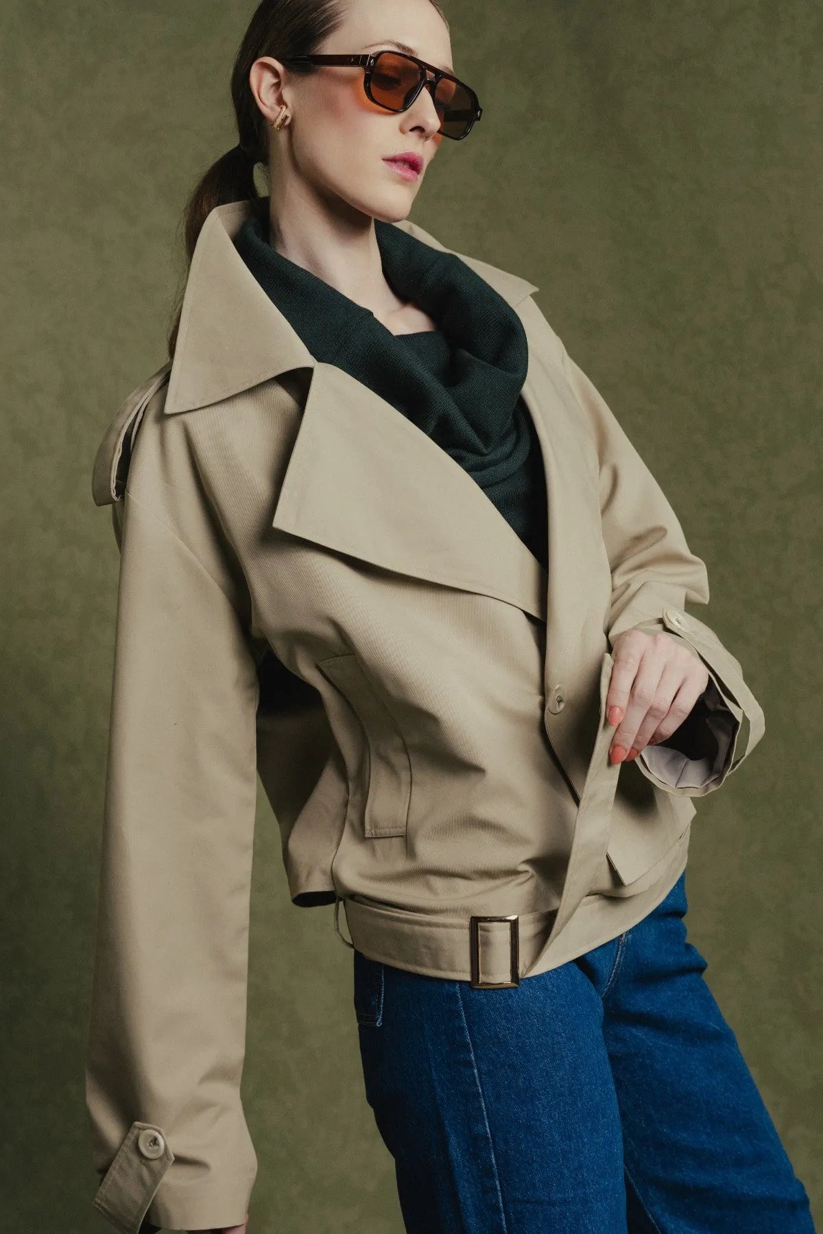 This Glory Belted Trench is a double-breasted coat in a light beige color, featuring a relaxed fit. The design is defined by its wide coat lapel and collar and drop shoulders. The full sleeves include cuff straps and buttons. The front closes in a double-breasted style using antique textured buttons. It includes a waist belt with a rose gold buckle to cinch the coat.