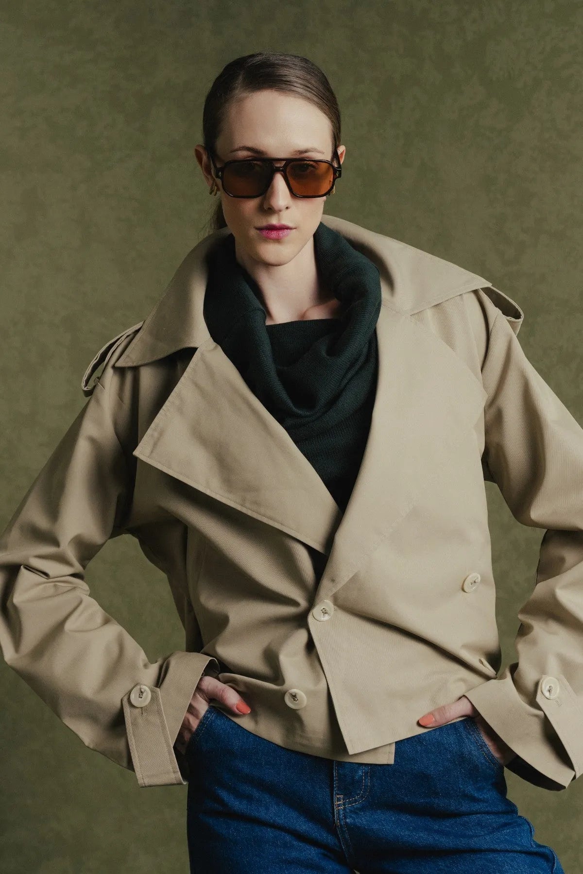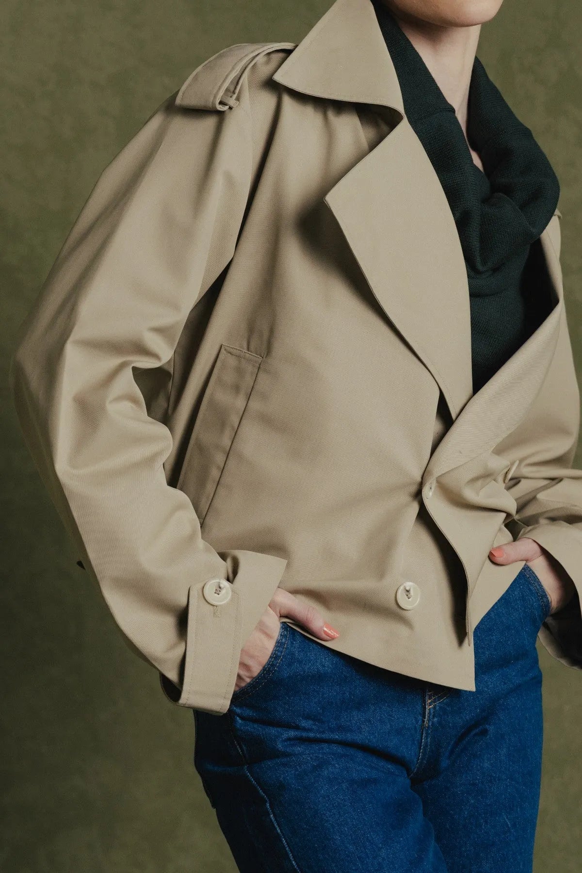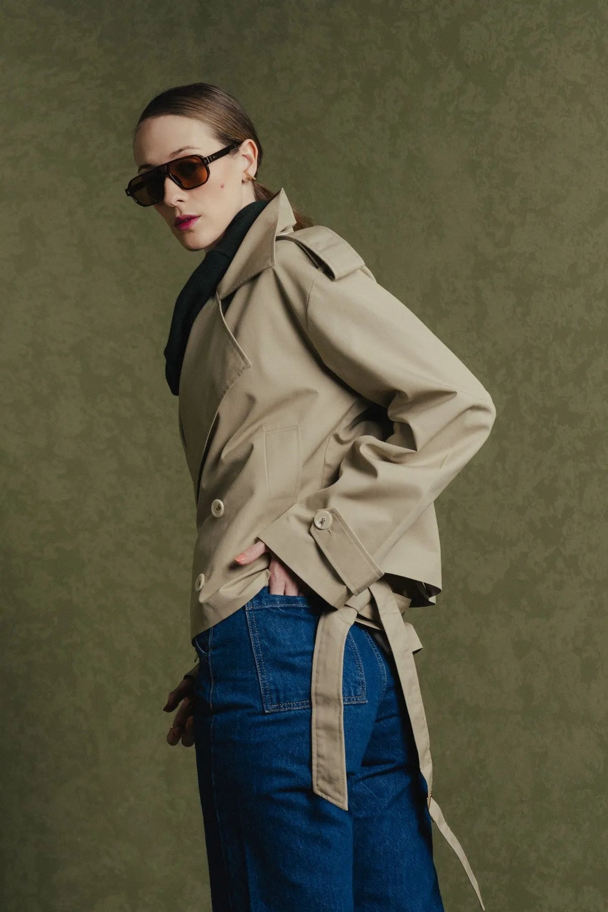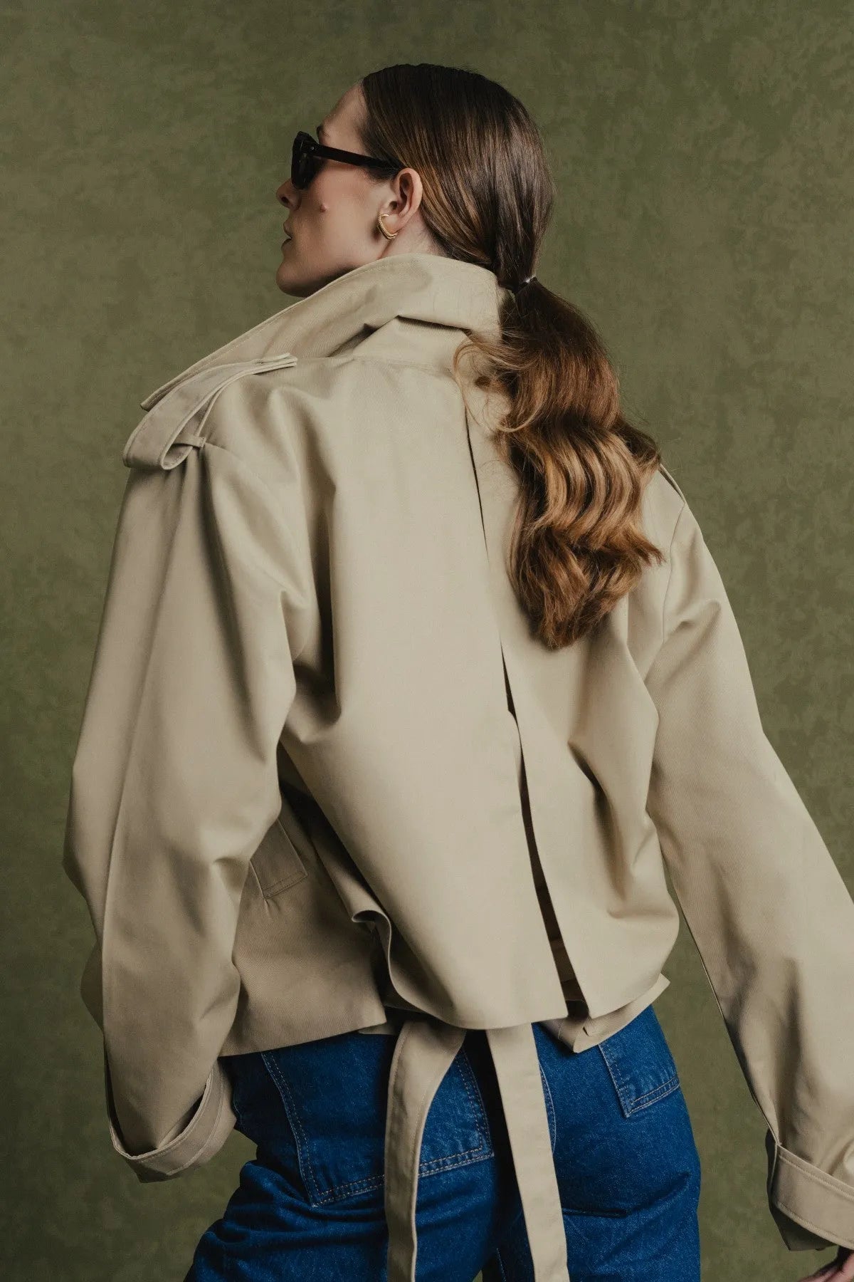 This Glory Belted Trench is a double-breasted coat in a light beige color, featuring a relaxed fit. The design is defined by its wide coat lapel and collar and drop shoulders. The full sleeves include cuff straps and buttons. The front closes in a double-breasted style using antique textured buttons. It includes a waist belt with a rose gold buckle to cinch the coat.