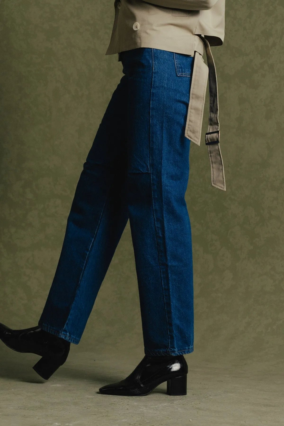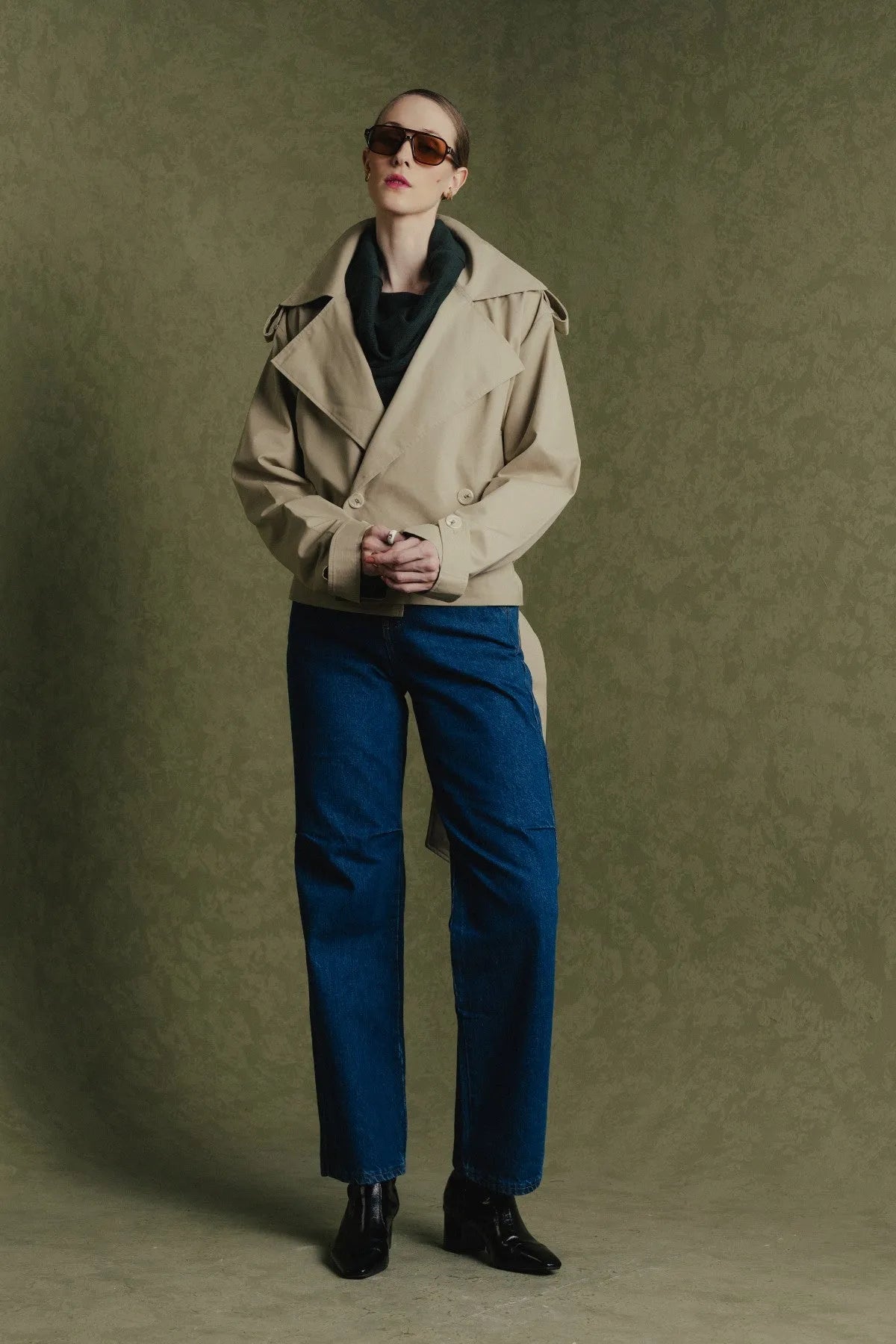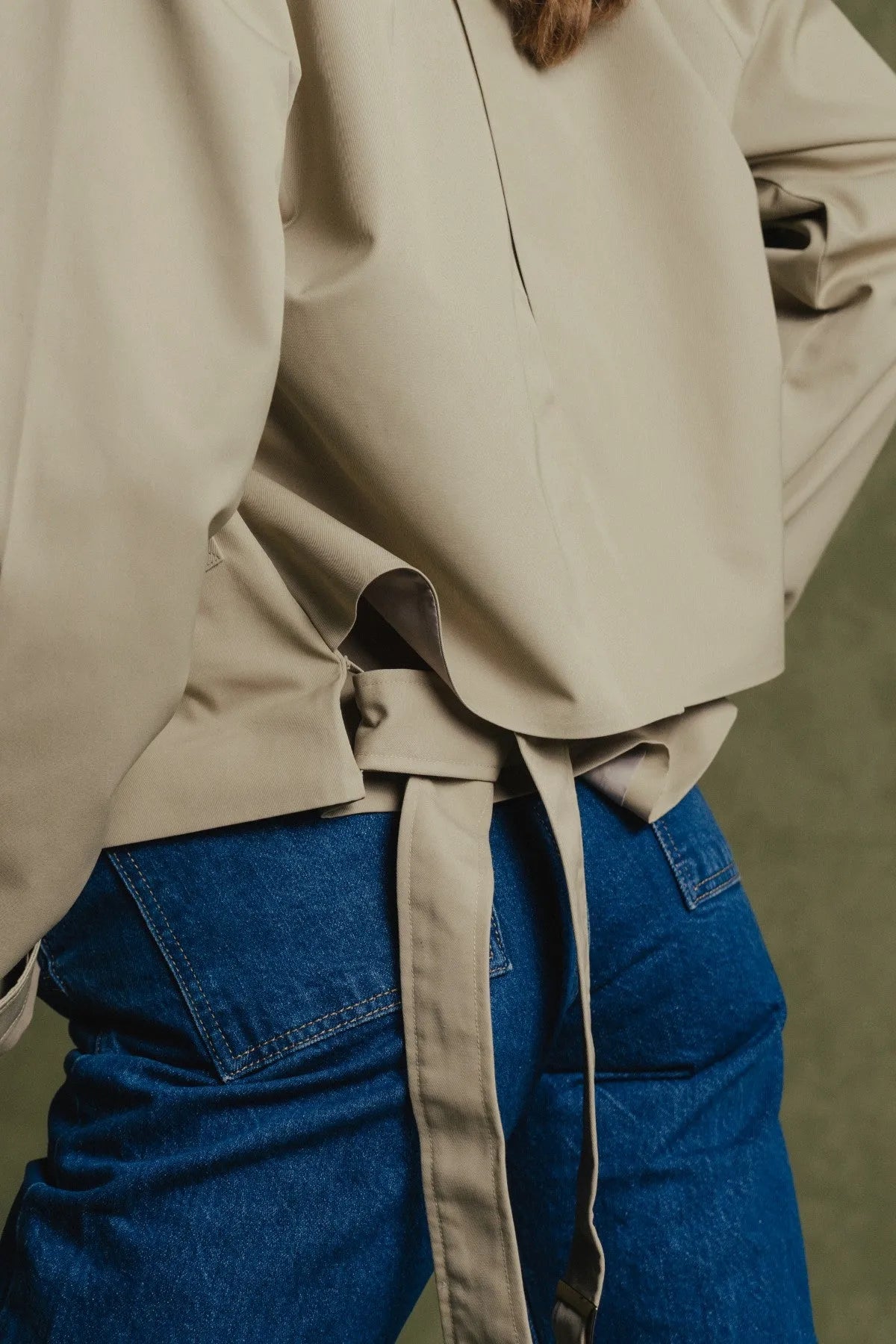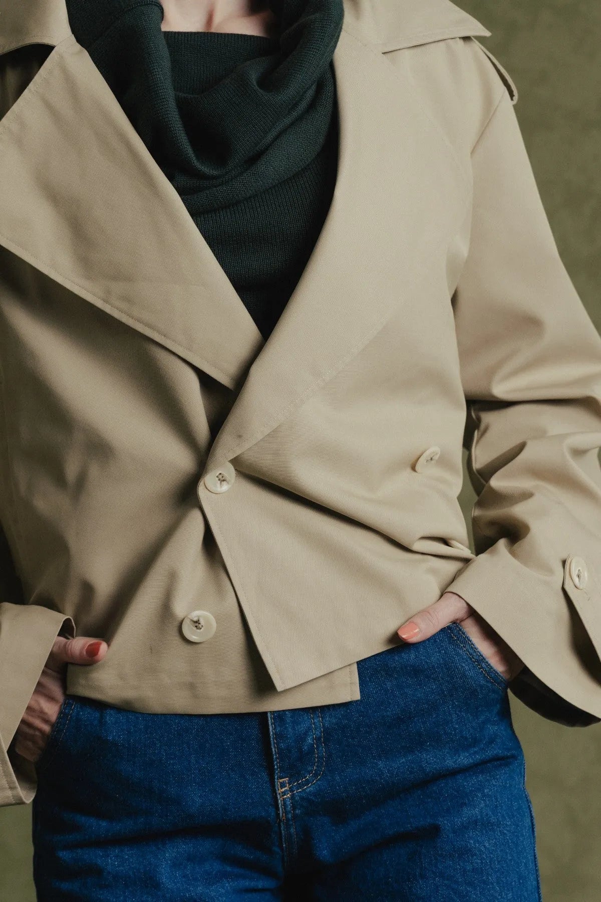 This Glory Belted Trench is a double-breasted coat in a light beige color, featuring a relaxed fit. The design is defined by its wide coat lapel and collar and drop shoulders. The full sleeves include cuff straps and buttons. The front closes in a double-breasted style using antique textured buttons. It includes a waist belt with a rose gold buckle to cinch the coat.