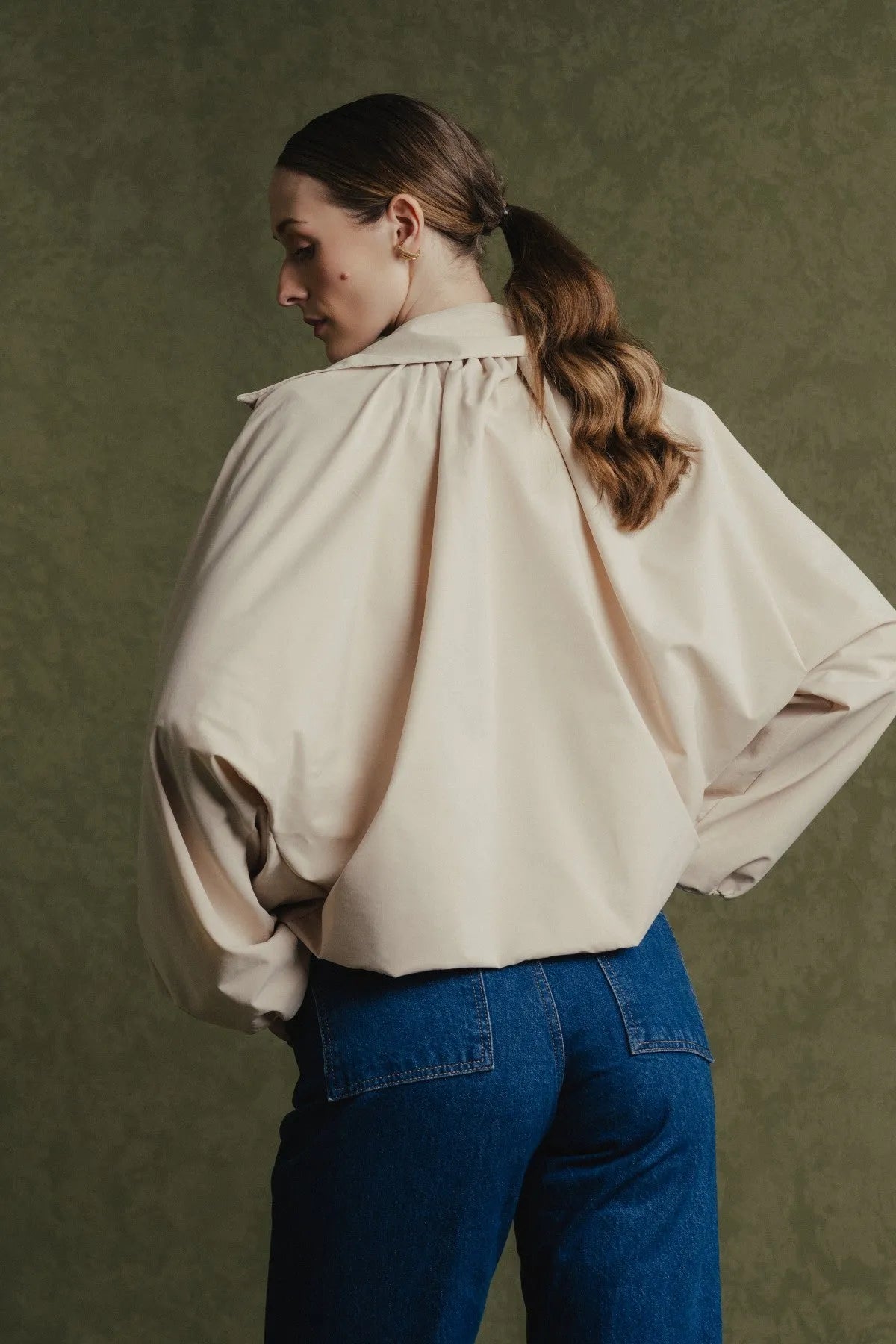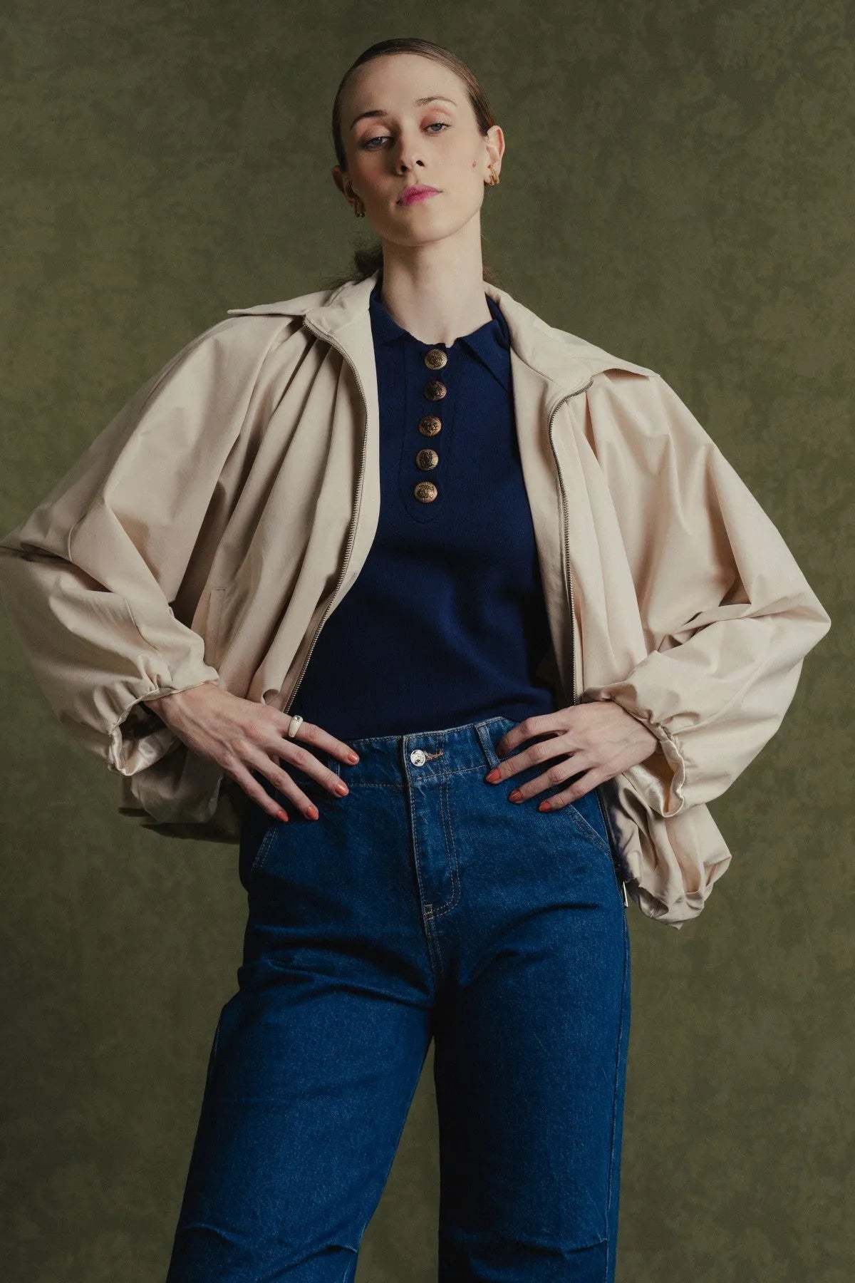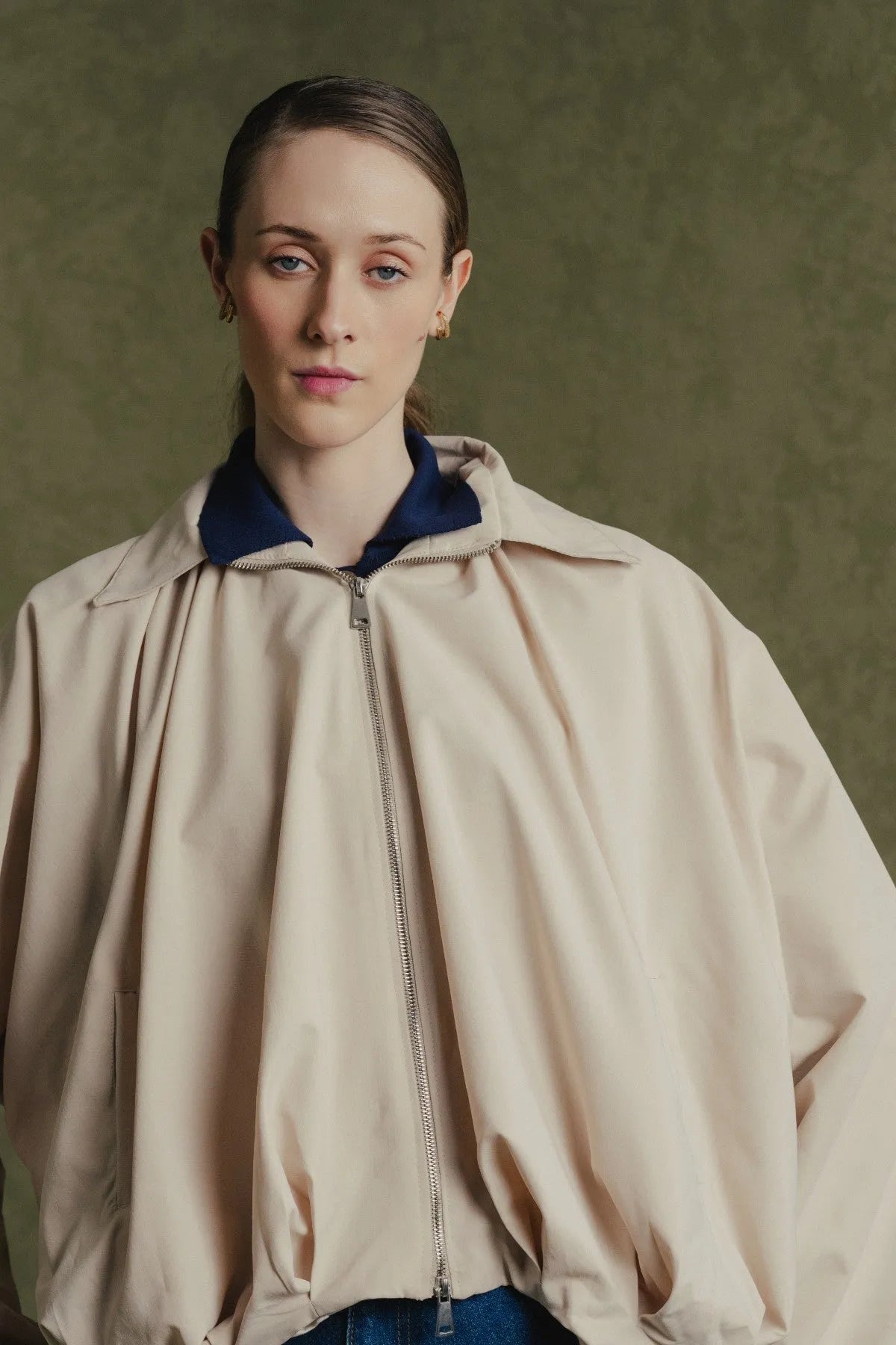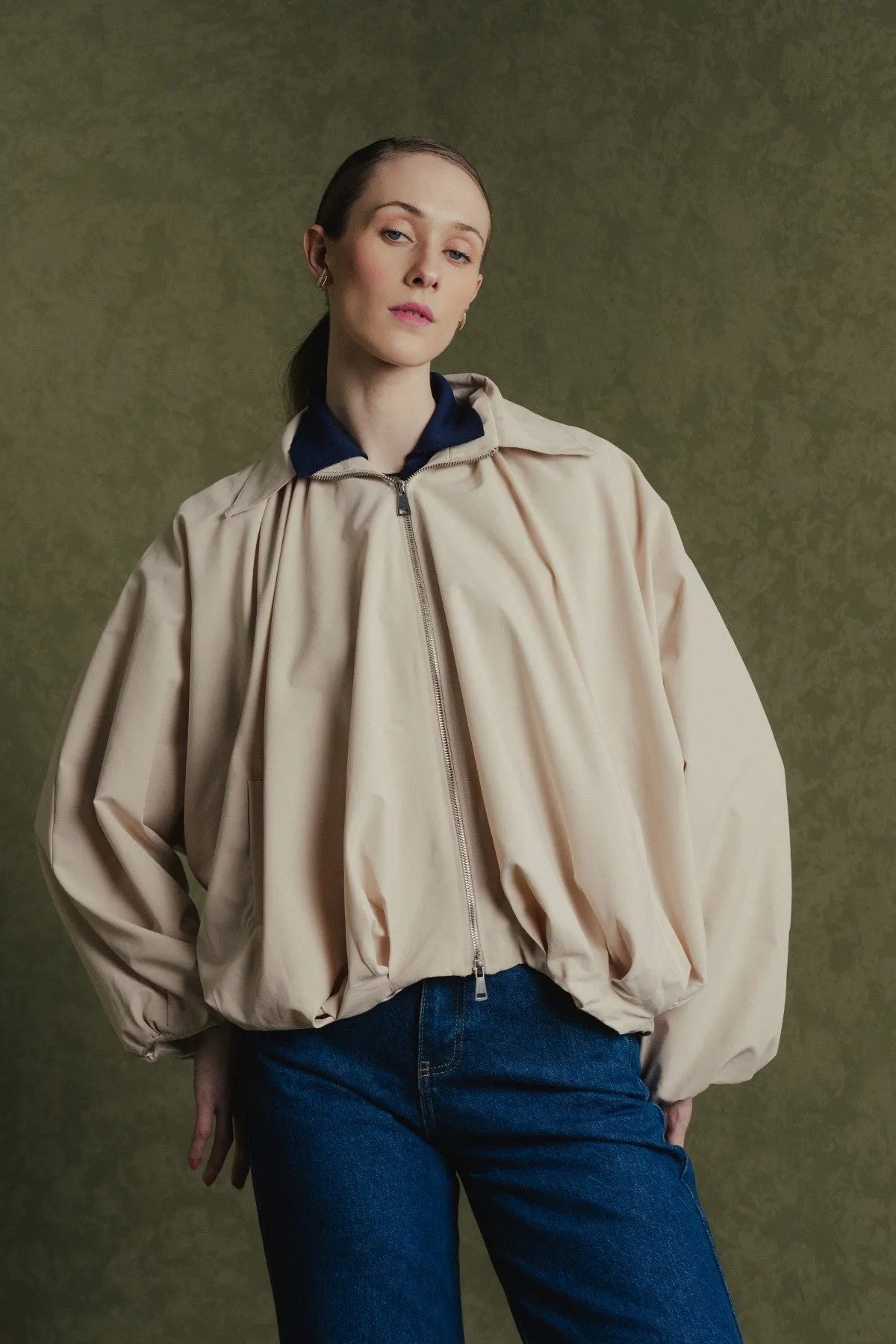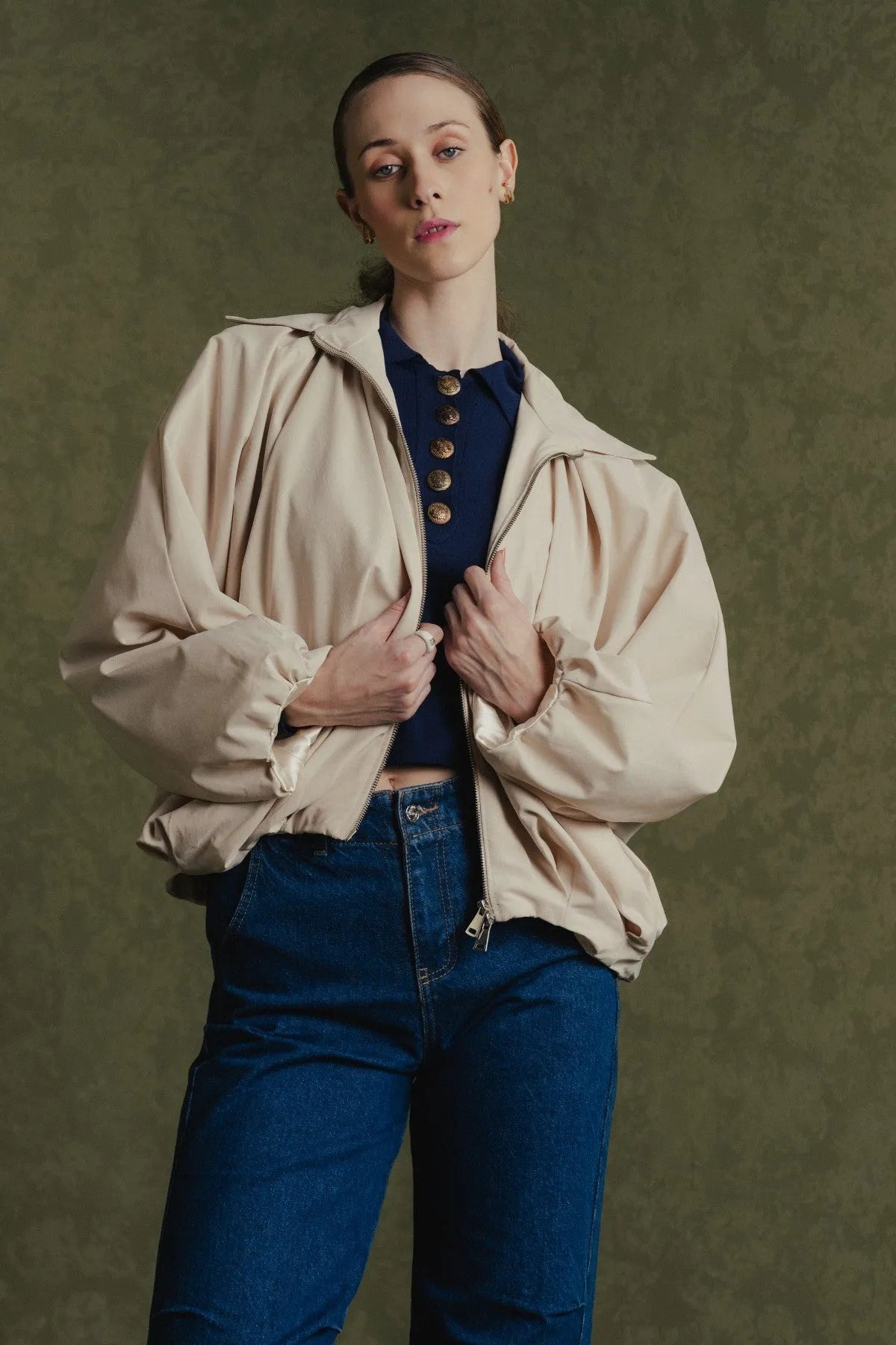This beige jacket is made from a blend of Polyester and Lycra. It features a lapel collar design. The front fastens with a sturdy metal zipper closure. The fit is neatly finished with an elasticated hem.