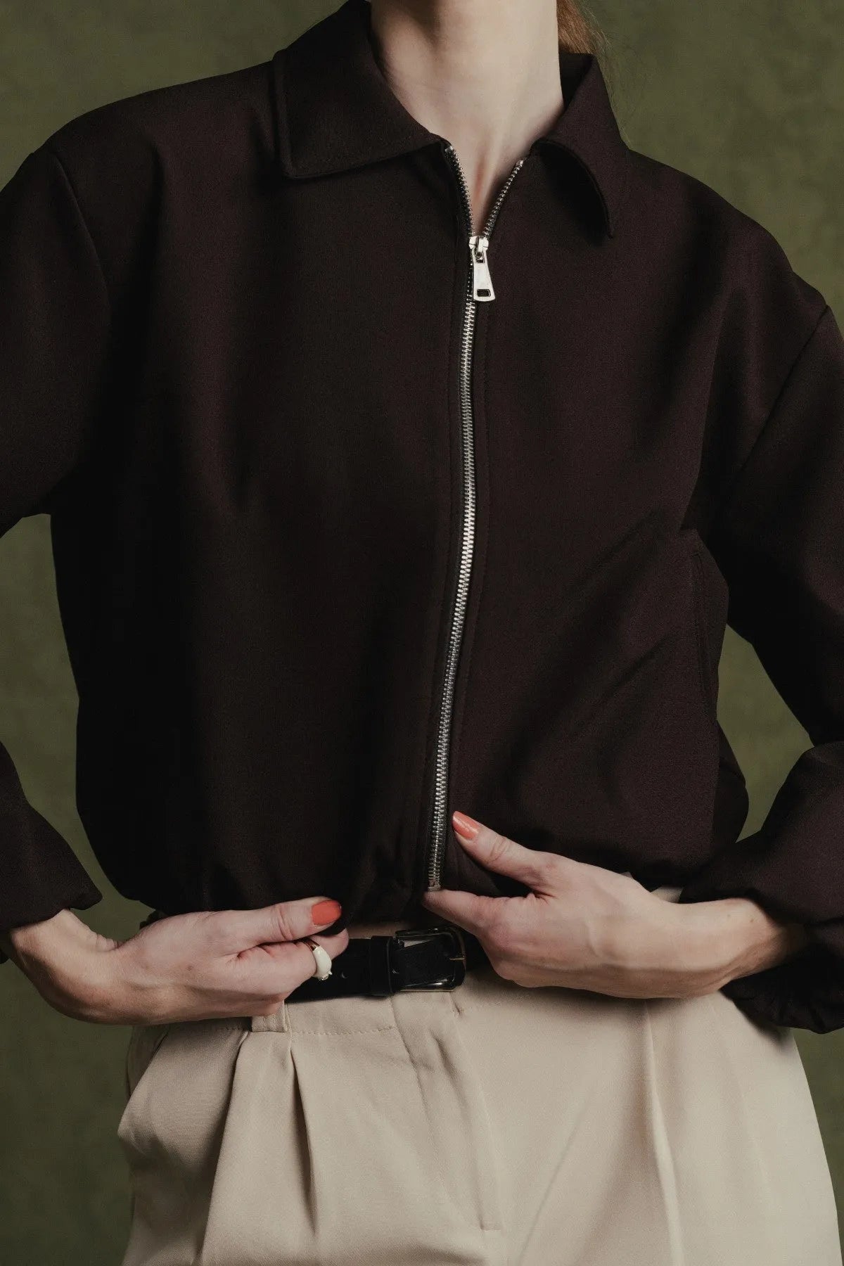It features a full-length silver zipper, classic lapel collar, and elasticated cuffs and hem.
