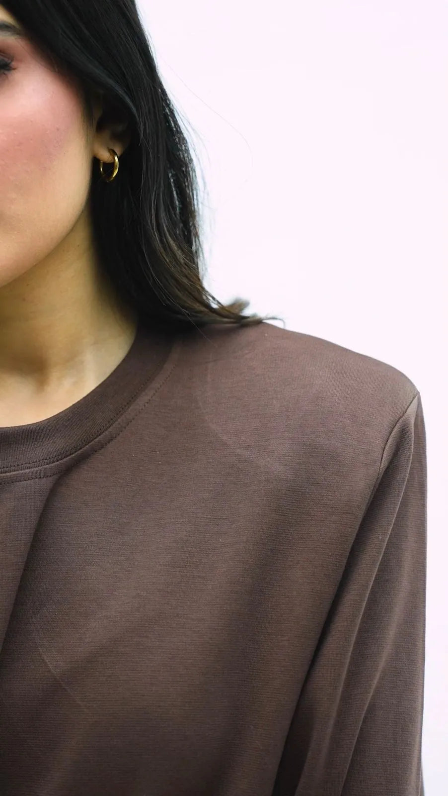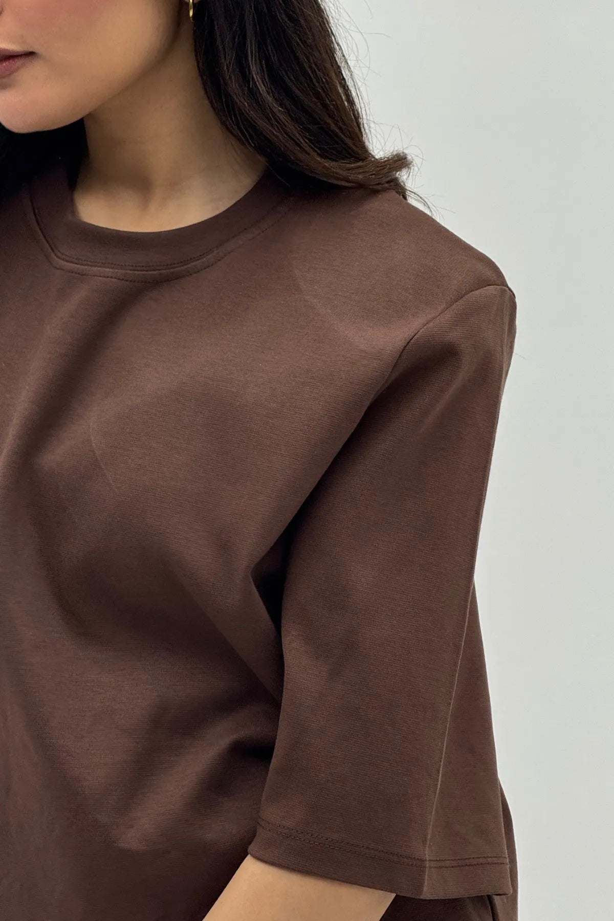 This brown T-shirt takes a clean approach to everyday dressing. Cut from 95% cotton and 5% elastin, it sits easy on the body with just the right amount of stretch. Padded shoulders bring quiet structure, balancing the relaxed shape of the half sleeves and round neckline. A go-to piece for minimal style lovers, it proves that less really can do more.