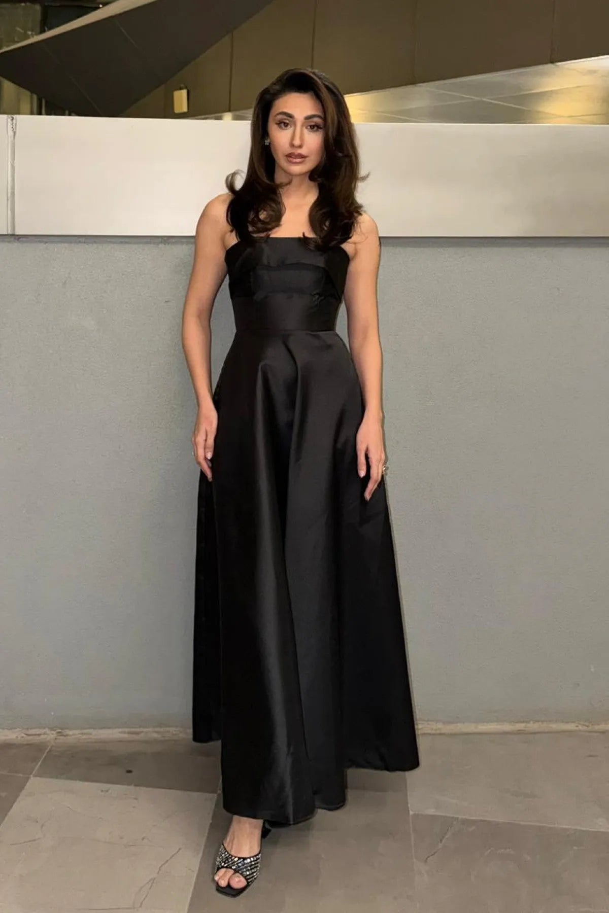 Made from 100% polyester, this black dress offers a smooth finish with a refined feel. The fitted bodice is supported by slim shoulder straps along with extra transparent straps for added hold. Pleats begin at the waist, creating gentle volume that moves with ease. The fabric drapes cleanly, enhancing the length of the skirt. A back zipper allows for a secure fit and a polished look from every angle.