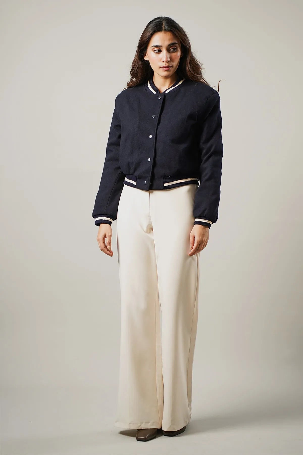 A sporty-chic essential for your wardrobe. This jacket features blue and white ribbed details on the sleeves, hem and neckline, adding texture and style. The front is adorned with snap buttons, enhancing its athletic appeal.