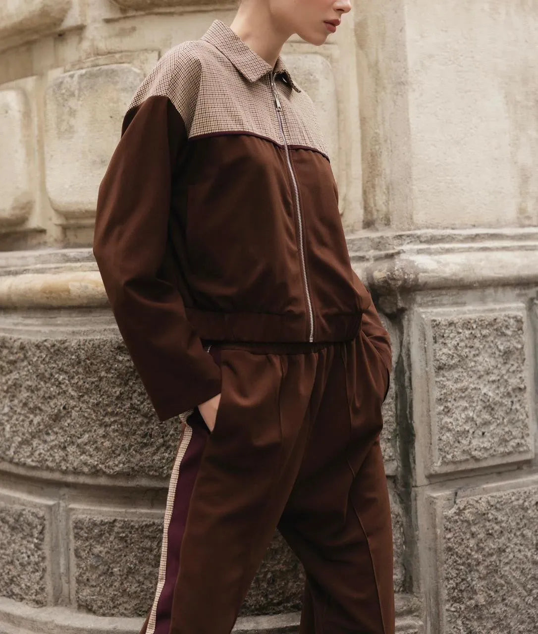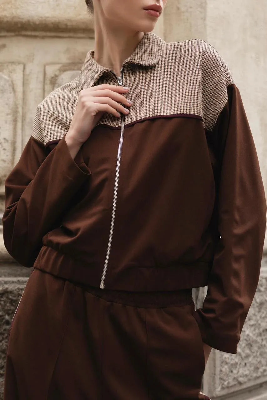 This cotton blend brown jacket is designed for everyday ease. A checked panel across the shoulders adds contrast to the solid base. The collared neckline and front zip give it a classic, functional edge, while long sleeves and front pockets make it practical for layering.