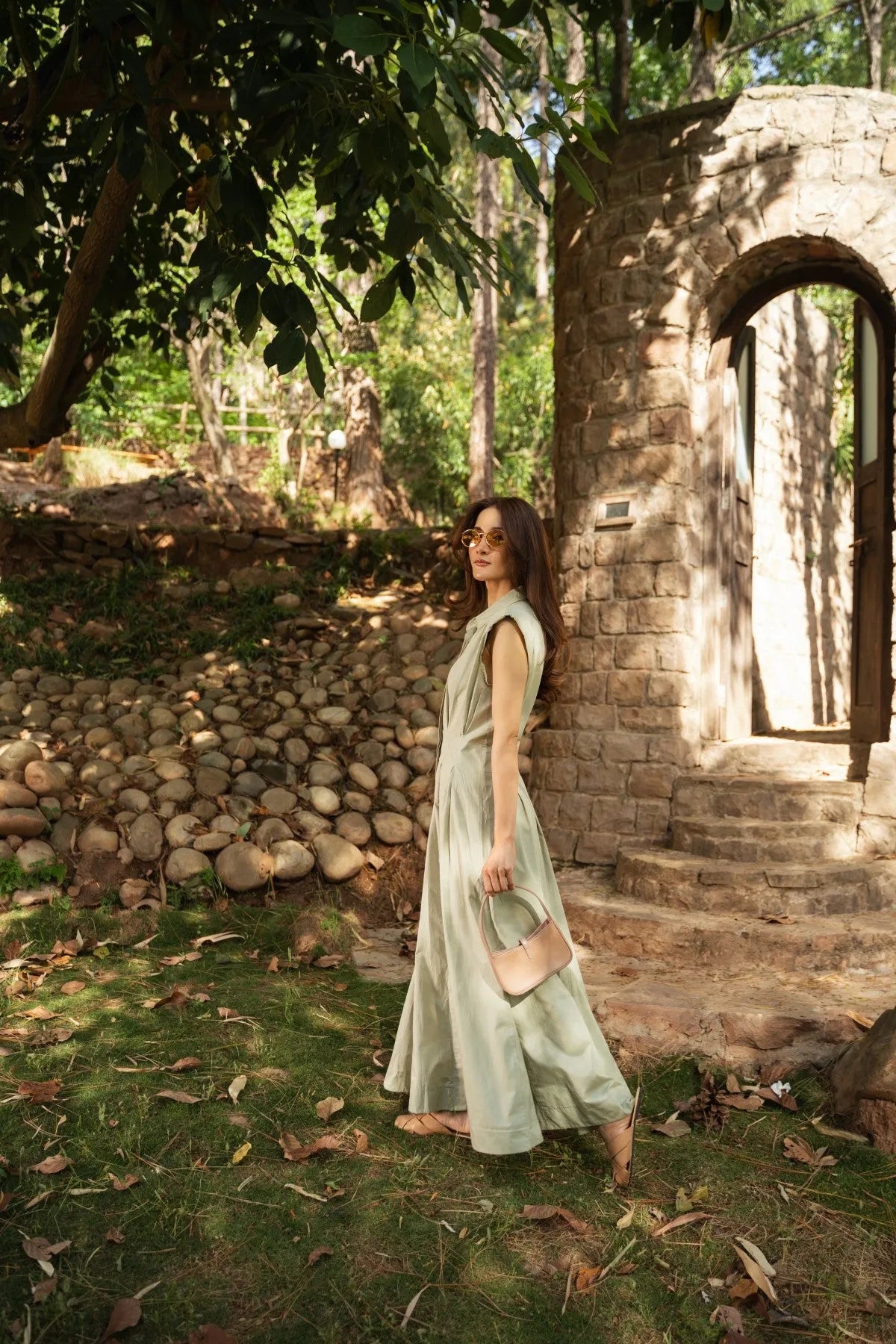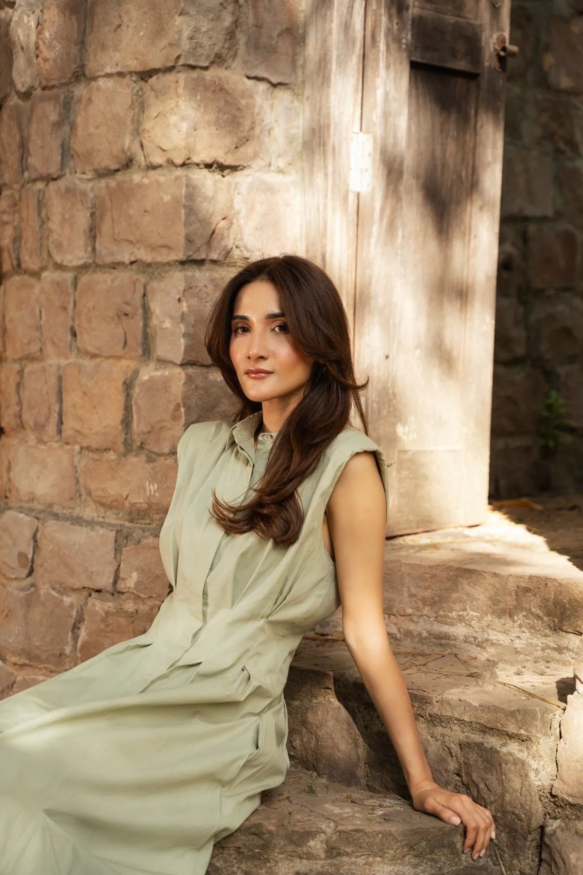 This muted sage green dress brings a clean, Minty Collared Dress feminine edge to warm-weather styling. Cut from crisp 100% cotton, it feels as light as it looks, with padded shoulders, a sharp collared V-neckline and tonal front buttons which elevates the minimal silhouette, while gentle pleats at the waist offer shape without stiffness.