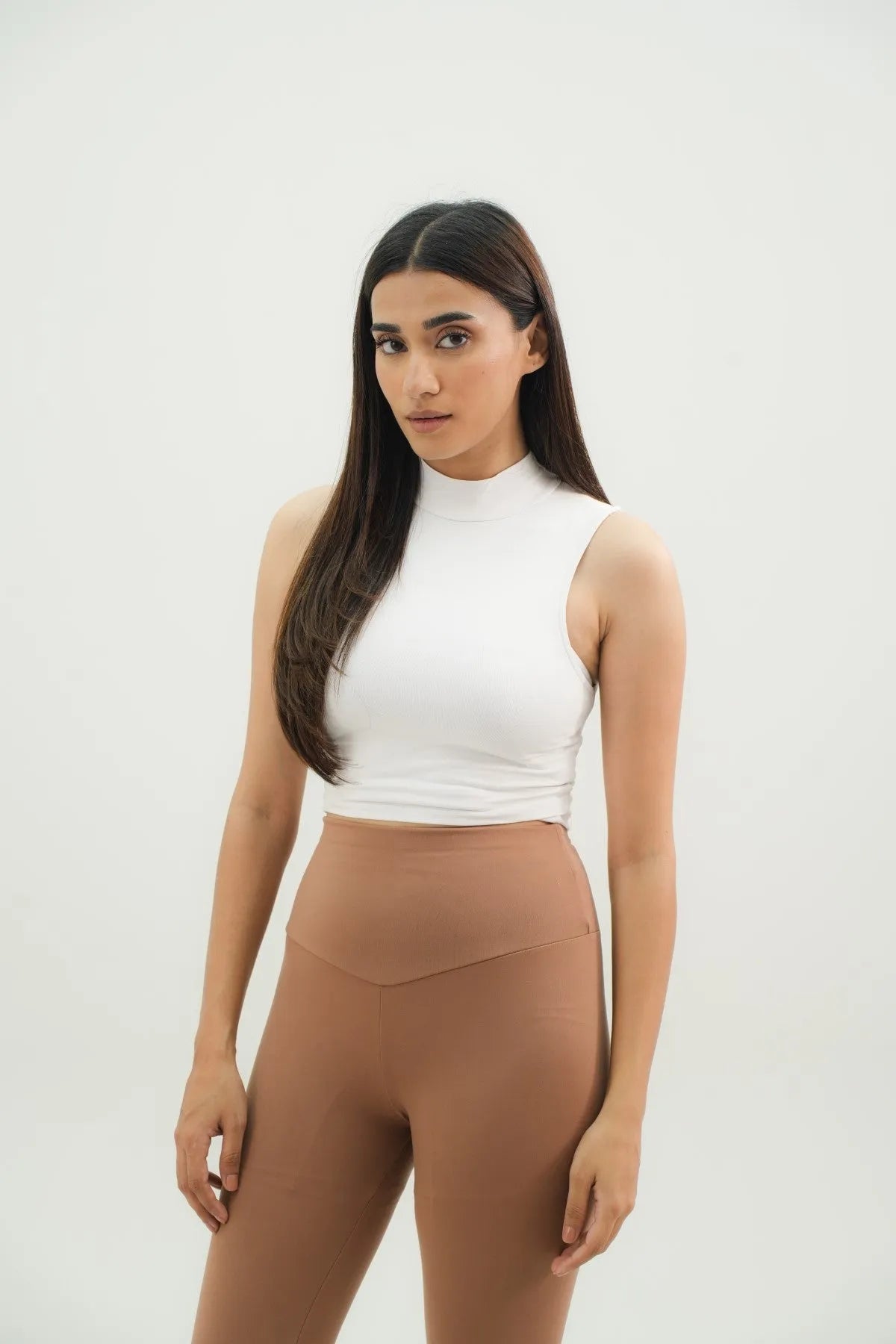 A chic staple for your wardrobe in crisp white. This sleeveless crop top features a high neckline, offering a modern and sophisticated silhouette. Crafted for comfort and style, it's perfect for pairing with high-waisted bottoms for a trendy look.