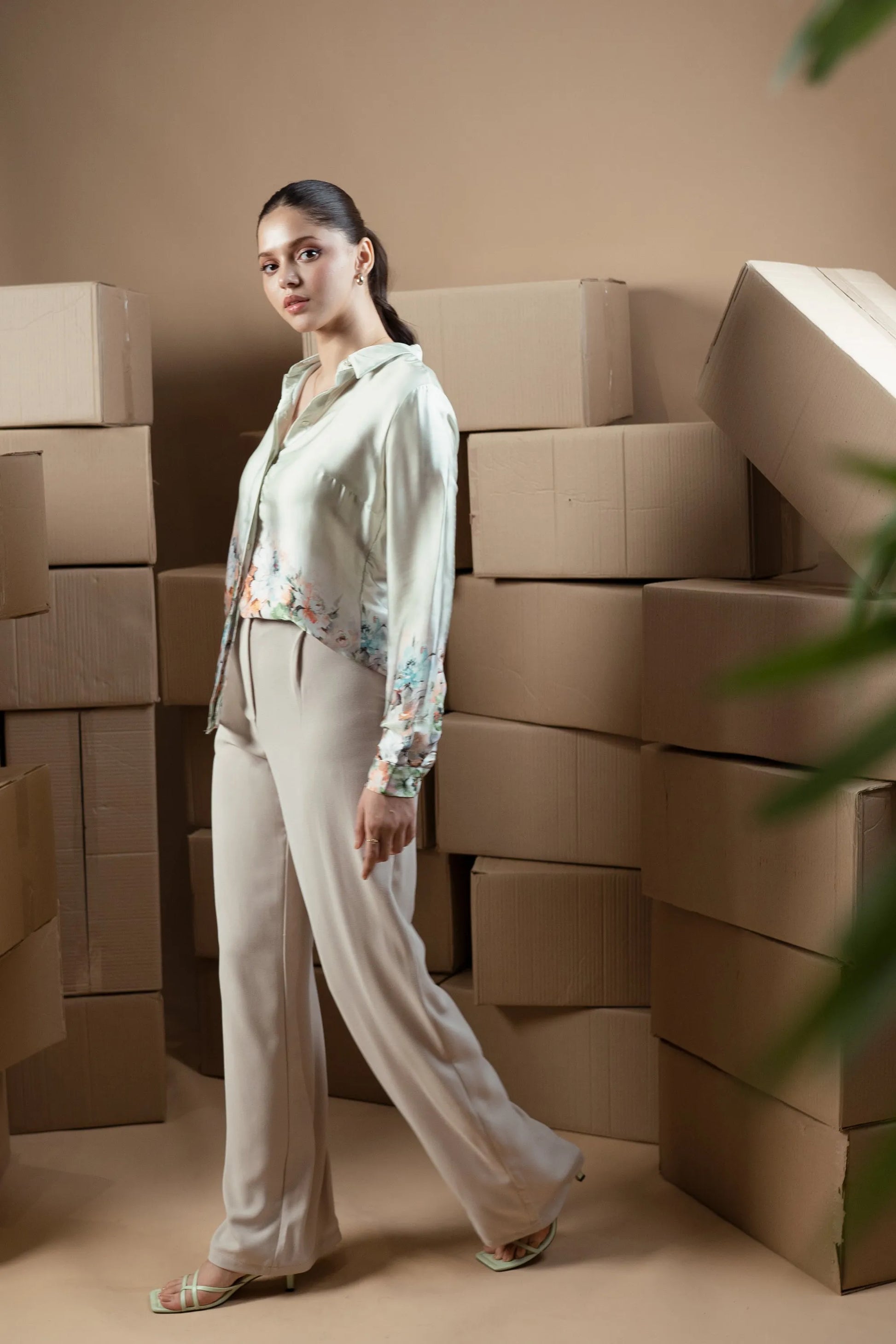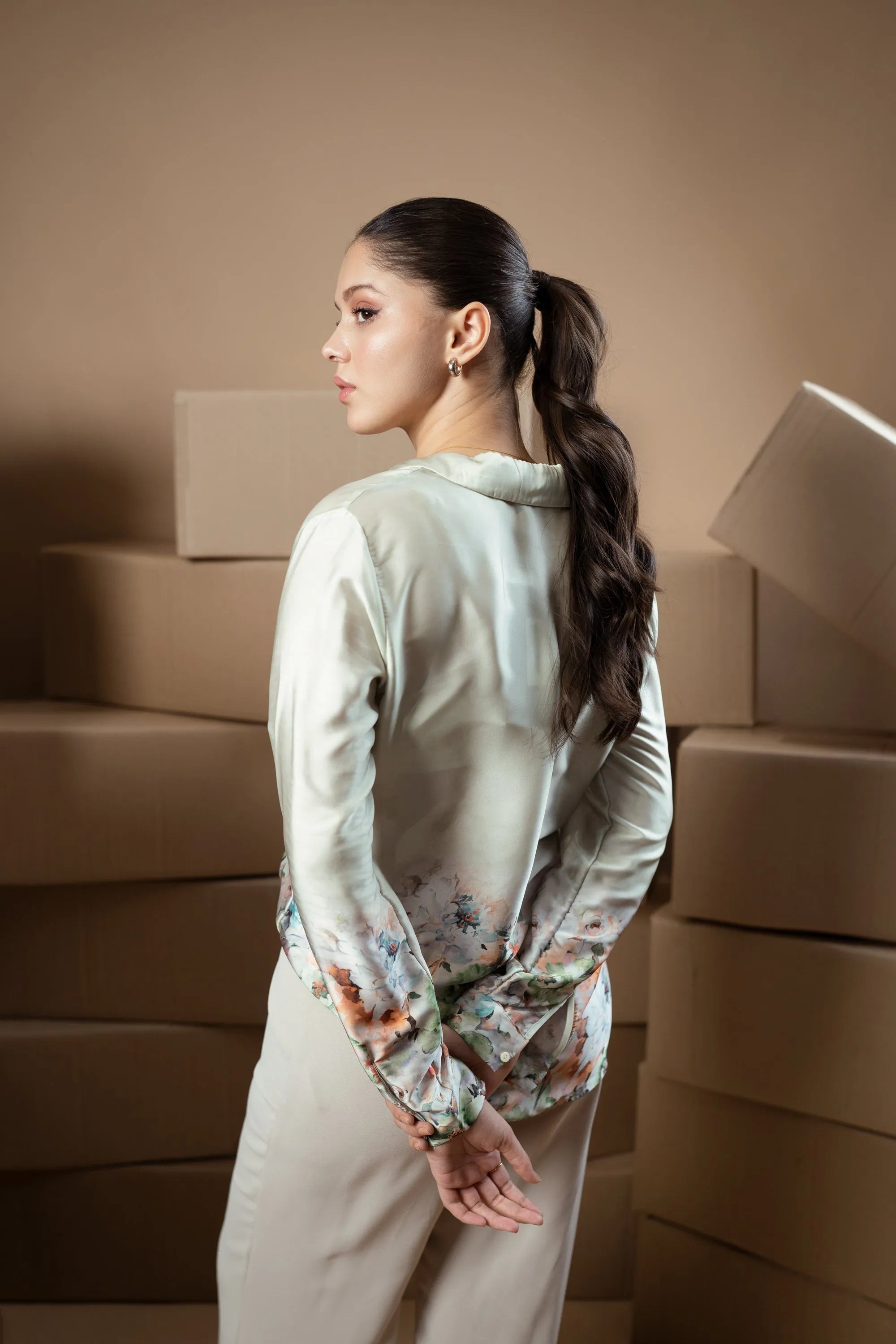 A charming addition to your wardrobe in pastel green. Crafted from smooth satin, this collared button-up shirt offers a luxurious feel and a regular fit for comfortable wear. The standout feature is the captivating digital print, adding a touch of modern flair to the classic design.
