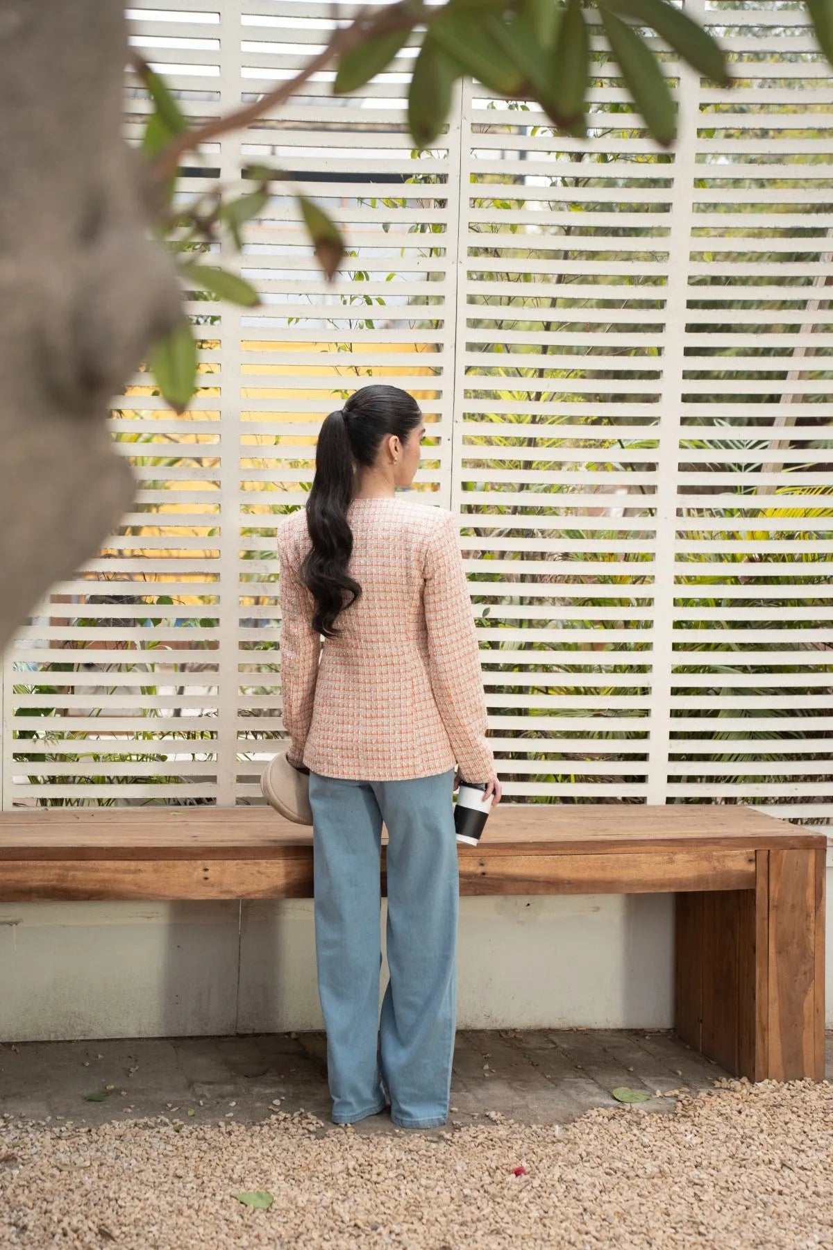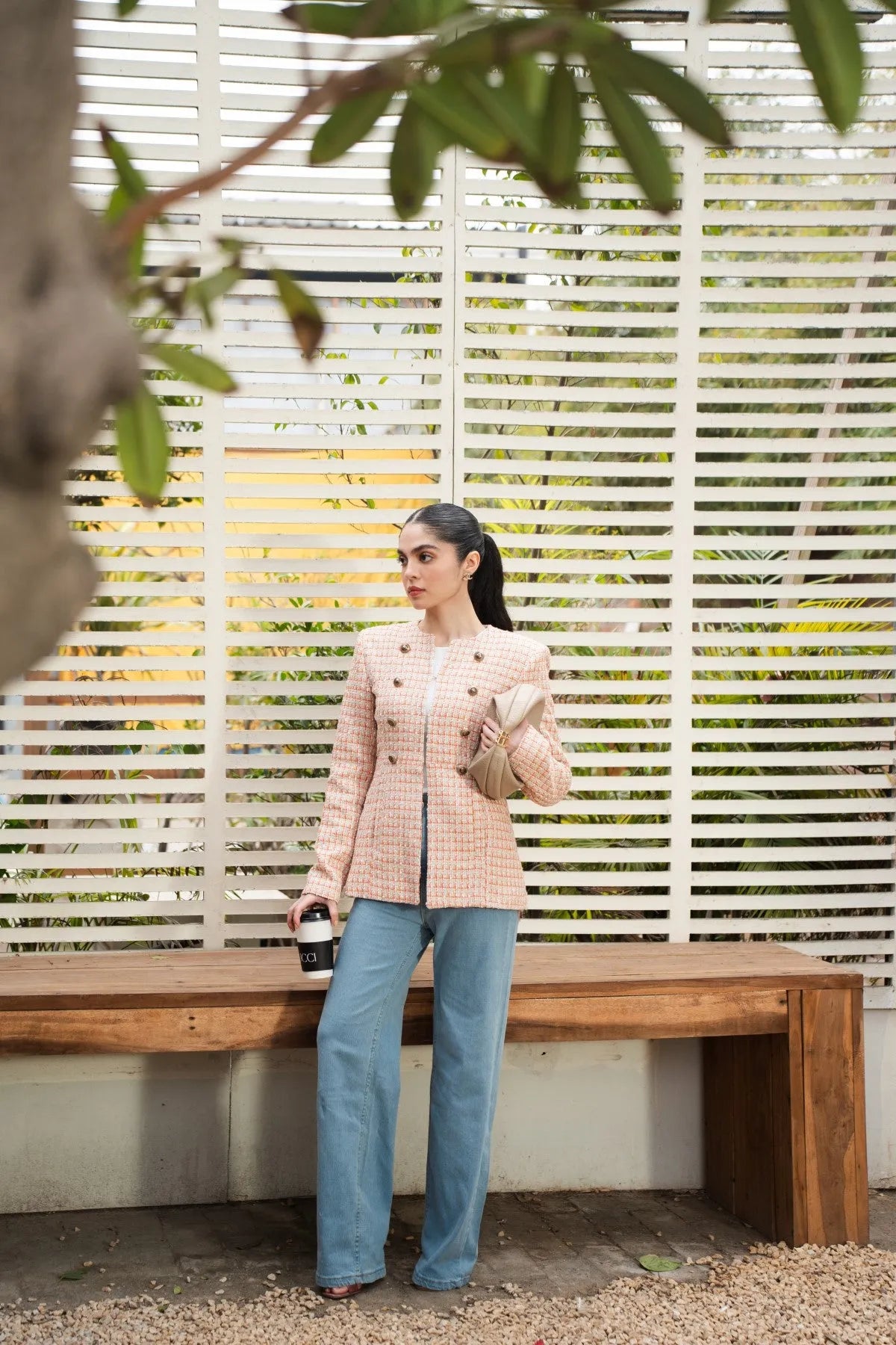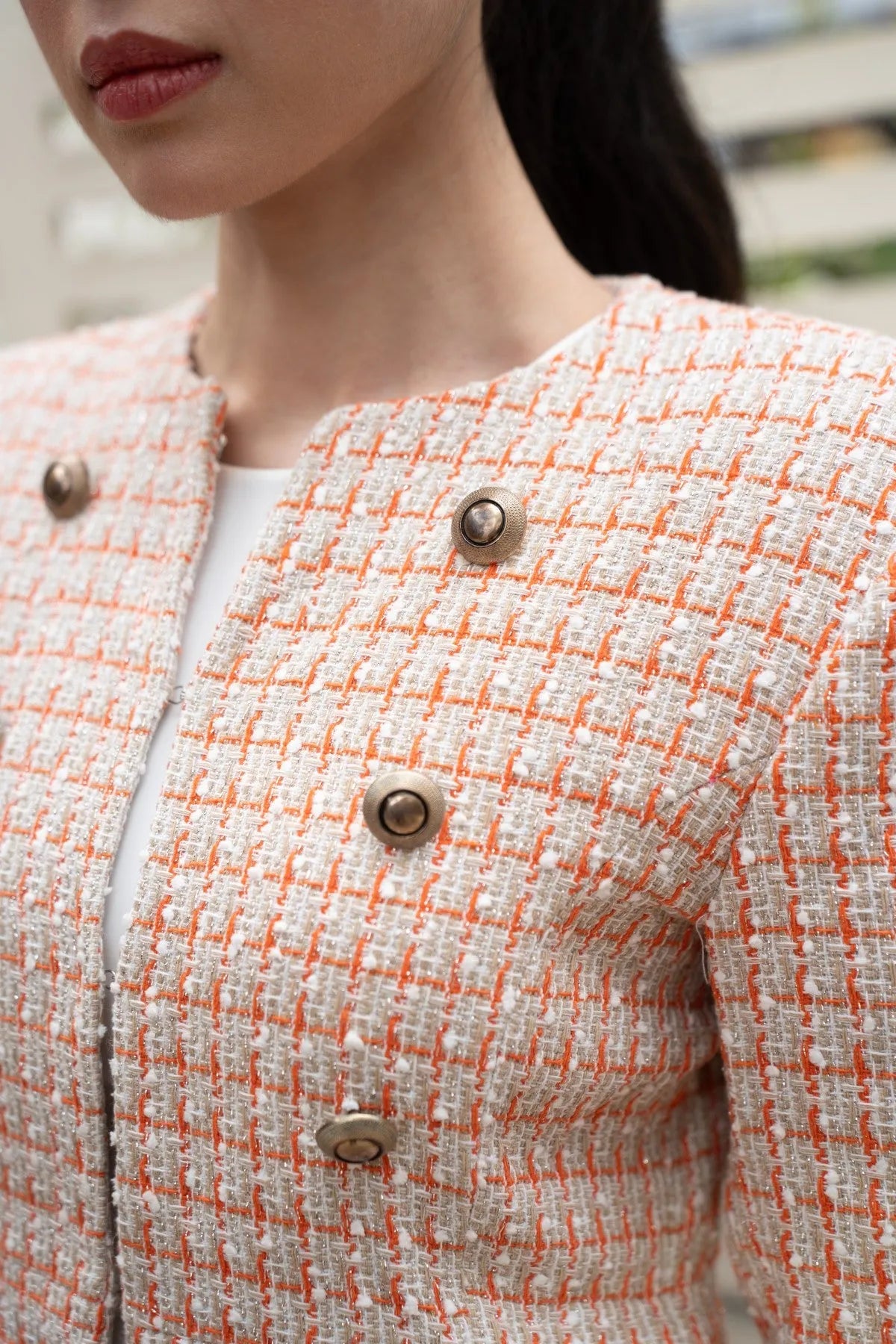 A sophisticated statement piece in vibrant orange. Crafted from luxurious beige tweed interwoven with orange and silver threads, this blazer exudes elegance. Featuring a round neckline with hook closures for a polished finish, it boasts two front pockets and gleaming gold buttons for added flair.