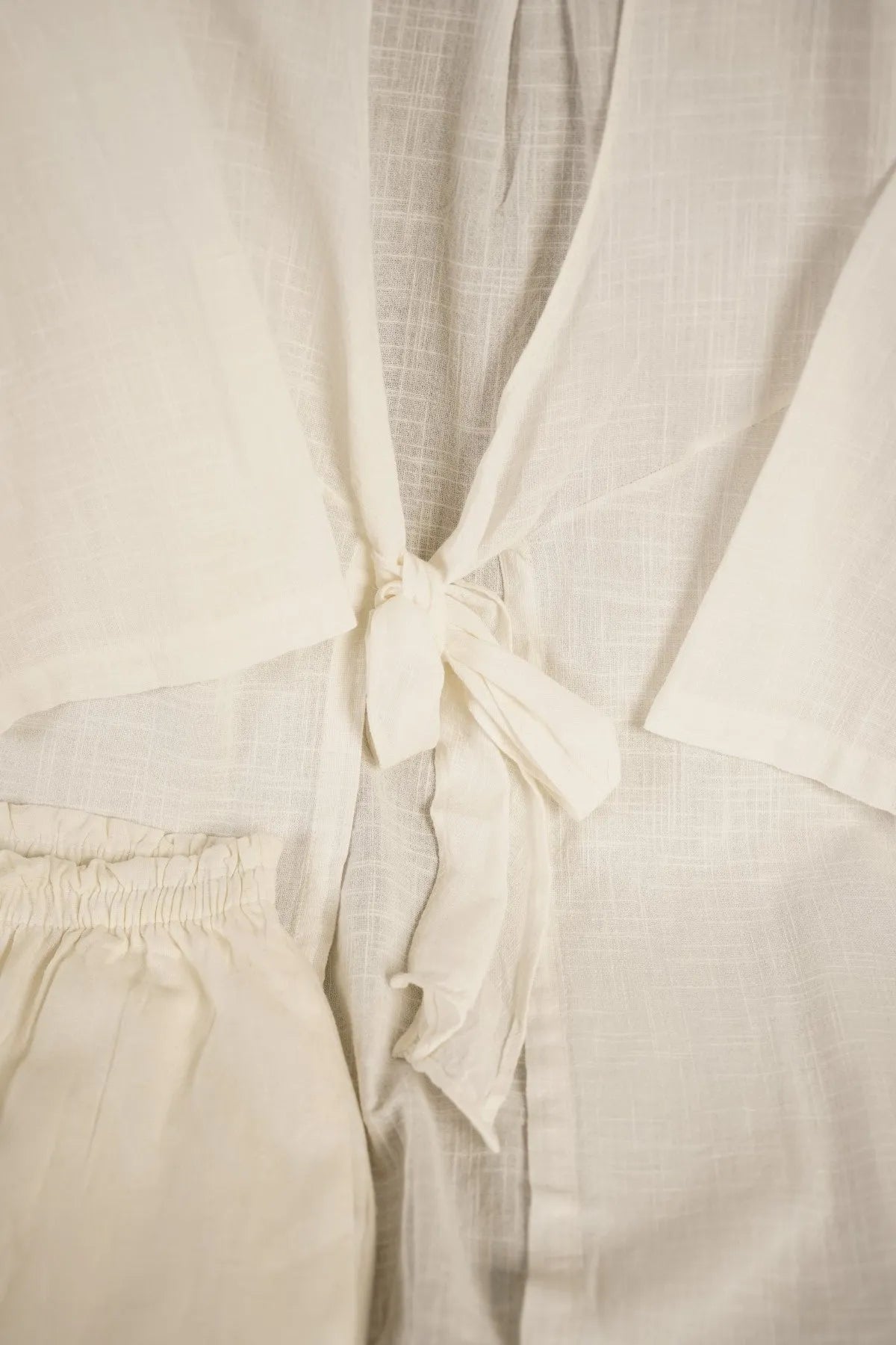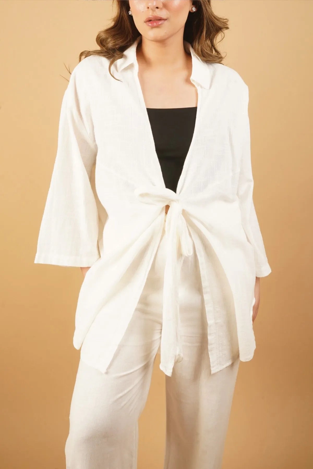 Made from breathable Linen fabric, this cover up offers a comfortable and flattering fit. The versatile front tie design and crisp white color make it perfect for layering over any beach outfit.