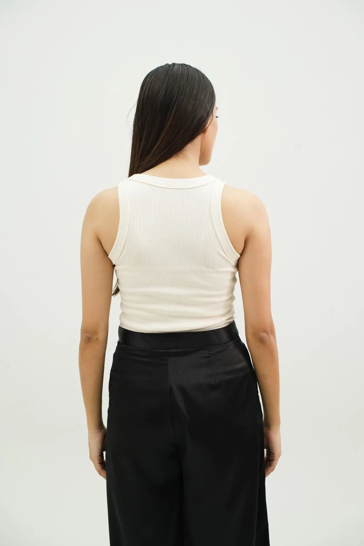 Crafted from soft rib knit fabric, this sleeveless top offers a snug and flattering fit. Versatile and comfortable, it's perfect for layering or wearing on its own.