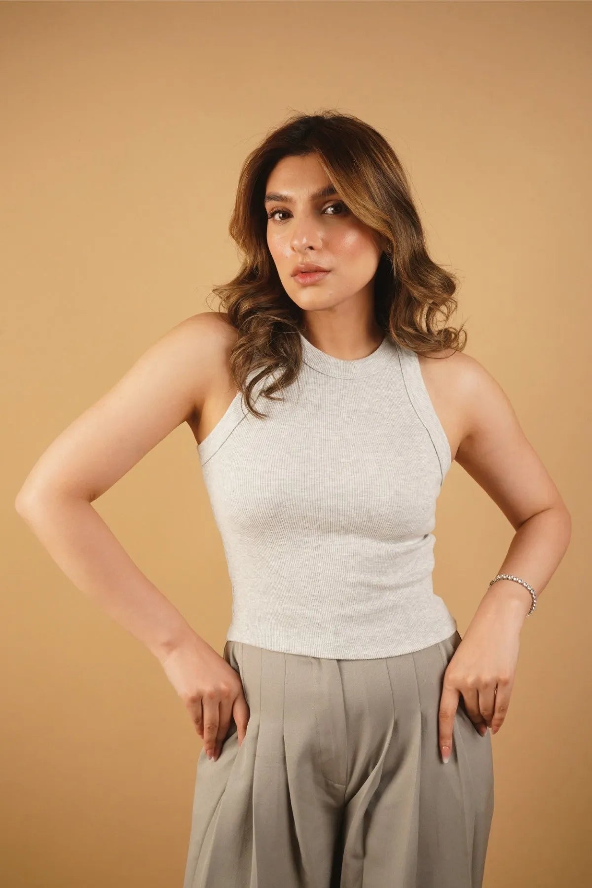 Crafted from soft rib knit fabric, this sleeveless top offers a snug and flattering fit. Versatile and comfortable, it's perfect for layering or wearing on its own.