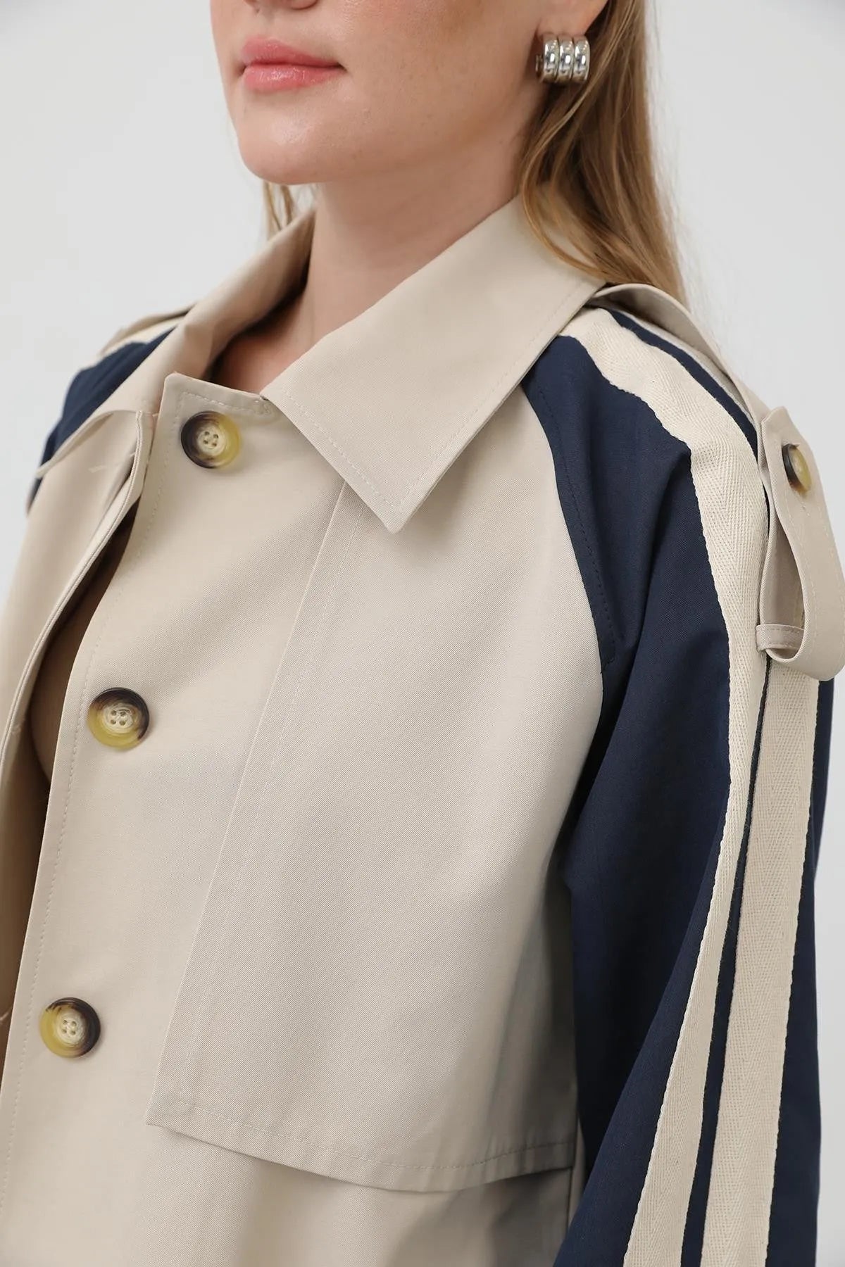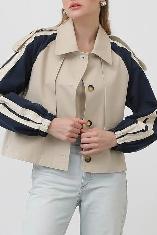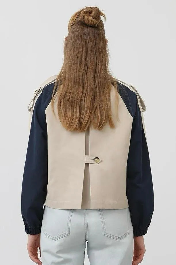 Equal parts utility and polish, this blue and white jacket is cut from a durable polyester blend that holds structure with ease. Front buttons run clean down the centre, while buttoned shoulder straps and a pleated back with support button add subtle definition. Full-length sleeves finish in a cinched elastic cuff for a more refined shape. Thoughtful front detailing rounds off the piece, giving it a styled look that doesn’t try too hard.