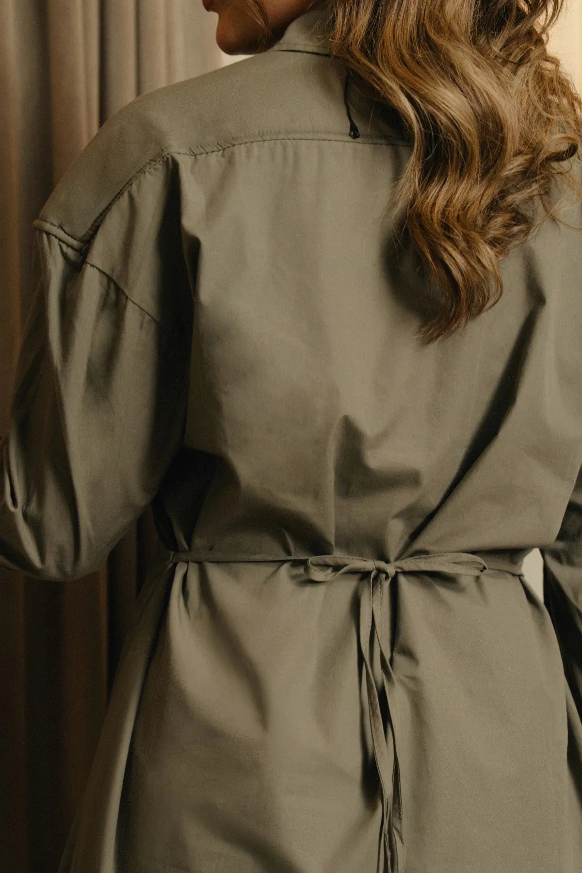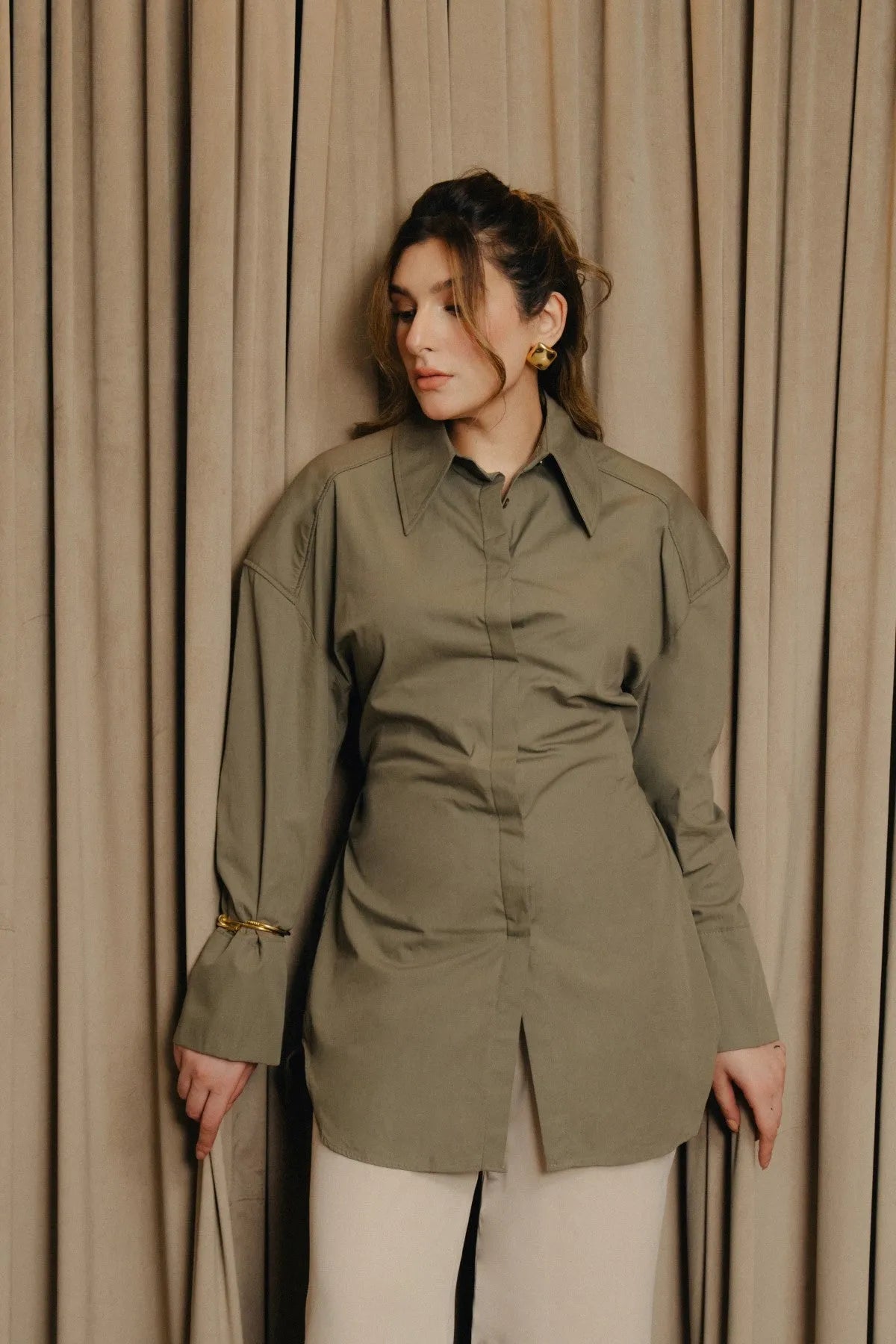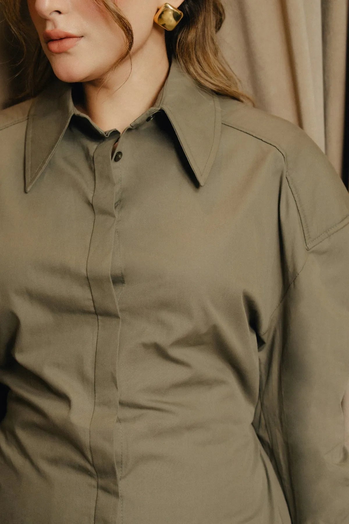 In sage green, this button-down shirt is cut from 100% cotton for a crisp yet breathable feel. The front closes with hidden buttons, keeping the surface clean and refined. A collared neckline and a defined waistband shape the design, while long sleeves finish in folded cuffs for a relaxed detail. Balanced between structure and ease, it’s a shirt that works across settings.