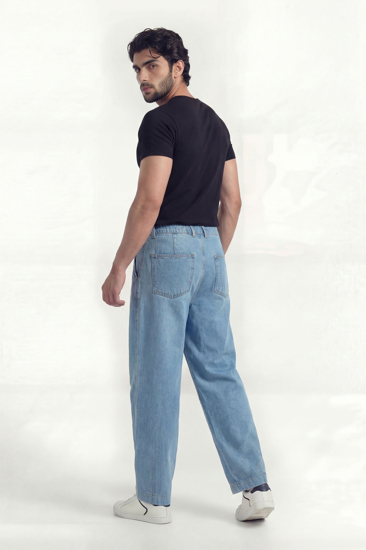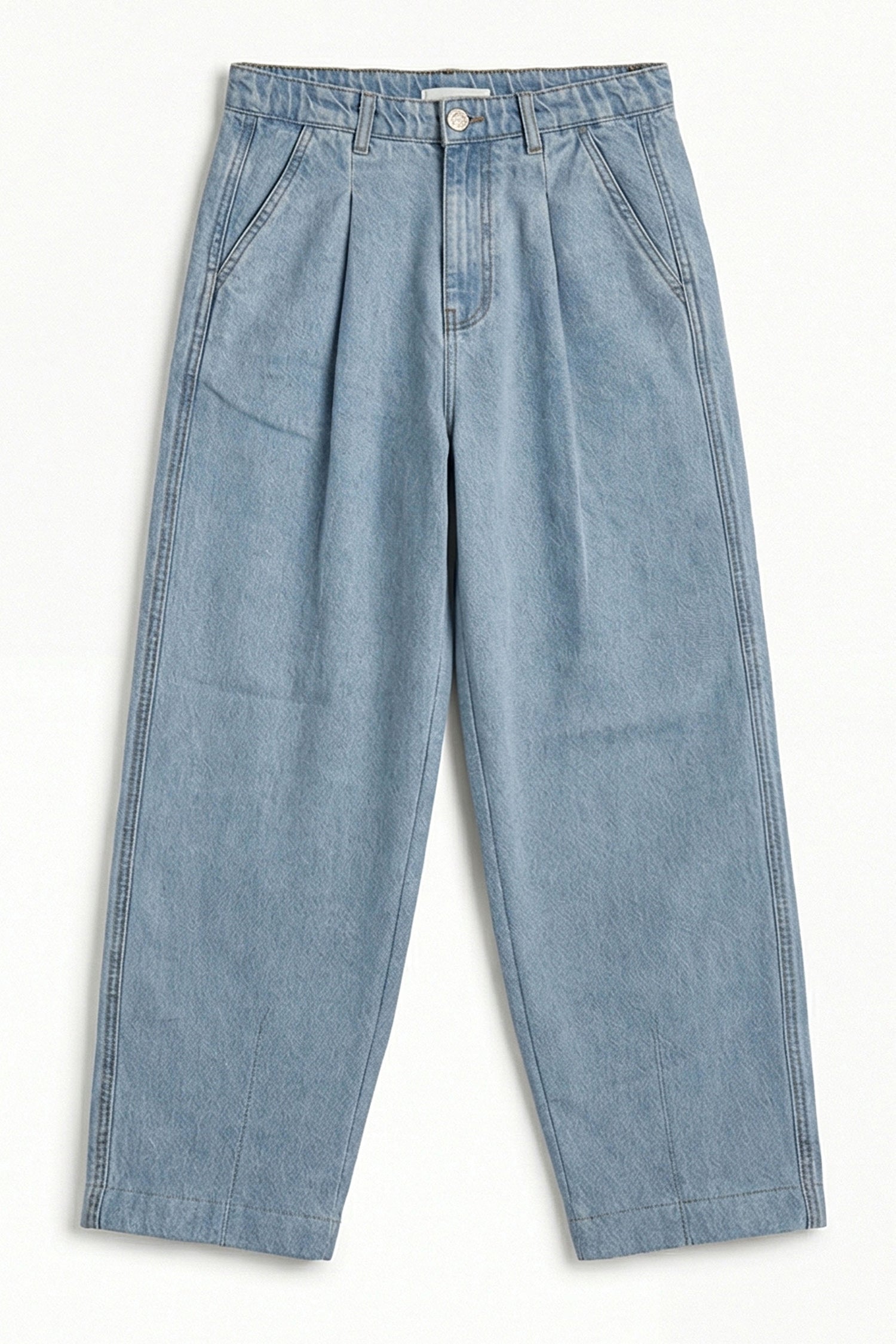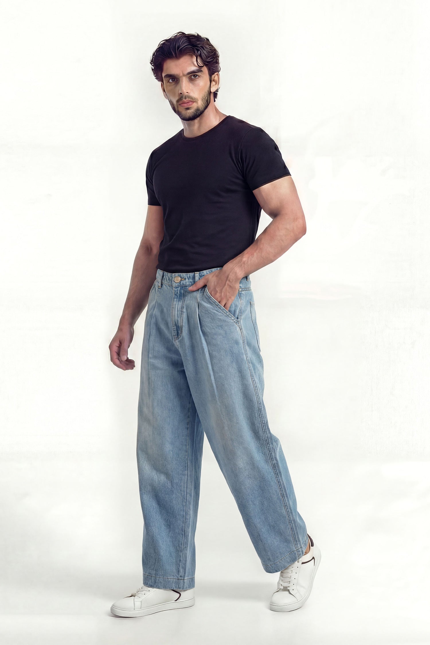 A straight-fit denim featuring soft front pleats and a clean light-wash finish. Designed for a relaxed yet refined streetwear look, offering comfort, structure, and everyday versatility
