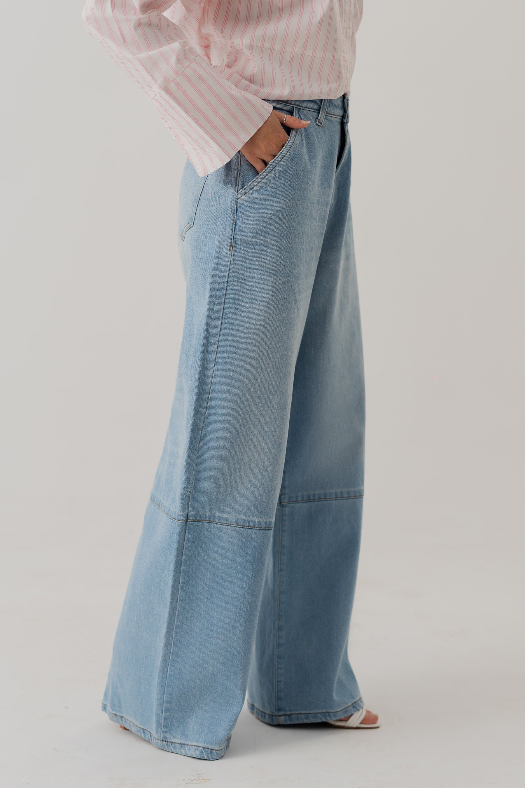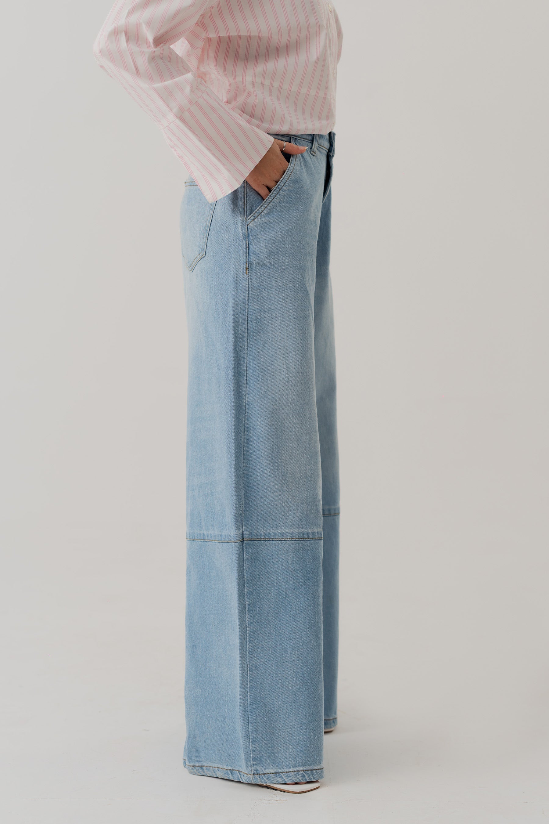 These light blue wide-leg, high-waisted jeans feature cut-and-sew panel detailing, belt loops, and a zip fly with button fastening. Full-length and stylish, they offer a flattering fit and a modern, relaxed silhouette.