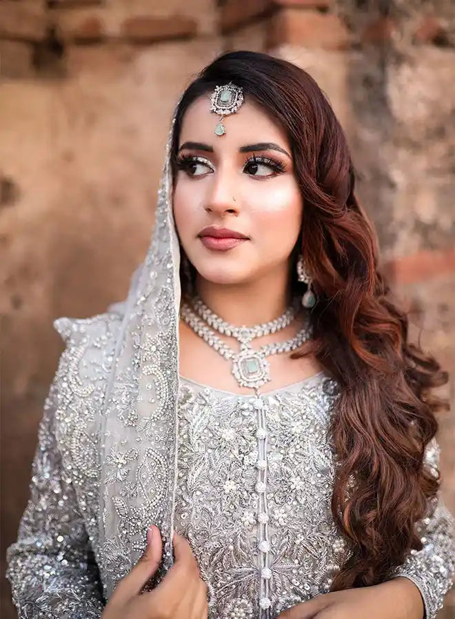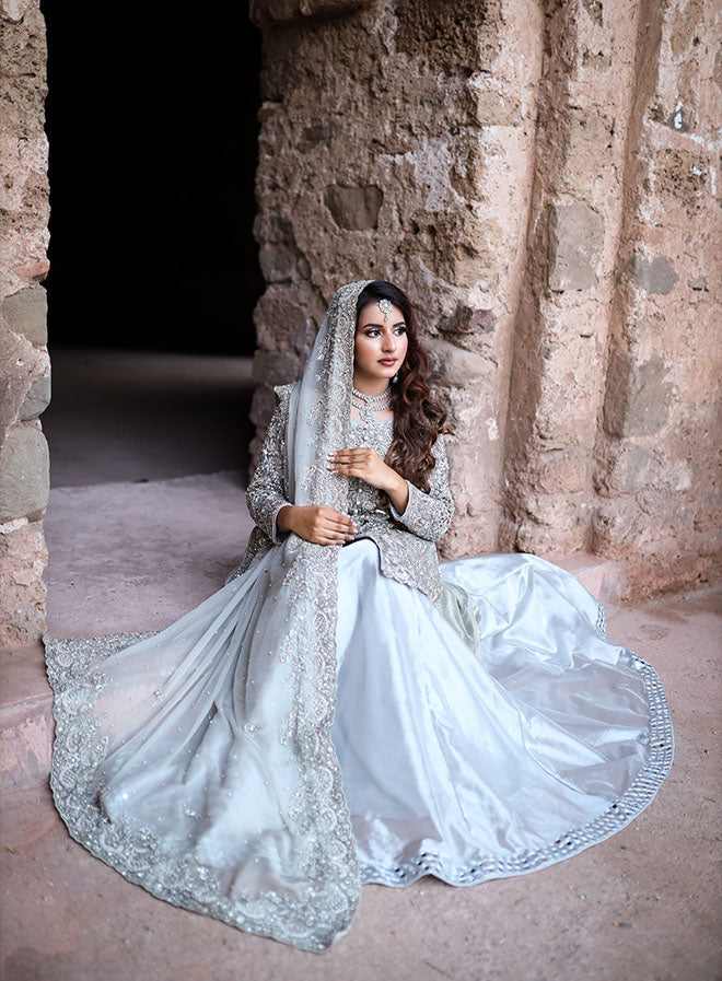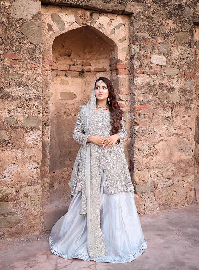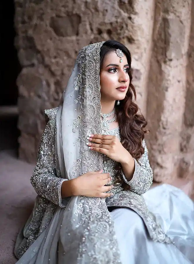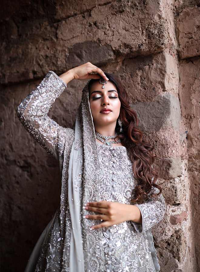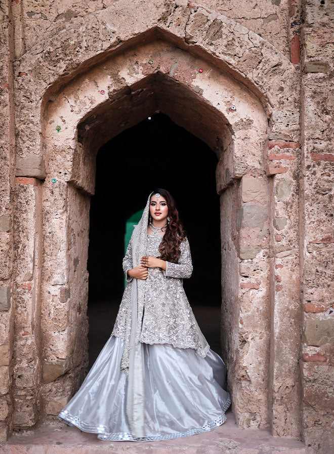 This luxurious bridal ensemble features a stunning shirt, an elegant lehnga, a flowing dupatta, and a stylish pouch/potli. The shirt is crafted from delicate net fabric, while the lehnga is made from luxurious organza tissue, both in a sophisticated silverish grey hue. The pure chiffon dupatta adds an ethereal touch to the outfit. This hand-worked ensemble showcases intricate detailing with exquisite qora, dabka, stone, and sequin embellishments, making it a perfect choice for brides who want to make a statement on their special day.