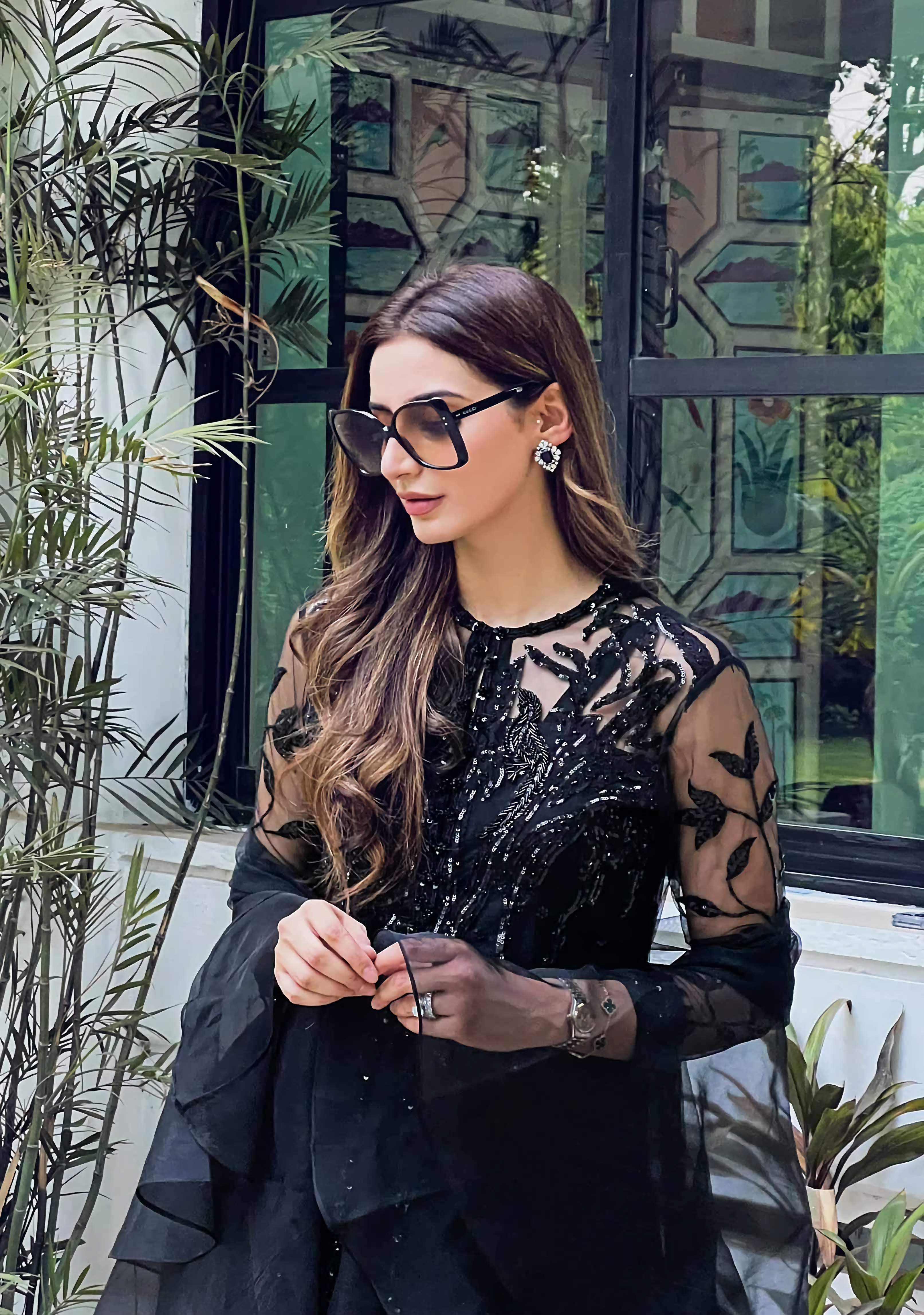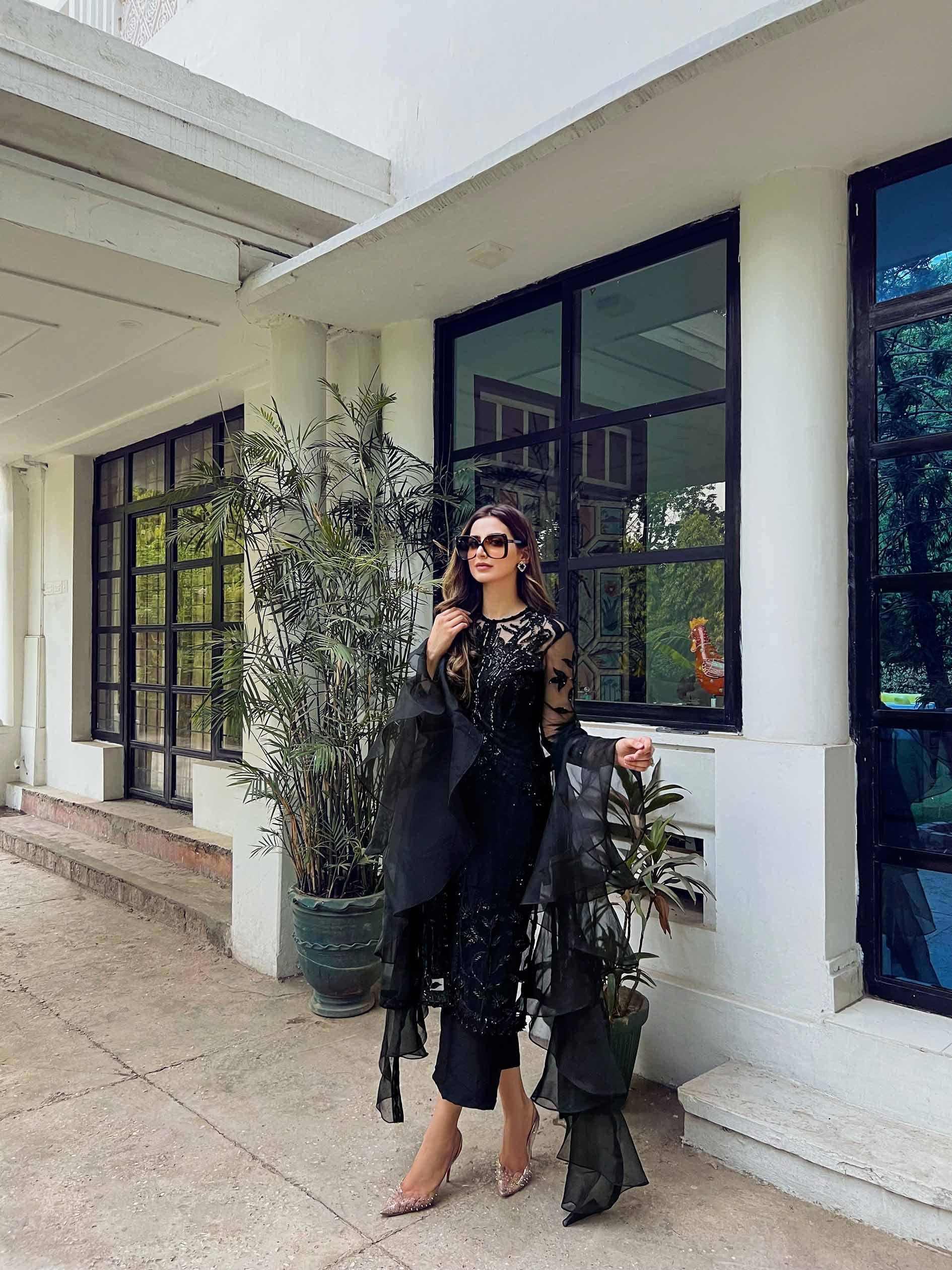 Black heavily embroidered front open shirt with hand embellishments on it, Paired with straight pants and ruffle dupatta.