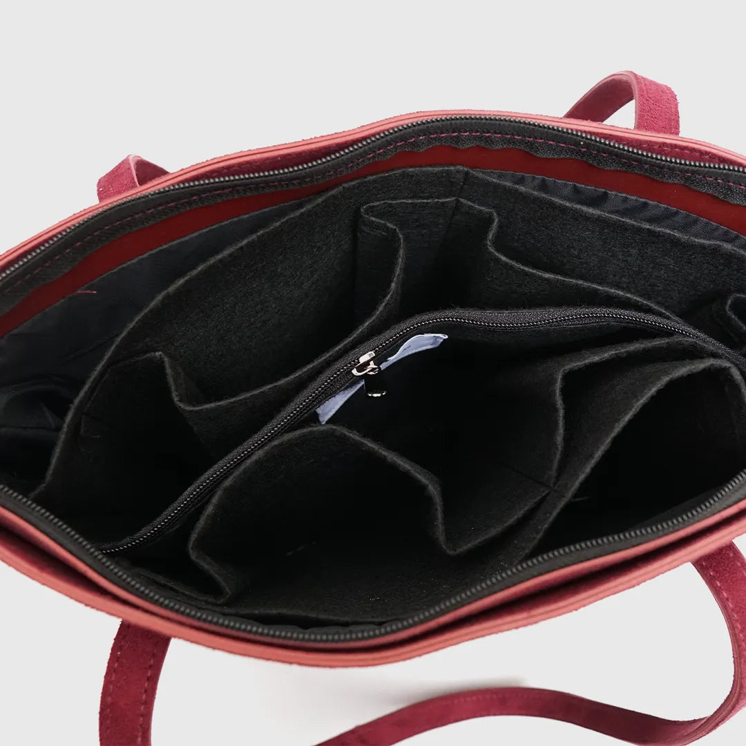 Designed for women who refuse to compromise between style and structure, the Suede maroon tote bag delivers clean sophistication with maximum functionality.