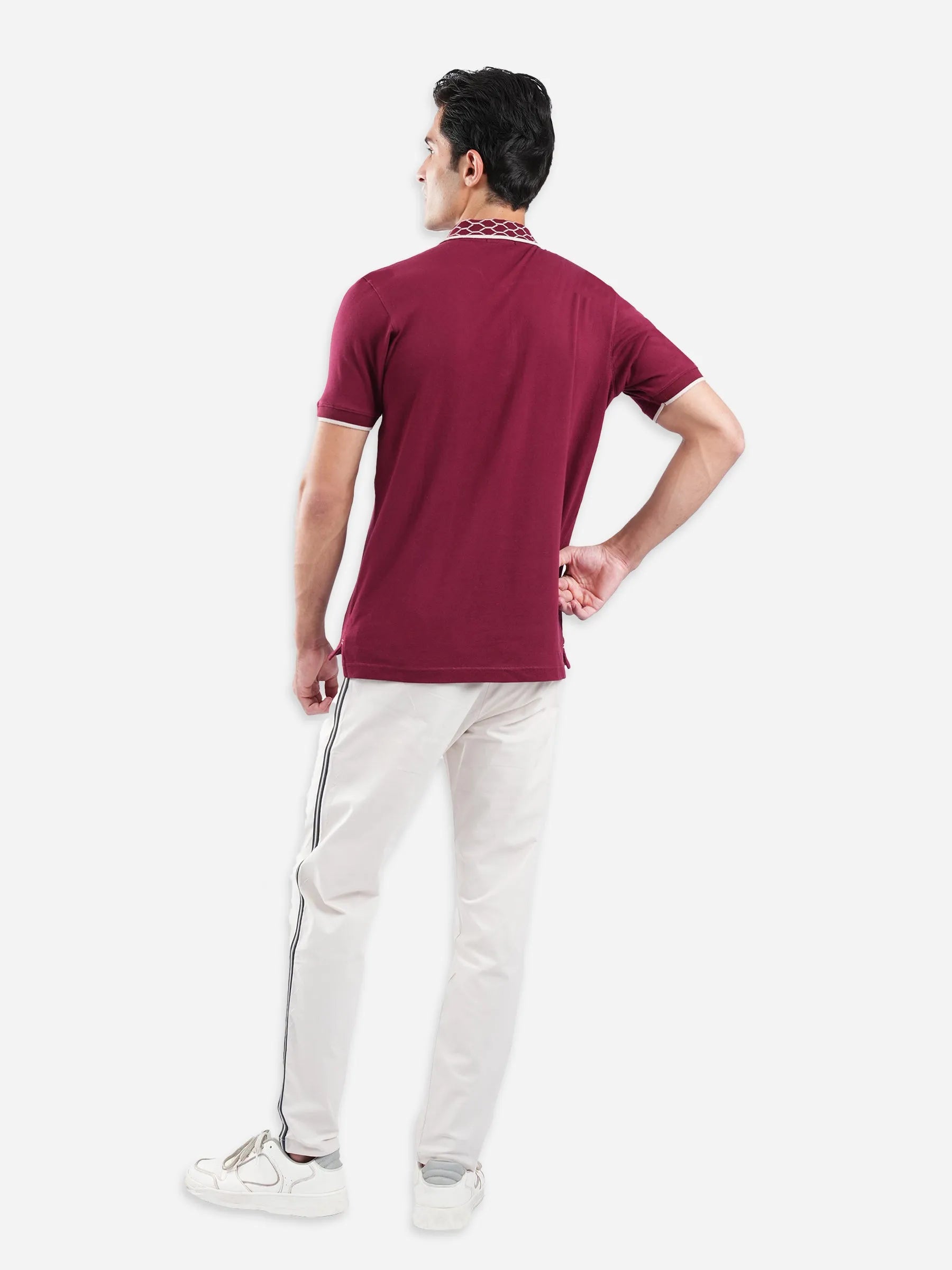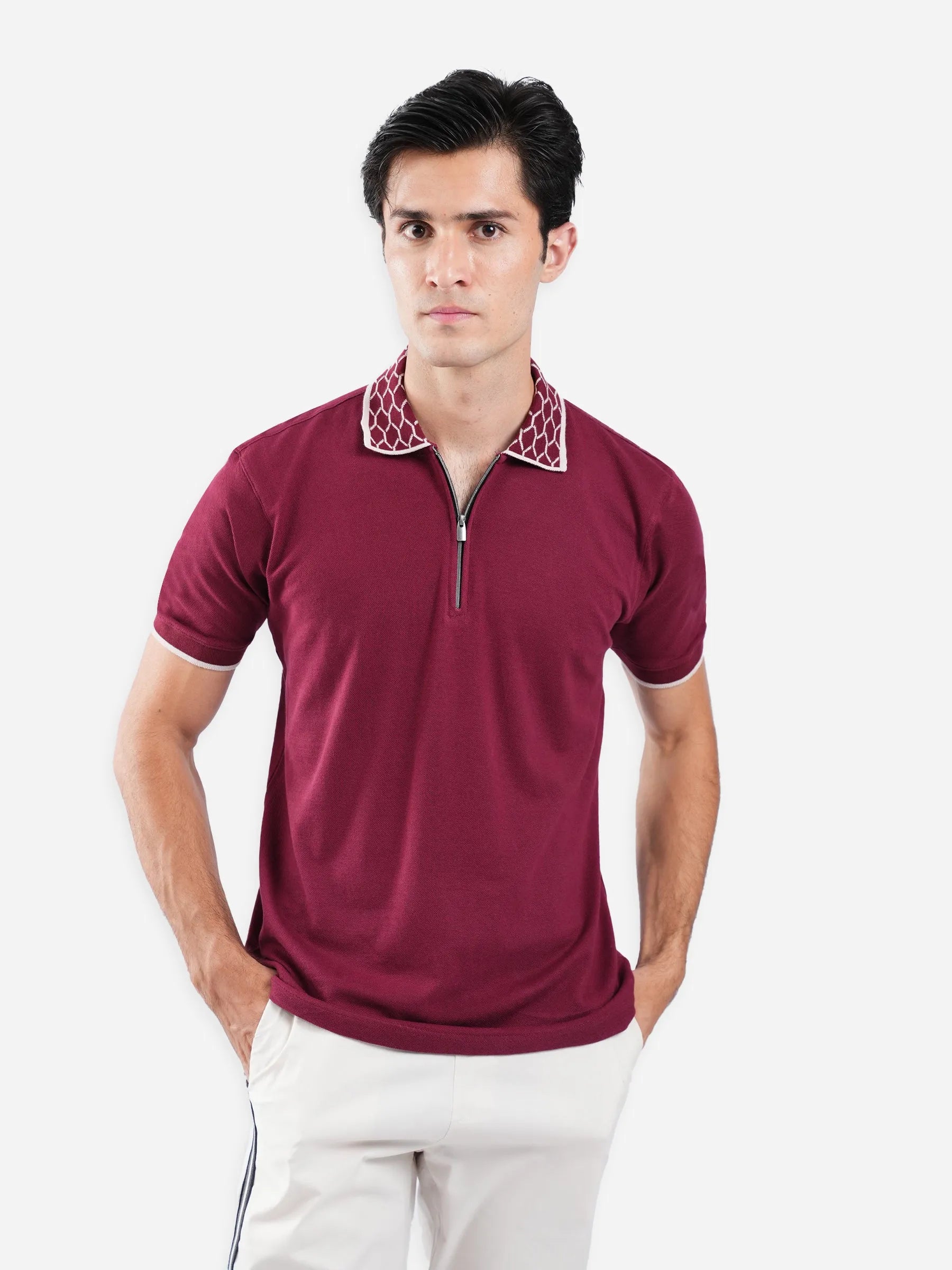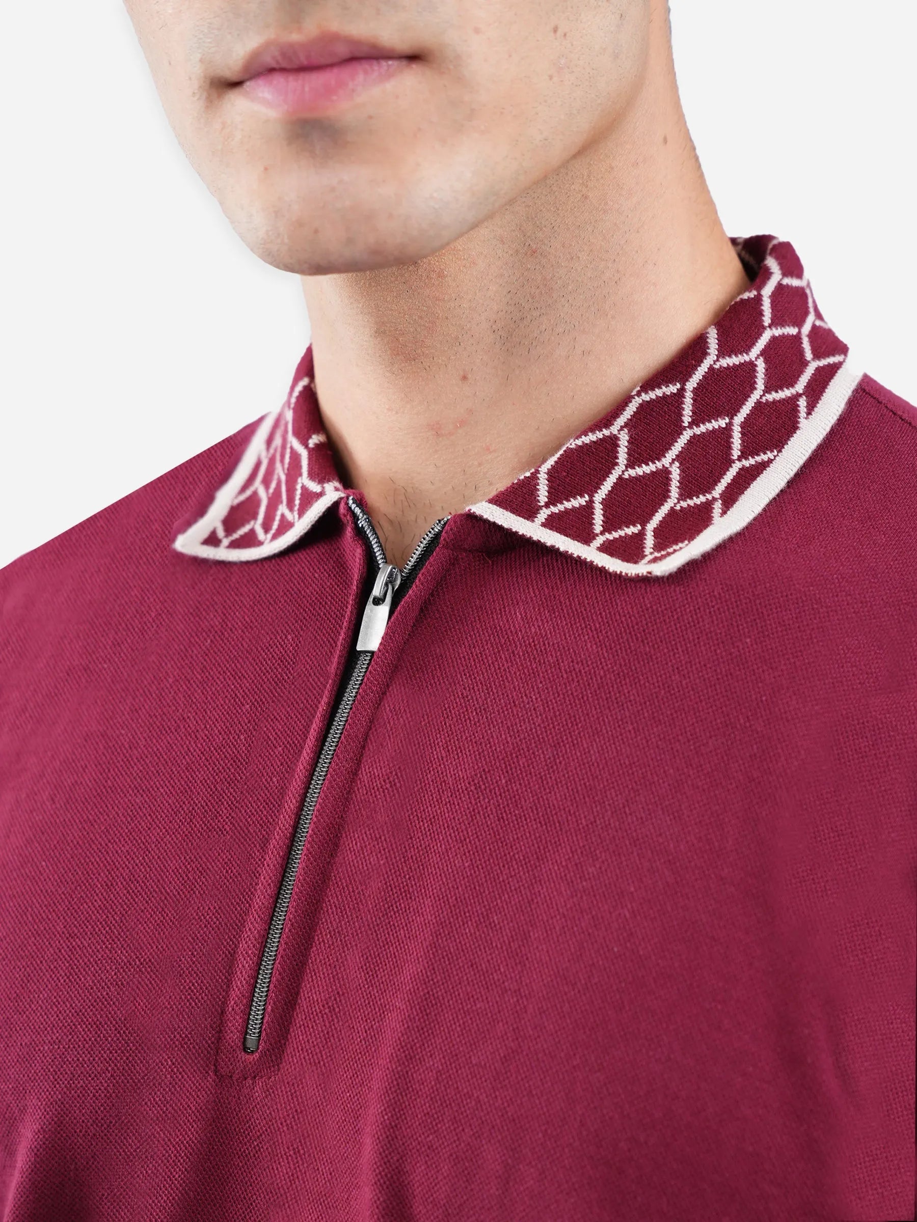 Upgrade your everyday style with this maroon zipper polo shirt featuring a jacquard collar. Made from high-quality pique fabric, this men's polo combines comfort with contemporary design. The stylish half-zip front adds a modern twist, while the textured jacquard collar brings a refined touch. Perfect for smart-casual looks, this maroon polo shirt transitions seamlessly from day to night.