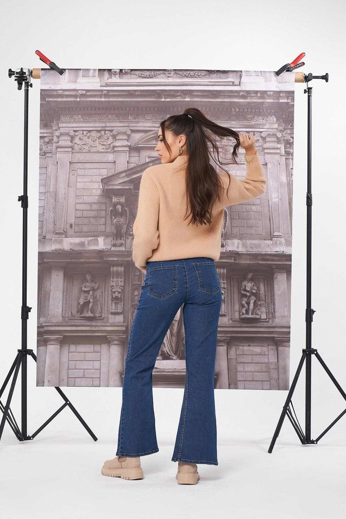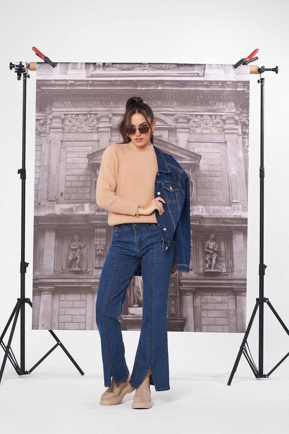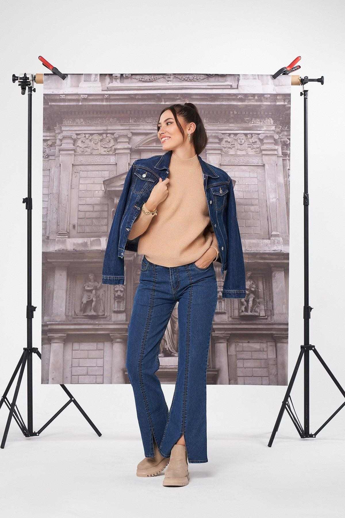 Denim. Classical And Comfortable Medium Wash Boot Cut Denim Jeans. Regular Waistband With Button And Loops. Front Slash Pockets. Contrast Seam Details. Rear Yoke And Patch Pockets. Wide Hem With Slits