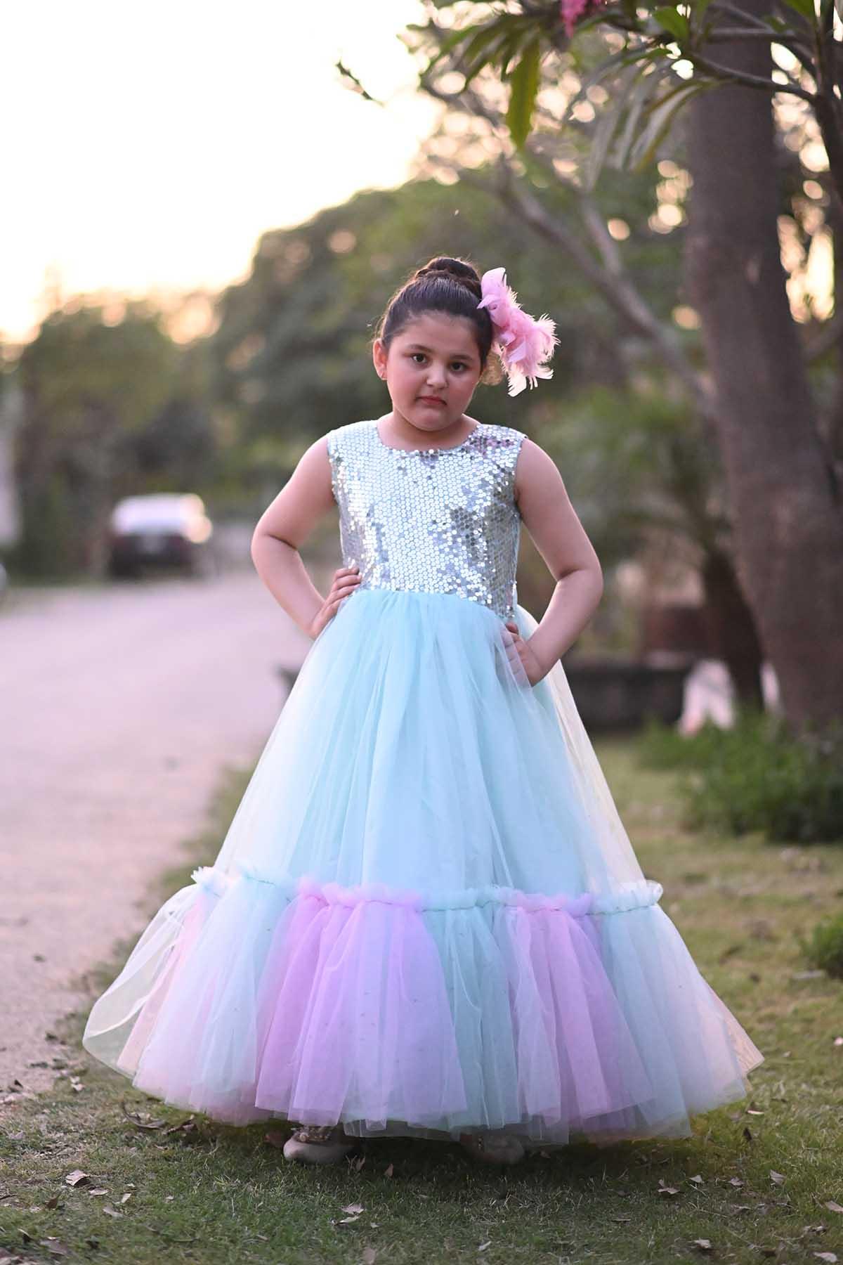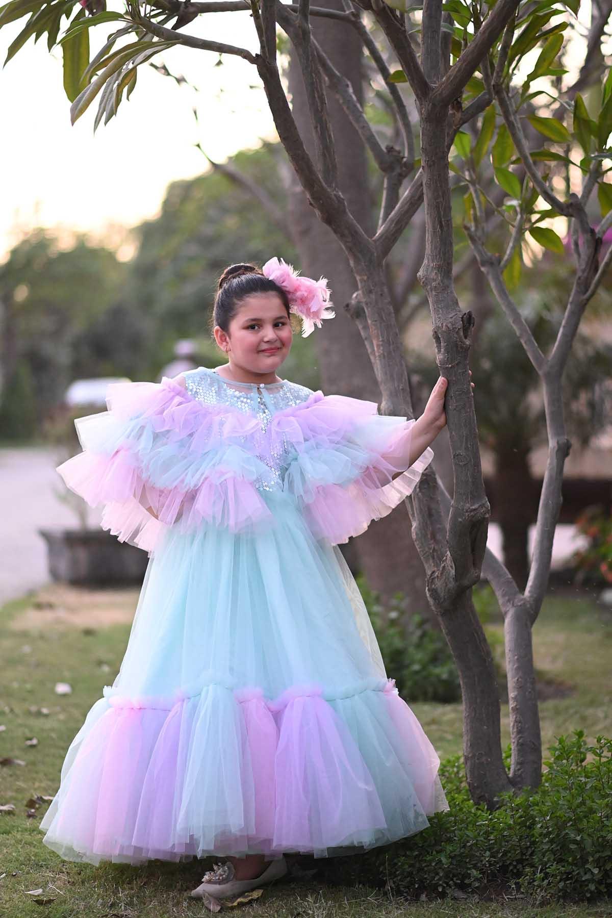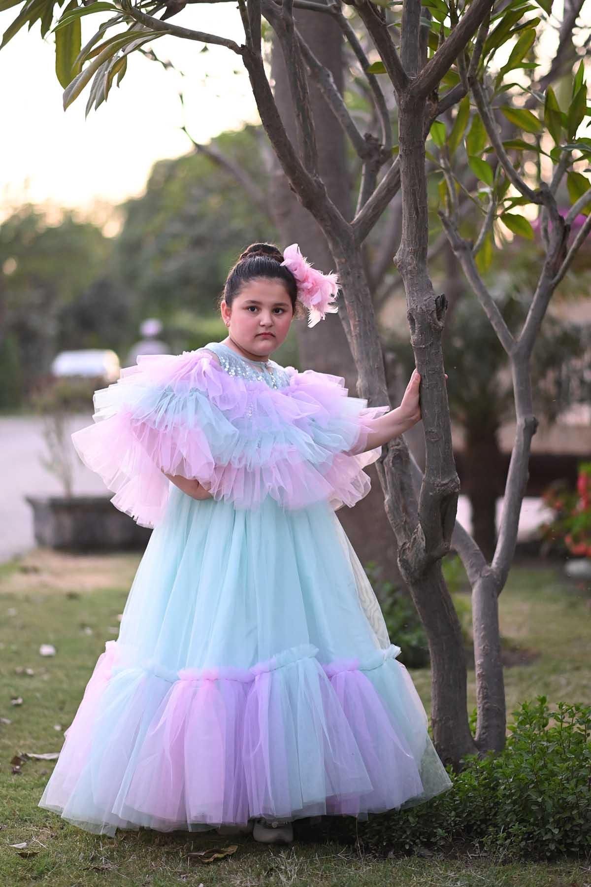Introducing the Mehar-i-mah Rainbow Dress – a majestic royal gown that captivates with its enchanting blend of colors and textures. The ethereal base crafted from breeze net sets the stage for the shimmering allure of the body made with delicate shimmer net. The inner layer, crafted from imported silk, ensures a regal feel against the skin. Adorned with meticulous detail, sequins sparkle, and ruffles cascade gracefully on the cape, creating a gown fit for royalty.