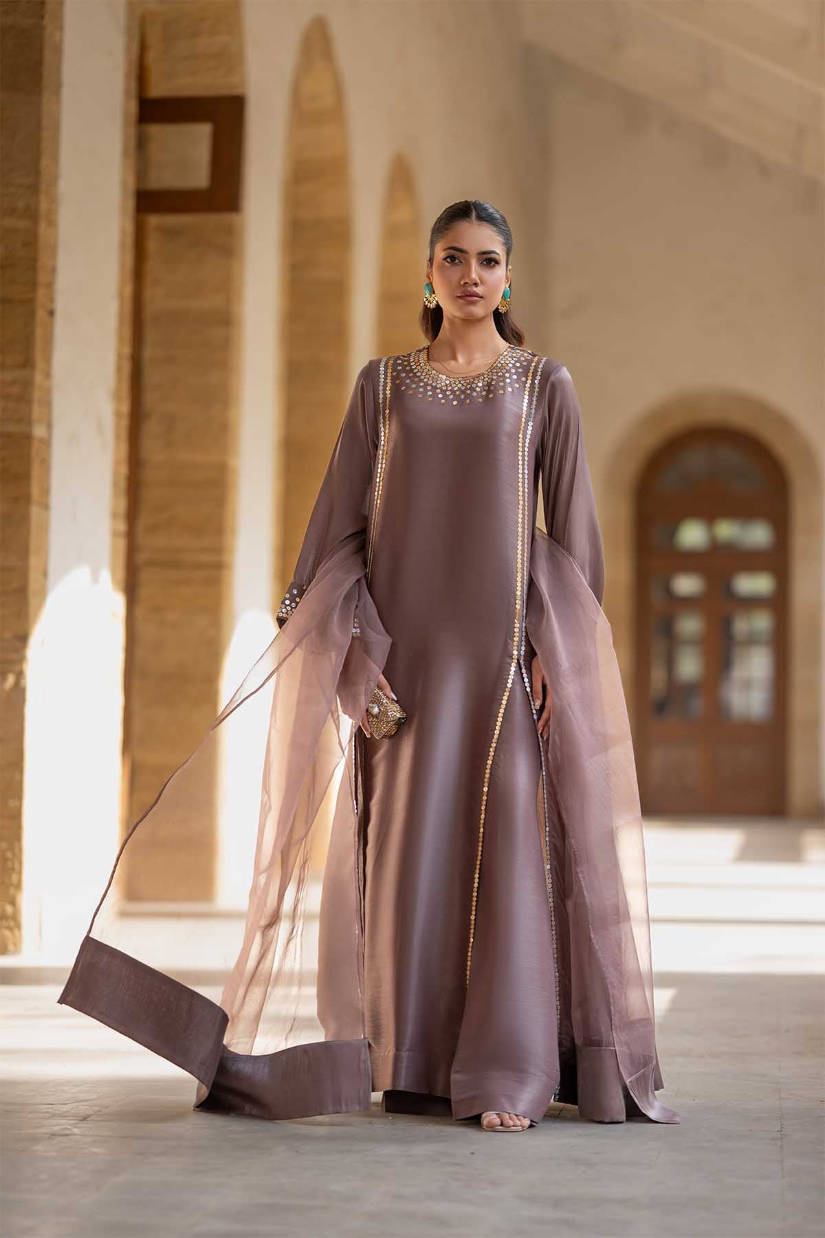 Meethi Yaadein-Eid Festive:A Refined, Contemporary Ethnic Ensemble In A Muted Mauve-Brown Tone, This Outfit Exudes Understated Luxury. The Long, Straight-Cut Kurta Is Crafted From A Lustrous, Lightweight Sheesha Silk Fabric That Drapes Fluidly, Creating An Elegant Silhouette. Delicate Gold-Toned Embellishments Accent The Neckline In A Subtle, Scattered Pattern, Adding A Soft Shimmer Without Overwhelming The Design. Vertical Lines Of Sequins Run Down The Front And Along The Side Slits, Elongating The Form And Lending A Graceful Movement To The Outfit.