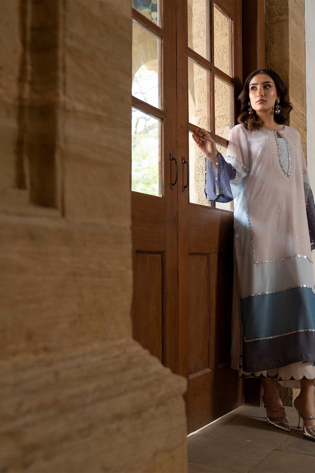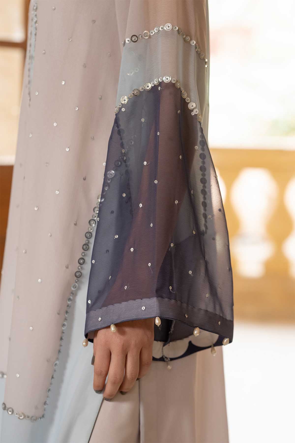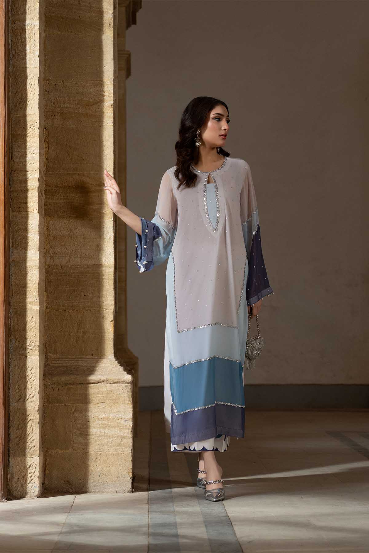 Meethi Yaadein -Eid Festive:This Refined Ensemble Showcases A Color-Blocked Printed Shirt Crafted In Lightweight Chiffon, Designed To Flow Effortlessly With Movement. The Shirt Features Soft Tonal Panels That Transition Gracefully, Enhanced With Intricate Hand Embroidery Scattered Across The Surface, Adding Texture And A Subtle Shimmer. A Delicately Shaped Neckline, Finished With Handwork Detailing, Lends A Polished And Feminine Touch, While The Sheer Statement Sleeves Echo The Color-Blocked Design For A Cohesive Look.