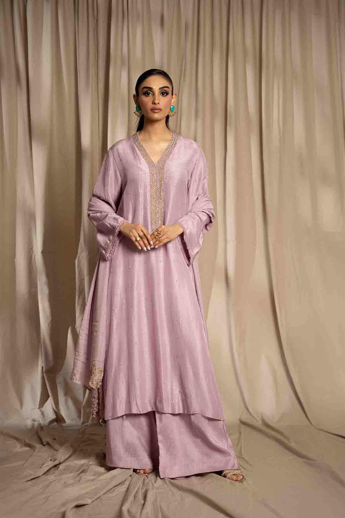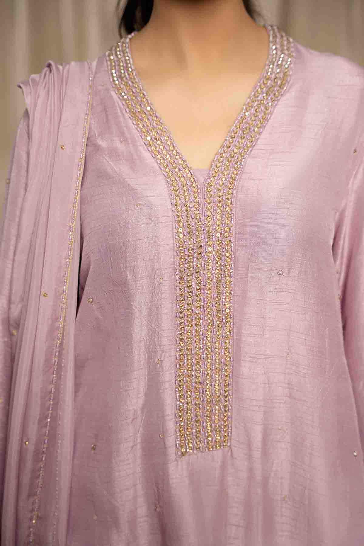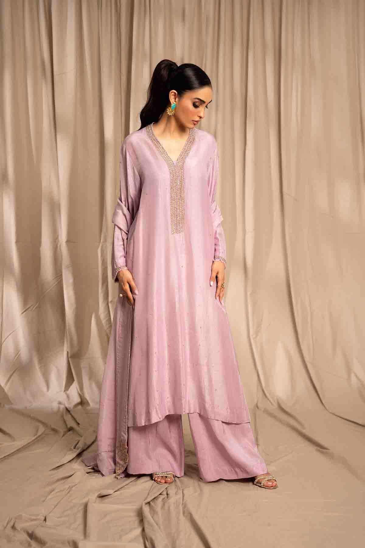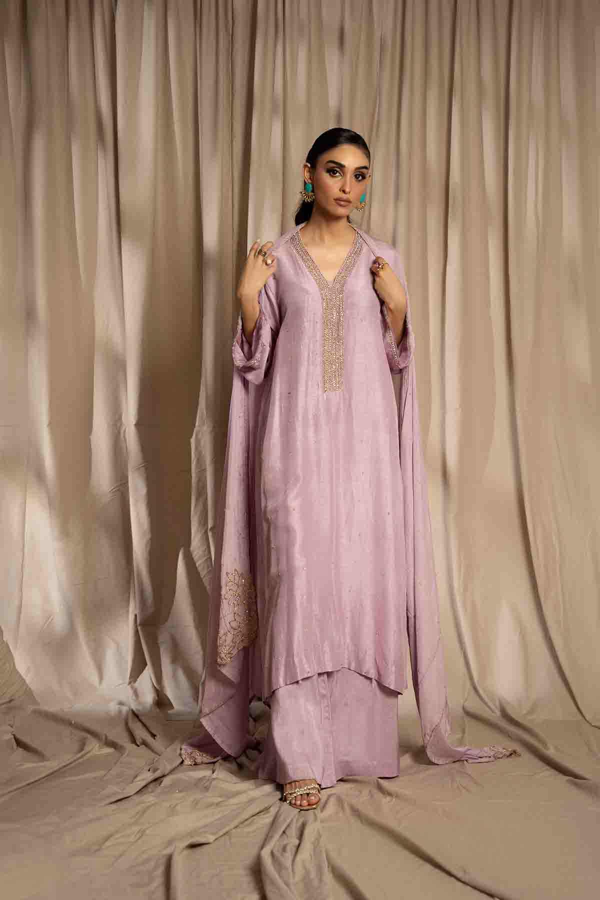 LIA - Festive Formal: The Ensemble Features A Lilac Korean Raw Silk Long Shirt Embellished With Delicate Swarovski Linear Neckline And Chaan All Over.  Full Sleeves Finished With Frayed Edges. And Culottes With Medium Silk Dupatta Adorned With Swarovski And Lotus Inspired Cutwork Embroidered Edges. A Relaxed Charm This Festive Season.