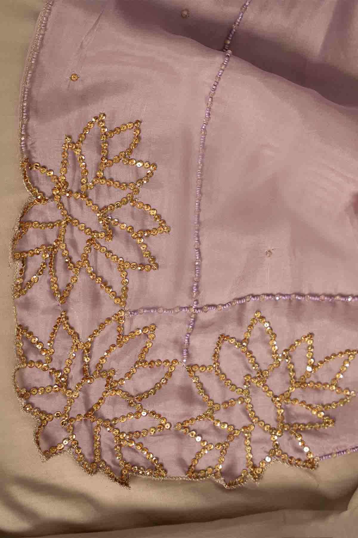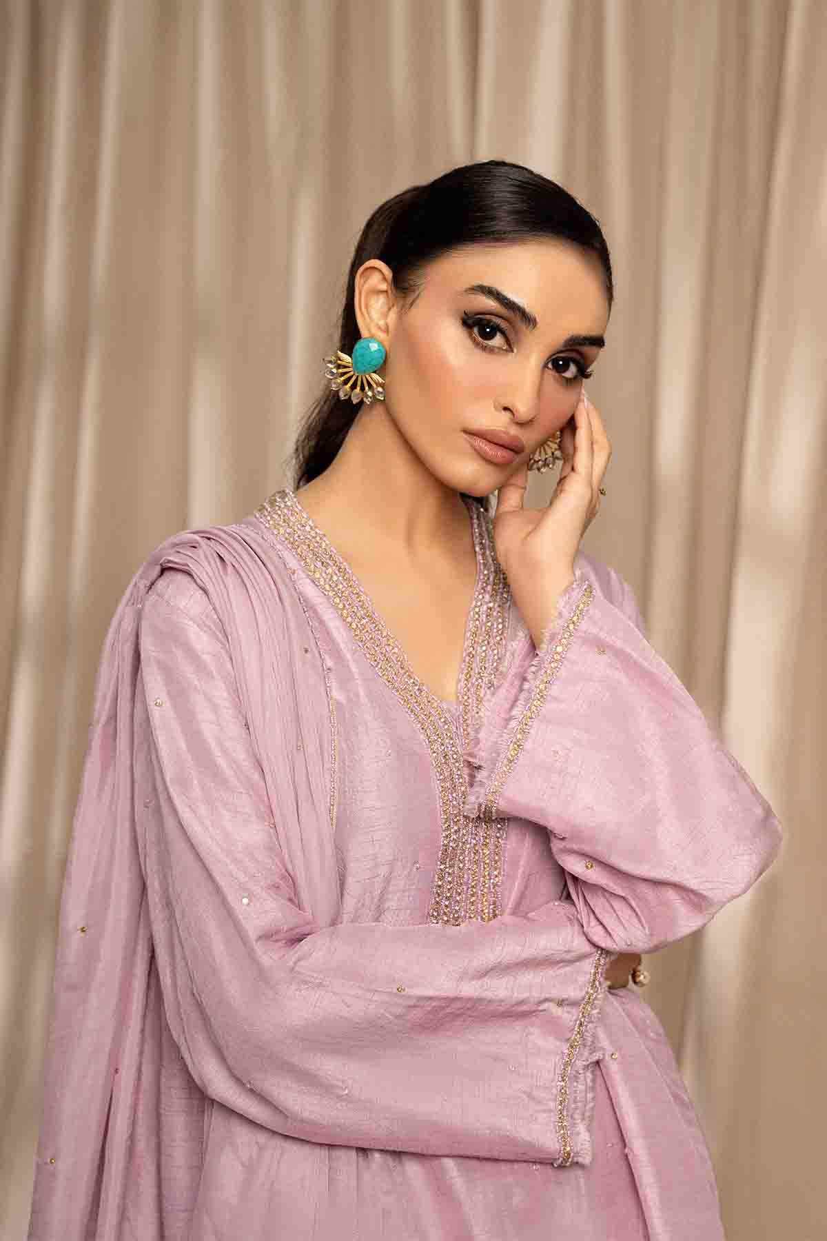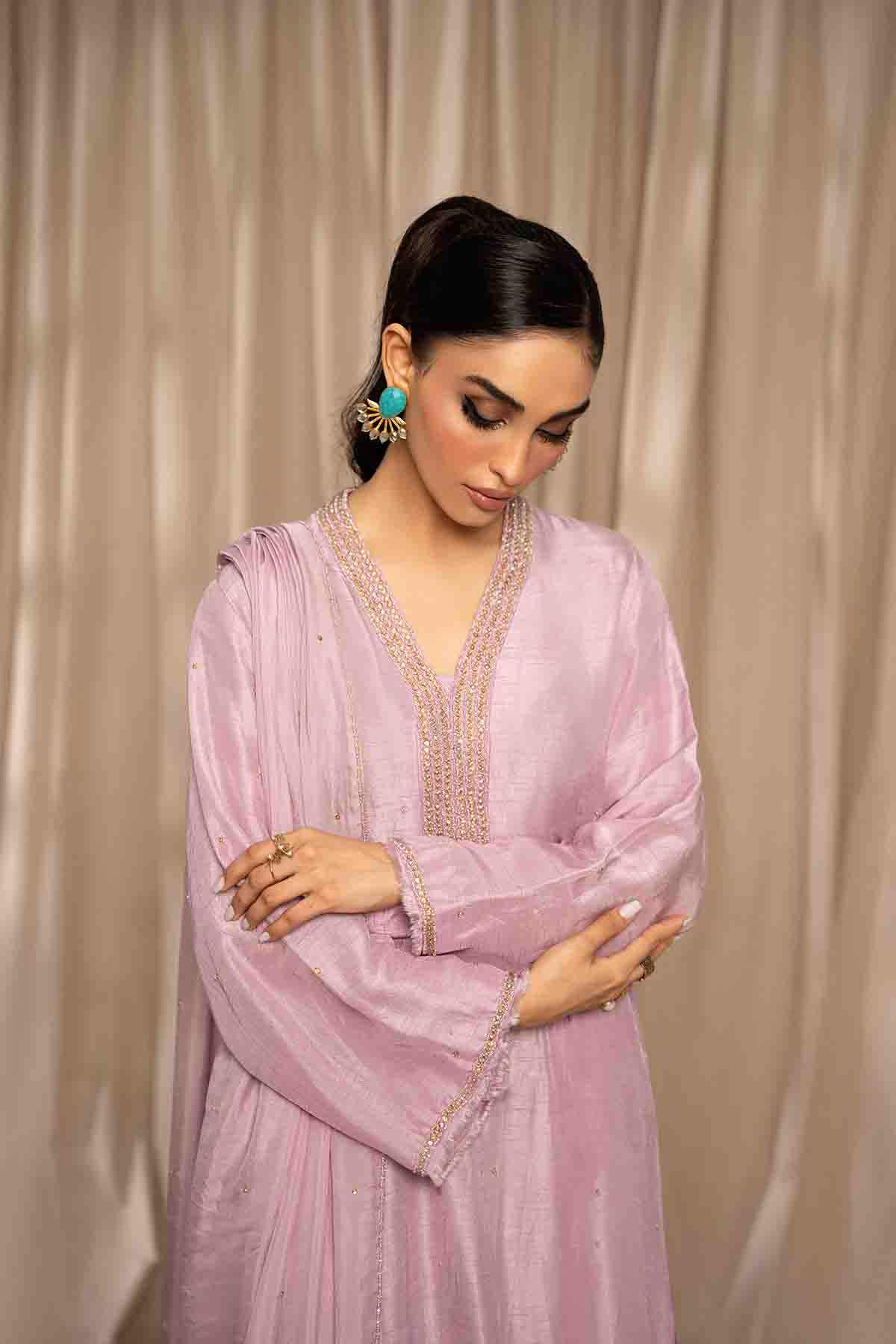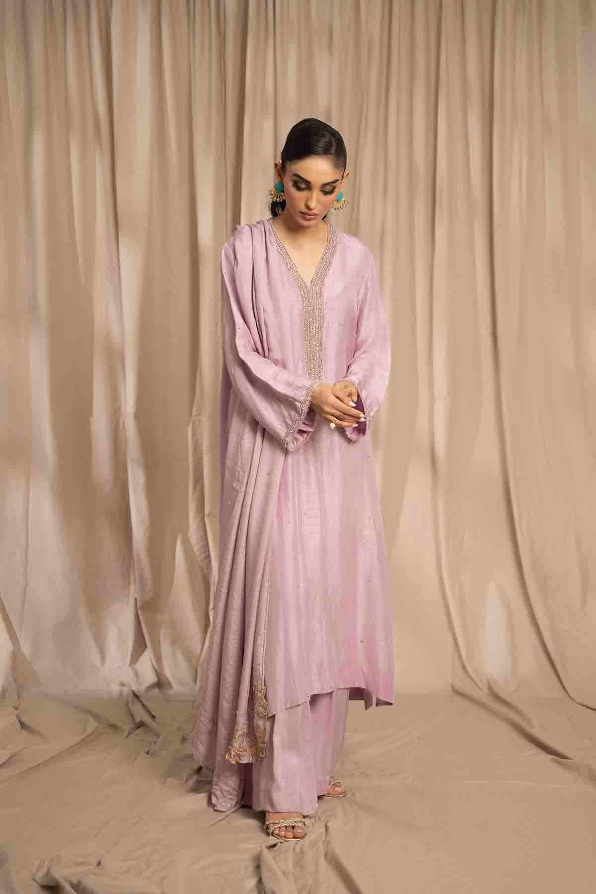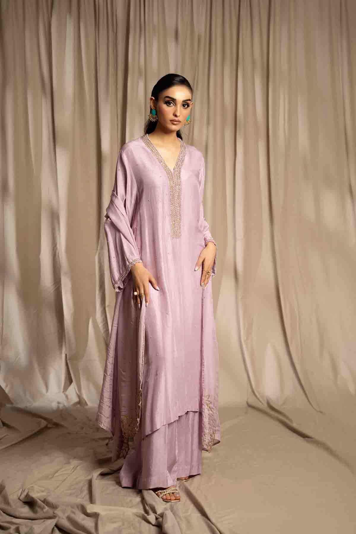 LIA - Festive Formal: The Ensemble Features A Lilac Korean Raw Silk Long Shirt Embellished With Delicate Swarovski Linear Neckline And Chaan All Over.  Full Sleeves Finished With Frayed Edges. And Culottes With Medium Silk Dupatta Adorned With Swarovski And Lotus Inspired Cutwork Embroidered Edges. A Relaxed Charm This Festive Season.