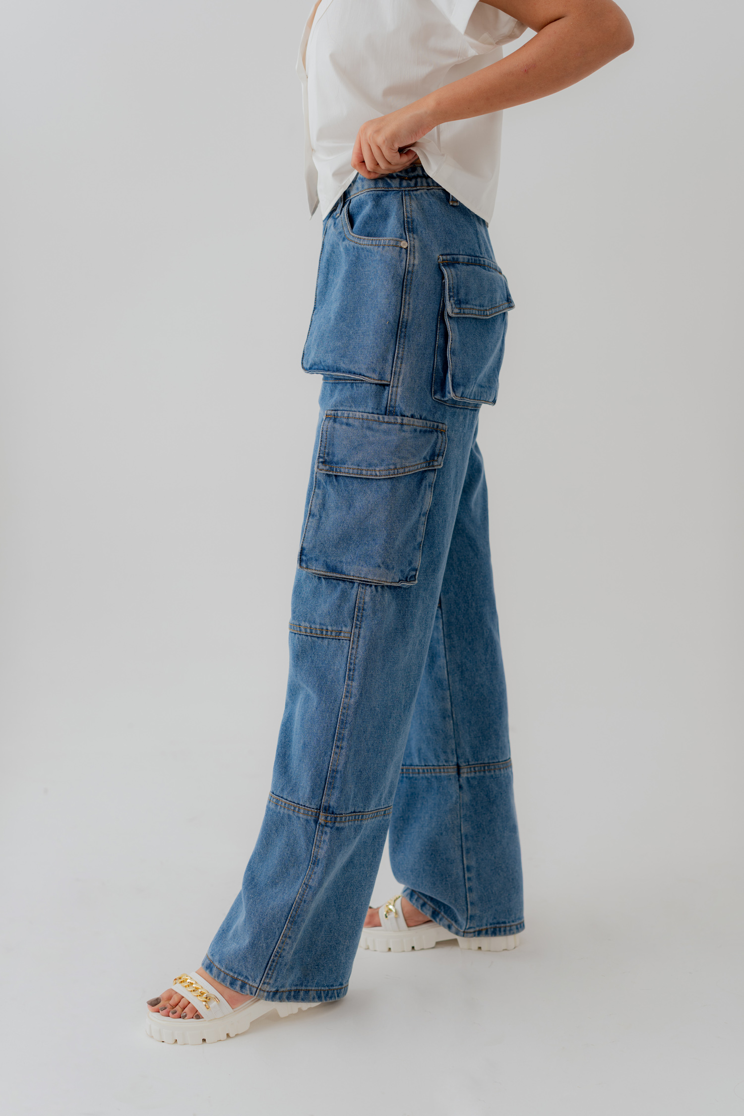 Mid Blue Denim Wide leg Cargo Pockets Jeans