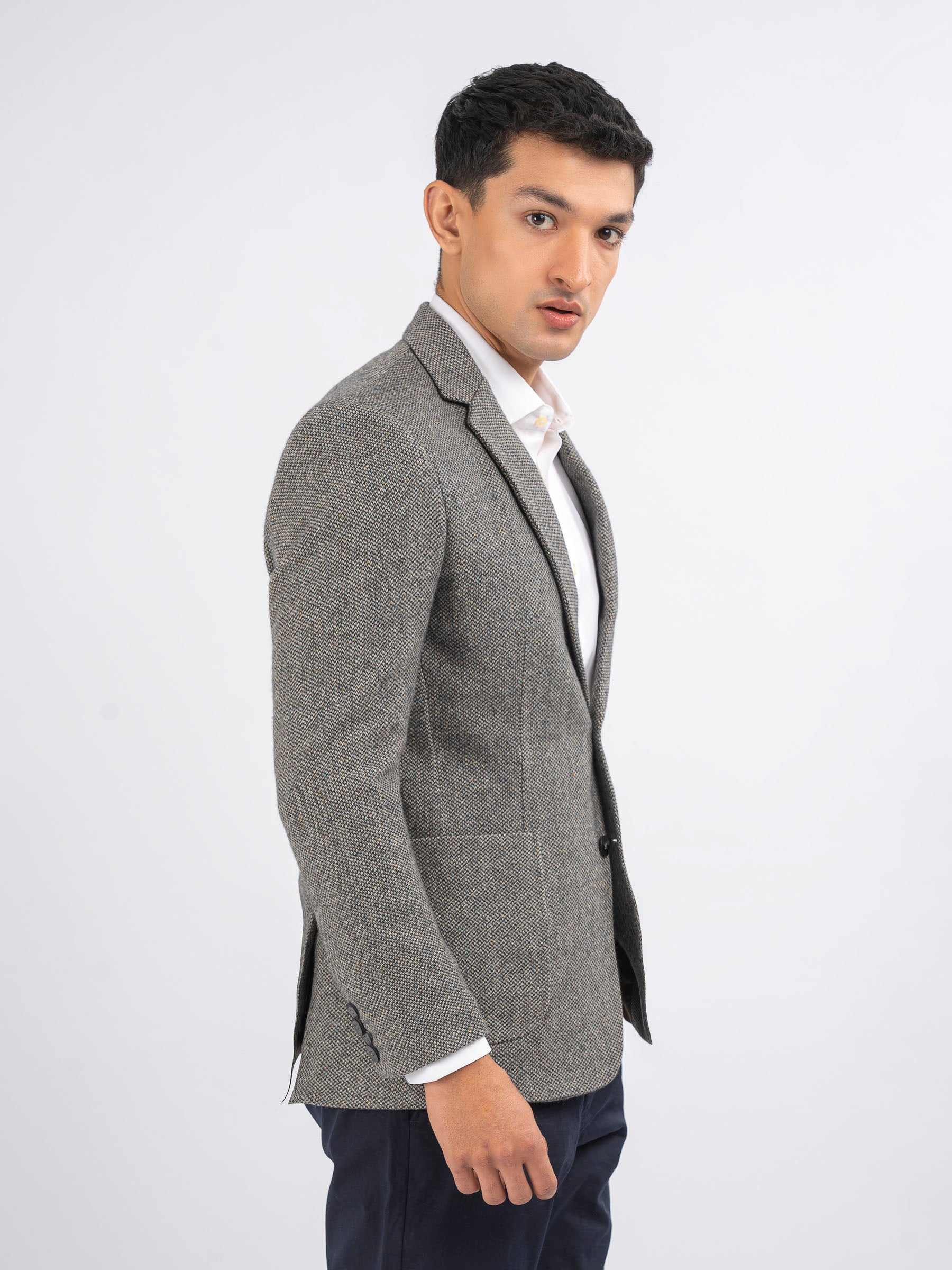 Exclusive mid grey herringbone structured wool blended blazer from FW'24 Collection. Single-breasted jacket with patch pockets carefully cut in high-end wool blended fabric. Designed for man who appreciates well-tailored jacket. Finished in smart casual fit