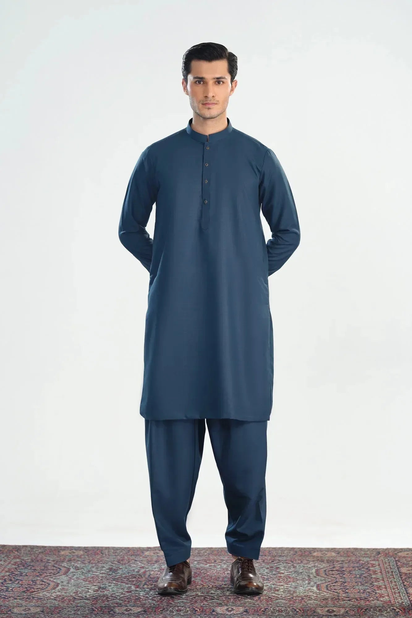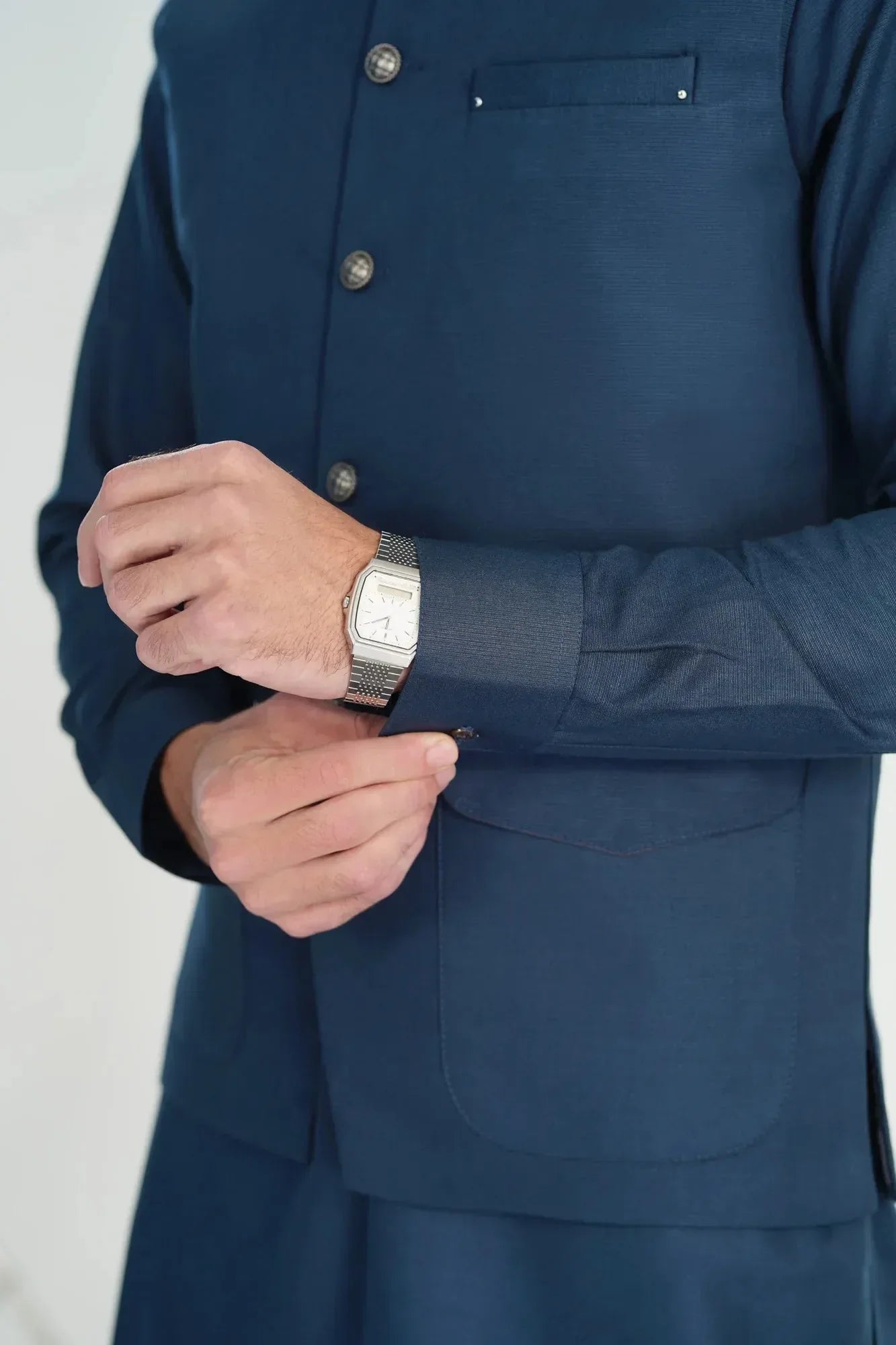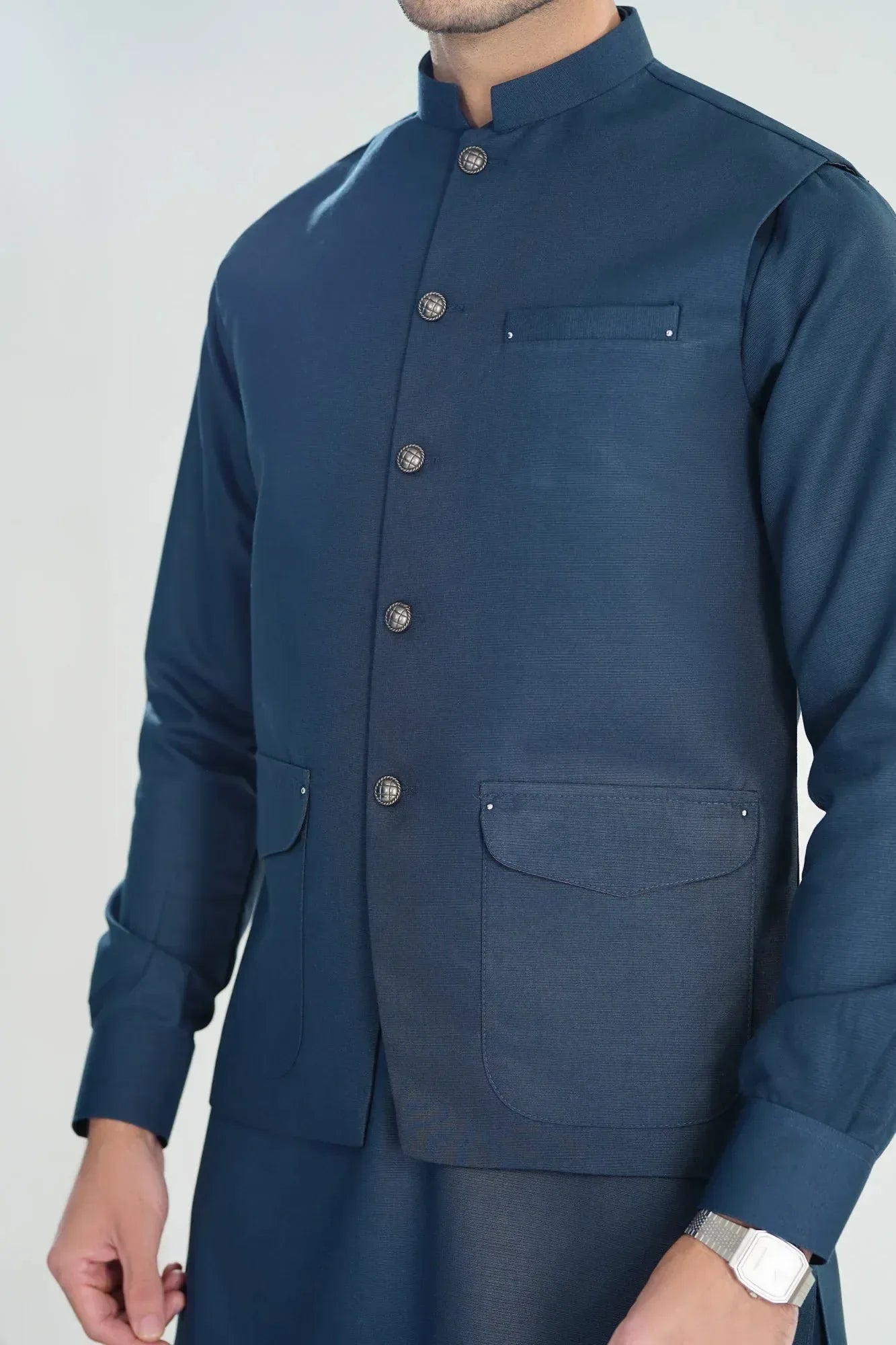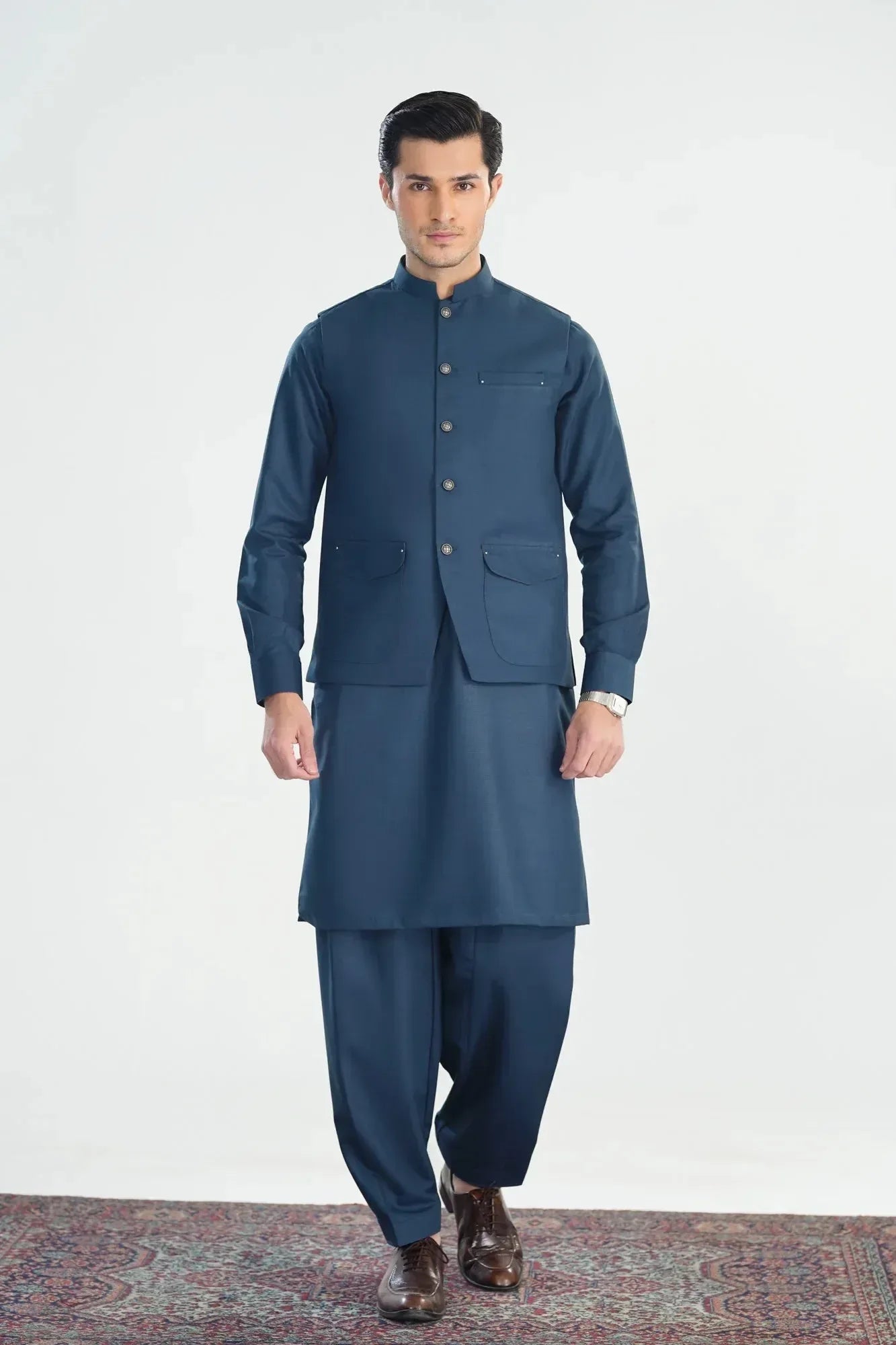 Midnight Blue Kameez Shalwar with Blended Waistcoat - A-Line Cut - Men