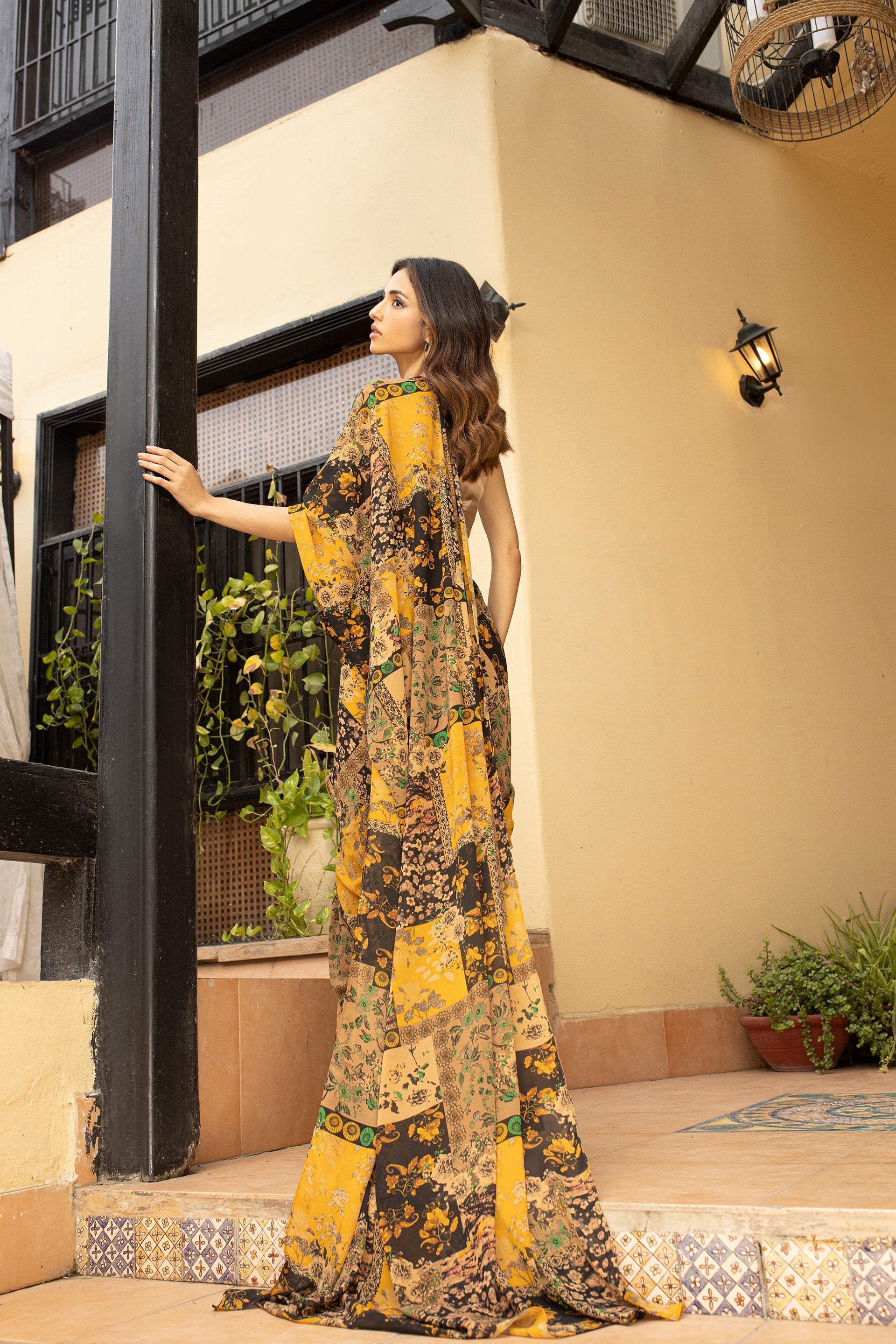 This summer saree is made of a lightweight crepe fabric and adorned with a delightful damask print that runs throughout the garment.