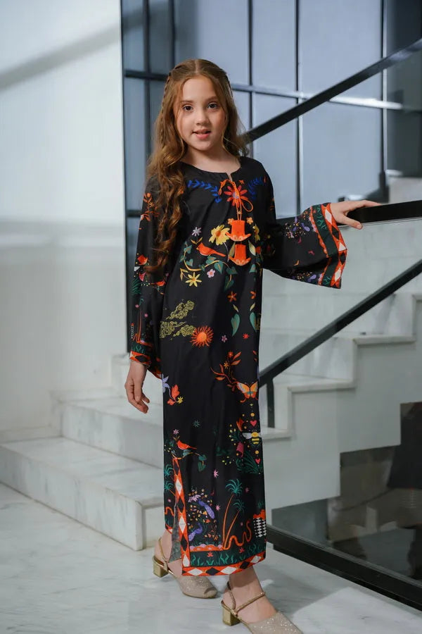 Bold and dramatic, this black kaftan bursts with colorful florals and rich red detailing for a striking evening look.